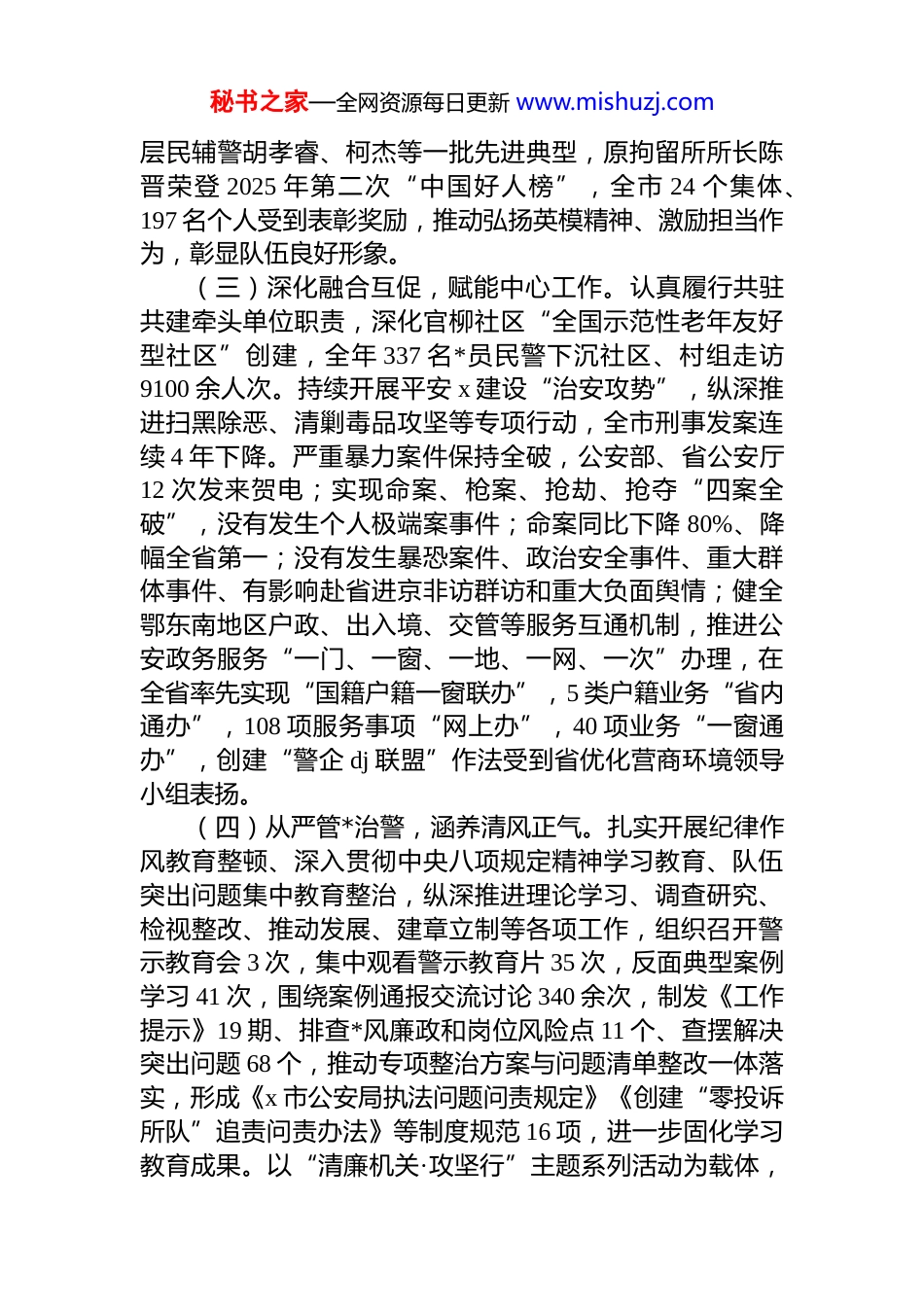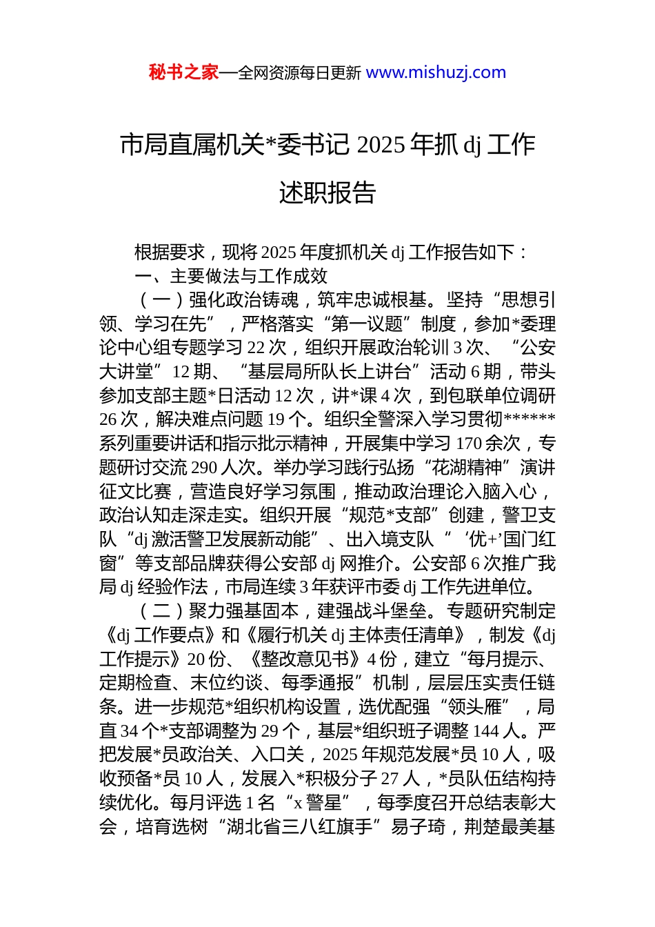 秘书之家—全网资源每日更新 www.mishuzj.com市局直属机关*委书记 2025 年抓 dj 工作述职报告根据要求,现将 2025 年度抓机关 dj 工作报告如下:一、主要做法与工作成效(一)强化政治铸魂,筑牢忠诚根基。坚持“思想引领、学习在先”,严格落实“第一议题”制度,参加*委理论中心组专题学习 22 次,组织开展政治轮训 3 次、“公安大讲堂”12 期、“基层局所队长上讲台”活动 6 期,带头参加支部主题*日活动 12 次,讲*课 4 次,到包联单位调研26 次,解决难点问题 19 个。组织全警深入学习贯彻******系列重要讲话和指示批示精神,开展集中学习 170 余次,专题研讨交流 290 人次。举办学习践行弘扬“花湖精神”演讲征文比赛,营造良好学习氛围,推动政治理论入脑入心,政治认知走深走实。组织开展“规范*支部”创建,警卫支队“dj 激活警卫发展新动能”、出入境支队“‘优+’国门红窗”等支部品牌获得公安部 dj 网推介。公安部 6 次推广我局 dj 经验作法,市局连续 3 年获评市委 dj 工作先进单位。(二)聚力强基固本,建强战斗堡垒。专题研究制定《dj 工作要点》和《履行机关 dj 主体责任清单》,制发《dj工作提示》20 份、《整改意见书》4 份,建立“每月提示、定期检查、末位约谈、每季通报”机制,层层压实责任链条。进一步规范*组织机构设置,选优配强“领头雁”,局直 34 个*支部调整为 29 个,基层*组织班子调整 144 人。严把发展*员政治关、入口关,2025 年规范发展*员 10 人,吸收预备*员 10 人,发展入*积极分子 27 人,*员队伍结构持续优化。每月评选 1 名“x 警星”,每季度召开总结表彰大会,培育选树“湖北省三八红旗手”易子琦,荆楚最美基秘书之家—全网资源每日更新 www.mishuzj.com层民辅警胡孝睿、柯杰等一批先进典型,原拘留所所长陈晋荣登 2025 年第二次“中国好人榜”,全市 24 个集体、197 名个人受到表彰奖励,推动弘扬英模精神、激励担当作为,彰显队伍良好形象。(三)深化融合互促,赋能中心工作。认真履行共驻共建牵头单位职责,深化官柳社区“全国示范性老年友好型社区”创建,全年 337 名*员民警下沉社区、村组走访9100 余人次。持续开展平安 x 建设“治安攻势”,纵深推进扫黑除恶、清剿毒品攻坚等专项行动,全市刑事发案连续 4 年下降。严重暴力案件保持全破,公安部、省公安厅12 次发来贺电;实现命案、枪案、抢劫、抢夺“四案全破”,没有发生个人极端案事件;命案同比下降 80%、降幅全省第一;没有发生暴恐案件、政治安全事件、重大群体事件、有影响赴省进京非访群访和重大负面舆情;健全鄂东南地区户政、出入境、交管等服务互通机制,推进公安政务服务“一门、一窗、一地、一网、一次”办理,在全省率先实现“国籍户籍一窗联办”,5 类户籍业务“省内通办”,108 项服务事项“网上办”,40 项业务“一窗通办”,创建“警企 dj 联盟”作法受到省优化营商环境领导小组表扬。(四)从严管*治警,涵养清风正气。扎实开展纪律作风教育整顿、深入贯彻中央八项规定精神学习教育、队伍突出问题集中教育整治,纵深推进理论学习、调查研究、检视整改、推动发展、建章立制等各项工作,组织召开警示教育会 3 次,集中观看警示教育片 35 次,反面典型案例学习 41 次,围绕案例通报交流讨论 340 余次,制发《工作提示》19 期、排查*风廉政和岗位风险点 11 个、查摆解决突出问题 68 个,推动专项整治方案与问题清单整改一体落实,形成《x 市公安局执法问题问责规定》《创建“零投诉所队”追责问责办法》等制度规范 16 项,进一步固化学习教育成果。以“清廉机关·攻坚行”主题系列活动为载体,秘书之家—全网资源每日更新 www.mishuzj.com建成市看守所廉政教育基地,开展廉政教育 49 批 1614 人次,推动清廉建设与公安工作协同发展。二、存在的主要问题及原因(一)理论指导实践有待加强。部分*员干部对*的政治理论,特别是在学懂弄通做实**************思想上系统深入学习不够,学习形式有待创新,与公安业务融合有待加强,转化成效有待提升。(二)...