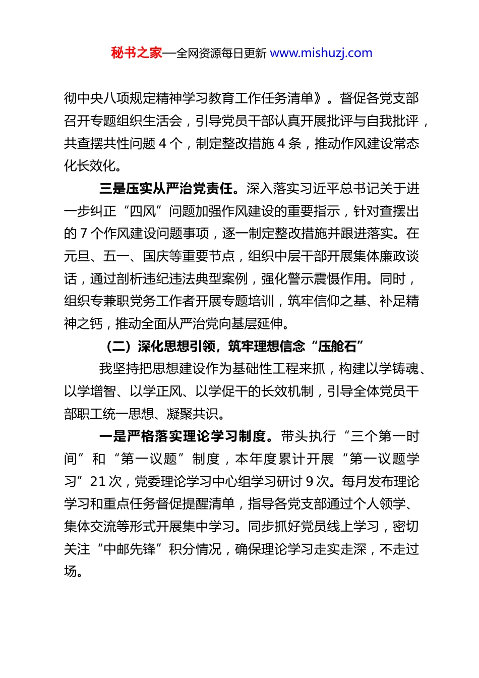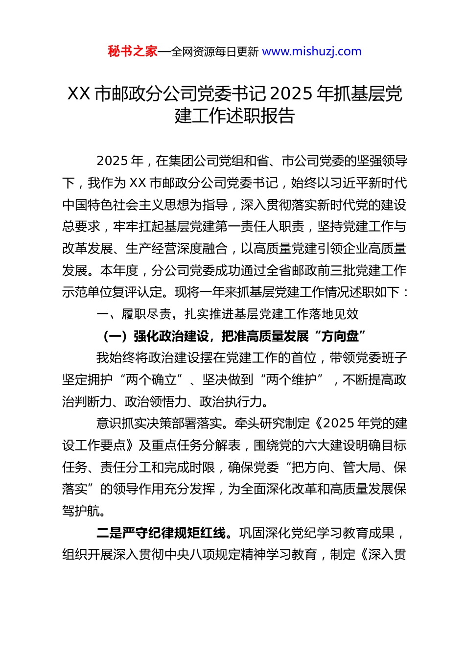 秘书之家—全网资源每日更新 www.mishuzj.comXX 市邮政分公司党委书记 2025 年抓基层党建工作述职报告2025 年,在集团公司党组和省、市公司党委的坚强领导下,我作为 XX 市邮政分公司党委书记,始终以习近平新时代中国特色社会主义思想为指导,深入贯彻落实新时代党的建设总要求,牢牢扛起基层党建第一责任人职责,坚持党建工作与改革发展、生产经营深度融合,以高质量党建引领企业高质量发展。本年度,分公司党委成功通过全省邮政前三批党建工作示范单位复评认定。现将一年来抓基层党建工作情况述职如下:一、履职尽责,扎实推进基层党建工作落地见效(一)强化政治建设,把准高质量发展“方向盘”我始终将政治建设摆在党建工作的首位,带领党委班子坚定拥护“两个确立”、坚决做到“两个维护”,不断提高政治判断力、政治领悟力、政治执行力。意识抓实决策部署落实。牵头研究制定《2025 年党的建设工作要点》及重点任务分解表,围绕党的六大建设明确目标任务、责任分工和完成时限,确保党委“把方向、管大局、保落实”的领导作用充分发挥,为全面深化改革和高质量发展保驾护航。二是严守纪律规矩红线。巩固深化党纪学习教育成果,组织开展深入贯彻中央八项规定精神学习教育,制定《深入贯秘书之家—全网资源每日更新 www.mishuzj.com彻中央八项规定精神学习教育工作任务清单》。督促各党支部召开专题组织生活会,引导党员干部认真开展批评与自我批评,共查摆共性问题 4 个,制定整改措施 4 条,推动作风建设常态化长效化。三是压实从严治党责任。深入落实习近平总书记关于进一步纠正“四风”问题加强作风建设的重要指示,针对查摆出的 7 个作风建设问题事项,逐一制定整改措施并跟进落实。在元旦、五一、国庆等重要节点,组织中层干部开展集体廉政谈话,通过剖析违纪违法典型案例,强化警示震慑作用。同时,组织专兼职党务工作者开展专题培训,筑牢信仰之基、补足精神之钙,推动全面从严治党向基层延伸。(二)深化思想引领,筑牢理想信念“压舱石”我坚持把思想建设作为基础性工程来抓,构建以学铸魂、以学增智、以学正风、以学促干的长效机制,引导全体党员干部职工统一思想、凝聚共识。一是严格落实理论学习制度。带头执行“三个第一时间”和“第一议题”制度,本年度累计开展“第一议题学习”21 次,党委理论学习中心组学习研讨 9 次。每月发布理论学习和重点任务督促提醒清单,指导各党支部通过个人领学、集体交流等形式开展集中学习。同步抓好党员线上学习,密切关注“中邮先锋”积分情况,确保理论学习走实走深,不走过场。秘书之家—全网资源每日更新 www.mishuzj.com二是推动理论学习与实践结合。带领领导班子成员带头深入一线开展调研走访 10 次、组织员工座谈会 5 次,广泛收集意见建议 13 条,切实将理论学习成果转化为推动发展、服务群众的具体举措。用好“四下基层”工作方法,聚焦基层员工和客户的急难愁盼问题,逐一解决落实,让员工感受到组织关怀,让客户体验到邮政温度。三是筑牢意识形态安全防线。制定并下发《2025 年 XX邮政意识形态工作清单》和《2025 年重点关注的意识形态风险点》,明确 5 个方面 65 条工作举措,落实意识形态工作季度会议制度。加强重点领域和网络阵地管理,常态化开展舆情监测和应对处置,扎实推进“扫黄打非”工作,确保意识形态领域安全稳定。(三)夯实组织基础,建强攻坚克难“桥头堡”我坚持大抓基层的鲜明导向,推动组织体系与改革发展同频共振,不断增强基层党组织的凝聚力和战斗力。一是优化党组织设置。根据分公司经营机构调整方案,及时成立运营监控、市场经营党支部,完成寄递经营党支部支委增补工作,实现党组织设置与业务架构同步推进、同步优化,确保党的工作全覆盖、无死角。二是落实党员骨干“双培养”机制。将党员培养成业务骨干,把业务骨干培养成党员,重点关注校招大学生、业务骨干等群体,联合支部定向培养。上半年,成功将 1 名一线骨干秘书之家—全网资源每日更新 www.mishuzj.com吸收为入党积极分子,确认入党申请人 2 名,发展对象 2 名,促进党员和骨干互学互促、...