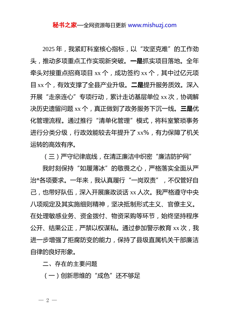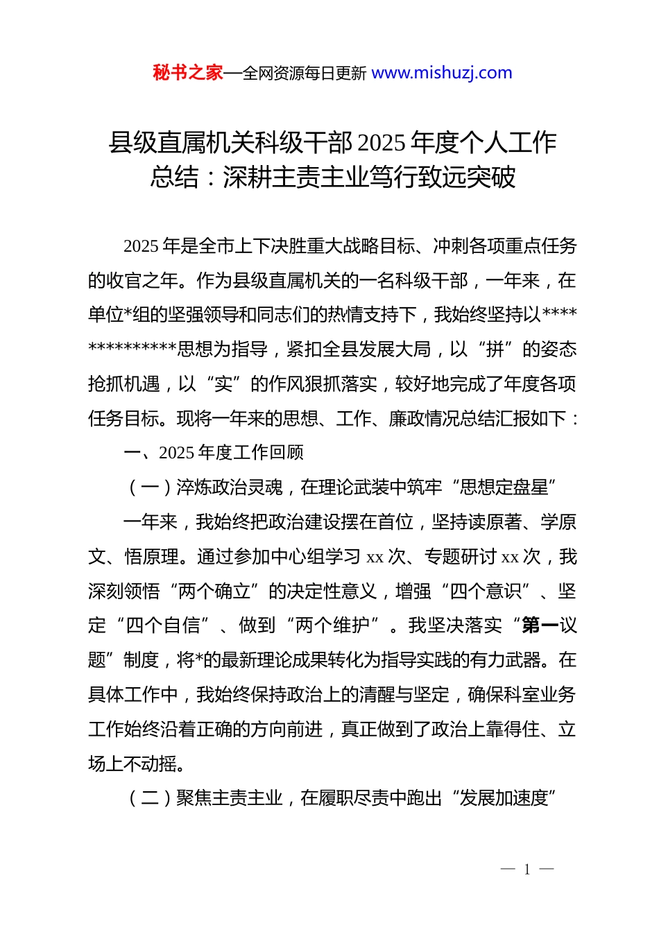 秘书之家—全网资源每日更新 www.mishuzj.com县级直属机关科级干部 2025 年度个人工作总结:深耕主责主业笃行致远突破2025 年是全市上下决胜重大战略目标、冲刺各项重点任务的收官之年。作为县级直属机关的一名科级干部,一年来,在单位*组的坚强领导和同志们的热情支持下,我始终坚持以**************思想为指导,紧扣全县发展大局,以“拼”的姿态抢抓机遇,以“实”的作风狠抓落实,较好地完成了年度各项任务目标。现将一年来的思想、工作、廉政情况总结汇报如下:一、2025 年度工作回顾(一)淬炼政治灵魂,在理论武装中筑牢“思想定盘星”一年来,我始终把政治建设摆在首位,坚持读原著、学原文、悟原理。通过参加中心组学习 xx 次、专题研讨 xx 次,我深刻领悟“两个确立”的决定性意义,增强“四个意识”、坚定“四个自信”、做到“两个维护”。我坚决落实“第一议题”制度,将*的最新理论成果转化为指导实践的有力武器。在具体工作中,我始终保持政治上的清醒与坚定,确保科室业务工作始终沿着正确的方向前进,真正做到了政治上靠得住、立场上不动摇。(二)聚焦主责主业,在履职尽责中跑出“发展加速度”— 1 —秘书之家—全网资源每日更新 www.mishuzj.com2025 年,我紧盯科室核心指标,以“攻坚克难”的工作劲头,推动多项重点工作实现新突破。一是抓实项目落地。全年牵头对接重点招商项目 xx 个,成功签约 xx 个,其中过亿元项目 xx 个,有效支撑了全县产业升级。二是提升服务质效。深入开展“走亲连心”专项行动,累计走访基层单位 xx 次,协调解决历史遗留问题 xx 个,真正做到了政务服务下沉一线。三是优化管理流程。通过推行“清单化管理”模式,将科室繁琐事务进行分类分级,行政效能较去年提升了 xx%,有力保障了机关运转的高效有序。(三)严守纪律底线,在清正廉洁中织密“廉洁防护网”我时刻保持“如履薄冰”的敬畏之心,严格落实全面从严治*各项要求。一年来,我认真履行“一岗双责”,不仅管好自己,也带好队伍,深入开展廉政谈话 xx 人次。我严格遵守中央八项规定及其实施细则精神,坚决抵制形式主义、官僚主义。在处理敏感业务、资金拨付、物资采购等环节,始终坚持程序公开、结果公正,严禁以权谋私。通过参加警示教育 xx 次,我进一步增强了拒腐防变的能力,保持了县级直属机关干部廉洁自律的良好形象。二、存在的主要问题(一)创新思维的“成色”还不够足— 2 —秘书之家—全网资源每日更新 www.mishuzj.com在面对一些深层次的体制机制难题时,存在“路径依赖”倾向。工作中习惯于用老办法解决新问题,对如何利用数字化手段赋能政务管理的研究还不深。在推动某些改革举措时,往往满足于按部就班执行上级指令,缺乏“打破天花板”的魄力。面对 2025 年冲刺阶段的复杂形势,主动求变、识变、应变的意识仍有待进一步提升,未能完全实现管理思维的转型升级。(二)基层调研的“深度”还不够透虽然下基层次数不少,但存在“走马观花”现象,存在“蜻蜓点水”式调研。有时为了完成调研任务而下乡,听取基层负责同志汇报多,与普通群众面对面交流少。对于一些群众反映强烈的急难愁盼问题,虽然做了记录,但后续的跟踪督办和长效机制建设还不够完善。调研成果转化为决策参考的效率还不高,导致部分政策在基层执行过程中出现了“温差”,反映出群众路线走得还不够扎实。(三)业务学习的“韧劲”还不够强在处理日常繁琐事务中,存在“以忙代学”的心理。对于新出台的行业标准和前沿政策,学习往往停留在“知其然”而不知其“所以然”的层面。知识结构更新不够及时,特别是对金融、法治等跨领域知识的储备不足,导致在面对跨部门协作和综合性问题时,思考问题的维度还不够宽。学习的系统性和— 3 —秘书之家—全网资源每日更新 www.mishuzj.com持久性不强,缺乏“挤”和“钻”的精神,制约了个人职业素养向更高层次迈进。三、下一步工作计划(一)坚持谋划在前,当好战略开局的“领航员”2026 年是新篇章的启航之年。我将立足县级机关职责,超前谋划年度重点任务清单。首先,要建立“专班推进”机制,针对 2026 年首季...