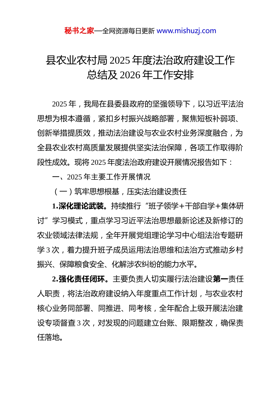 秘书之家—全网资源每日更新 www.mishuzj.com县农业农村局 2025 年度法治政府建设工作总结及 2026 年工作安排 2025 年,我局在县委县政府的坚强领导下,以习近平法治思想为根本遵循,紧扣乡村振兴战略部署,聚焦短板补弱项、创新举措提质效,推动法治建设与农业农村业务深度融合,为全县农业农村高质量发展提供坚实法治保障,各项工作取得阶段性成效。现将 2025 年度法治政府建设开展情况报告如下:一、2025 年主要工作开展情况(一)筑牢思想根基,压实法治建设责任1.深化理论武装。持续推行“班子领学+干部自学+集体研讨”学习模式,重点学习习近平法治思想最新论述及新修订的农业领域法律法规,全年开展党组理论学习中心组法治专题研学 3 次,着力提升班子成员运用法治思维和法治方式推动乡村振兴、保障粮食安全、化解涉农纠纷的能力水平。2.强化责任闭环。主要负责人切实履行法治建设第一责任人职责,将法治政府建设纳入年度重点工作计划,与农业农村核心业务同部署、同推进、同考核,全年配合上级开展法治建设专项督查 3 次,对发现的问题建立台账、限期整改,确保责任落地。秘书之家—全网资源每日更新 www.mishuzj.com3.规范决策机制。优化党组会议、局务会议议事规则,进一步细化“三重一大”事项决策流程,明确法治审核前置要求;对全局性政策制定、重大项目审批等事项,均由法律顾问出具合法性审查意见,确保决策合法合规、科学民主。(二)聚焦提质增效,提升依法治理能力4.完善制度体系。主动参与省、市、县农业领域地方性法规规章及规范性文件修订征求意见工作;全面梳理 2025 年以前行政规范性文件,对其中 11 件规范性文件提出清理建议,并上报主管部门。5.严格执法规范。持续深化行政执法“三项”制度落实,优化执法全过程记录设备配置,实现执法现场记录全覆盖;完善法制审核流程,对所有行政处罚案件实行“法律顾问初审+集体研讨复核”,全年出具合法性审查意见书 74 份,确保执法行为公正文明。6.强化法律顾问作用。继续聘请法律顾问,拓展法律顾问服务范围,新增农业纠纷调解、合法性审查等内容;针对土地确权登记、农业项目招投标等疑难问题,组织法律顾问开展专题会商 18 次,为农业发展提供专业法律支撑。(三)深化改革创新,提升营商环境法治化水平7.强化信用体系建设。建立健全“双公示”台账,始终坚秘书之家—全网资源每日更新 www.mishuzj.com持“双公示”数据日收集、周发布制度,做到应发尽发;推行“信用分级+一业一查”联合监管,随机抽查 25 家企业,检查结果公示率 100%。截至目前共在“信用安徽”发布行政许可460 余条、行政处罚等各类信息 75 条;发布信用信息数篇,窗口现场办结率、群众满意率保持 100%。全面推行信用修复“三书同达”工作机制,2025 年共送达信用合规提示书 12 份。8.优化行政审批服务。以法律法规为依据,动态调整权责清单,严格落实首问负责、服务承诺等制度,梳理行政审批容缺受理清单 20 项、包容审慎行政处罚清单 13 项,最大限度便民利企,将优化营商环境落到实处。9.推动监管新模式。积极推行“综合查一次”联合执法机制,推进“双随机、一公开”、“综合查一次”等工作有机结合,落实企业“安静生产日”制度,以“减扰增效、精准服务”为核心,建立执法检查提前报备、清单管理机制,对确需开展的紧急检查实行“一次告知、综合施策”,避免碎片化干扰。同时将年度涉农检查事项归总,梳理涉企行政检查事项清单 22 项,优化涉农执法方式,将政策宣讲、技术指导与必要检查相结合,做到“进一次门、查多项事、一次到位”。粗略统计 2025 年执法检查频次同比下降 51%,出动执法检查人员同比下降 47%,检查生产经营主体同比下降 52%。秘书之家—全网资源每日更新 www.mishuzj.com(四)聚焦重点领域,筑牢农业法治防线10.深化禁捕执法监管。持续整合公安、农业农村和水利等部门执法力量,及时补充长江、菜子湖四个联合执法中队力量,下沉执法人员,紧盯重点水域、紧守重点时段,相继开展春季护渔区域会战、打击长江刀鲚非法捕捞和清网等专项整治行动,加大巡查力度和夜间...