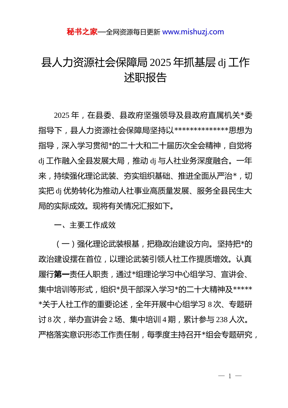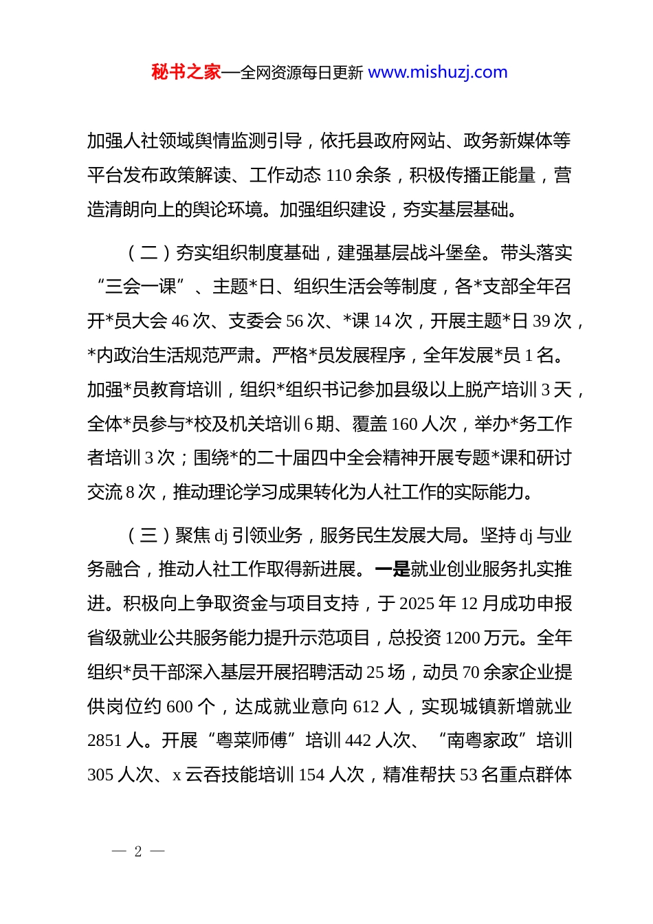 秘书之家—全网资源每日更新 www.mishuzj.com县人力资源社会保障局 2025 年抓基层 dj 工作述职报告2025 年,在县委、县政府坚强领导及县政府直属机关*委指导下,县人力资源社会保障局坚持以**************思想为指导,深入学习贯彻*的二十大和二十届历次全会精神,自觉将dj 工作融入全县发展大局,推动 dj 与人社业务深度融合。一年来,持续强化理论武装、夯实组织基础、推进全面从严治*,切实把 dj 优势转化为推动人社事业高质量发展、服务全县民生大局的实际成效。现将有关情况汇报如下。一、主要工作成效(一)强化理论武装根基,把稳政治建设方向。坚持把*的政治建设摆在首位,以理论武装引领人社工作提质增效。认真履行第一责任人职责,通过*组理论学习中心组学习、宣讲会、集中培训等形式,组织*员干部深入学习*的二十大精神及******关于人社工作的重要论述,全年开展中心组学习 8 次、专题研讨 8 次,举办宣讲会 2 场、集中培训 4 期,累计参与 238 人次。严格落实意识形态工作责任制,每季度主持召开*组会专题研究,— 1 —秘书之家—全网资源每日更新 www.mishuzj.com加强人社领域舆情监测引导,依托县政府网站、政务新媒体等平台发布政策解读、工作动态 110 余条,积极传播正能量,营造清朗向上的舆论环境。加强组织建设,夯实基层基础。(二)夯实组织制度基础,建强基层战斗堡垒。带头落实“三会一课”、主题*日、组织生活会等制度,各*支部全年召开*员大会 46 次、支委会 56 次、*课 14 次,开展主题*日 39 次,*内政治生活规范严肃。严格*员发展程序,全年发展*员 1 名。加强*员教育培训,组织*组织书记参加县级以上脱产培训 3 天,全体*员参与*校及机关培训 6 期、覆盖 160 人次,举办*务工作者培训 3 次;围绕*的二十届四中全会精神开展专题*课和研讨交流 8 次,推动理论学习成果转化为人社工作的实际能力。(三)聚焦 dj 引领业务,服务民生发展大局。坚持 dj 与业务融合,推动人社工作取得新进展。一是就业创业服务扎实推进。积极向上争取资金与项目支持,于 2025 年 12 月成功申报省级就业公共服务能力提升示范项目,总投资 1200 万元。全年组织*员干部深入基层开展招聘活动 25 场,动员 70 余家企业提供岗位约 600 个,达成就业意向 612 人,实现城镇新增就业2851 人。开展“粤菜师傅”培训 442 人次、“南粤家政”培训305 人次、x 云吞技能培训 154 人次,精准帮扶 53 名重点群体— 2 —秘书之家—全网资源每日更新 www.mishuzj.com实现就业。二是 dj 品牌建设成效显著。打造“服务升温产业生金——x 云吞‘小支点’撬动富民大梦想”dj 项目,先后荣获县第三届“竹乡杯”工作创新大赛一等奖、第四届市“西江杯”工作创新大赛三等奖。2025 年 10 月,在 x 区成功举办 x 县第二届云吞美食文化推介会,创新采用“地标点亮+名人代言+融媒体矩阵”宣传模式,在 x 塔循环播放主题灯光秀,提升 x云吞公共品牌区域影响力。三是社会保障网持续织密。开展“社保进万家”宣讲 11 场,覆盖群众 1500 人次,发放宣传资料 1800 份。企业职工养老、失业、工伤保险参保人数分别达2.88 万、2.23 万、3.81 万人。加强社保基金监管,筑牢安全防线。四是人才队伍建设稳步推进。规范开展事业单位招聘,全年录用 324 人,充实基层工作力量。五是劳动关系保持和谐稳定。强化监察执法与仲裁调解协同,检查用人单位 167 家,为726 名劳动者追回工资 1105 万元;劳动人事争议调解成功率87.98%,全年 248 件案件全部结案。(四)深化纪律作风建设,涵养清正政治生态。一是压实主体责任,统筹推进部署。认真落实*风廉政建设主体责任,每季度召开*组会研究部署工作,确保*风廉政建设与人社业务工作同谋划、同推进、同落实。二是深化作风建设,纠治“四— 3 —秘书之家—全网资源每日更新 www.mishuzj.com风”顽疾。在节假日前对各股室中心全覆盖开展纪律督查、廉洁警示,切实强化作风纪律约束,筑牢节前廉政防线;严格落实中央八项规定及其实施细则精神,规范公务用车、...