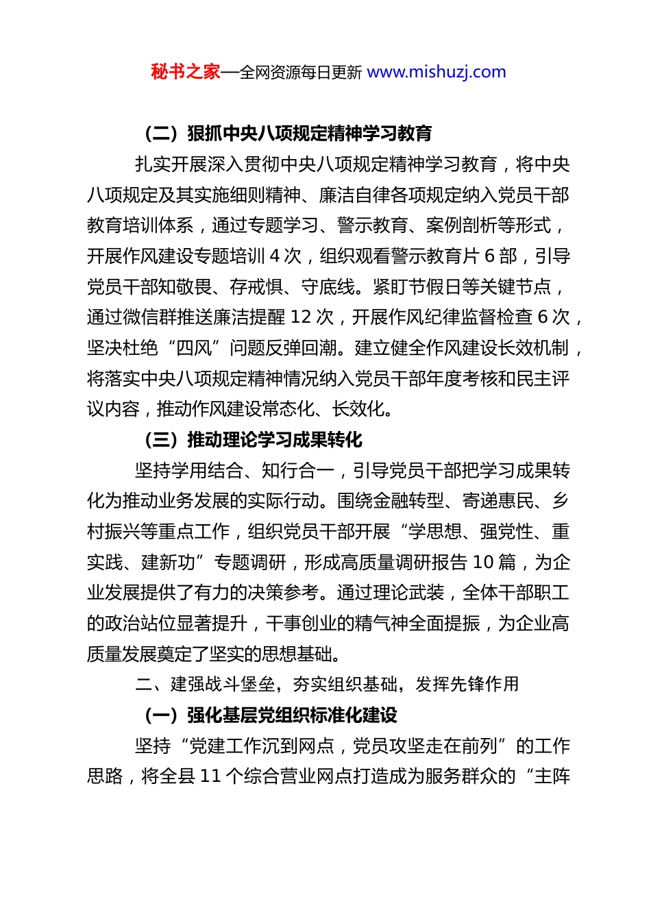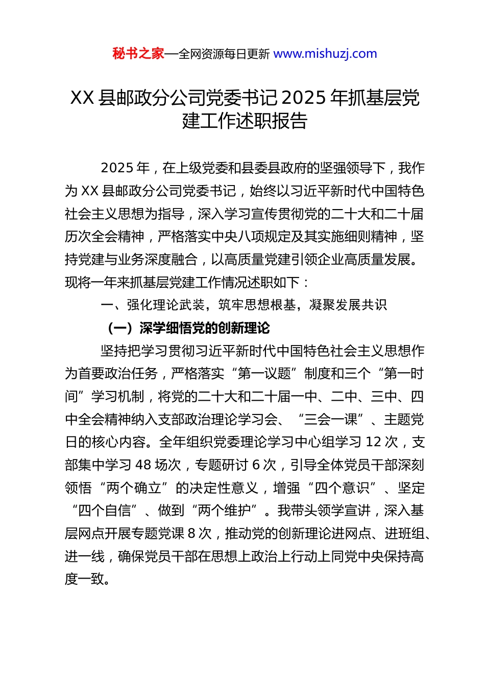秘书之家—全网资源每日更新 www.mishuzj.comXX 县邮政分公司党委书记 2025 年抓基层党建工作述职报告2025 年,在上级党委和县委县政府的坚强领导下,我作为 XX 县邮政分公司党委书记,始终以习近平新时代中国特色社会主义思想为指导,深入学习宣传贯彻党的二十大和二十届历次全会精神,严格落实中央八项规定及其实施细则精神,坚持党建与业务深度融合,以高质量党建引领企业高质量发展。现将一年来抓基层党建工作情况述职如下:一、强化理论武装,筑牢思想根基,凝聚发展共识(一)深学细悟党的创新理论坚持把学习贯彻习近平新时代中国特色社会主义思想作为首要政治任务,严格落实“第一议题”制度和三个“第一时间”学习机制,将党的二十大和二十届一中、二中、三中、四中全会精神纳入支部政治理论学习会、“三会一课”、主题党日的核心内容。全年组织党委理论学习中心组学习 12 次,支部集中学习 48 场次,专题研讨 6 次,引导全体党员干部深刻领悟“两个确立”的决定性意义,增强“四个意识”、坚定“四个自信”、做到“两个维护”。我带头领学宣讲,深入基层网点开展专题党课 8 次,推动党的创新理论进网点、进班组、进一线,确保党员干部在思想上政治上行动上同党中央保持高度一致。秘书之家—全网资源每日更新 www.mishuzj.com(二)狠抓中央八项规定精神学习教育扎实开展深入贯彻中央八项规定精神学习教育,将中央八项规定及其实施细则精神、廉洁自律各项规定纳入党员干部教育培训体系,通过专题学习、警示教育、案例剖析等形式,开展作风建设专题培训 4 次,组织观看警示教育片 6 部,引导党员干部知敬畏、存戒惧、守底线。紧盯节假日等关键节点,通过微信群推送廉洁提醒 12 次,开展作风纪律监督检查 6 次,坚决杜绝“四风”问题反弹回潮。建立健全作风建设长效机制,将落实中央八项规定精神情况纳入党员干部年度考核和民主评议内容,推动作风建设常态化、长效化。(三)推动理论学习成果转化坚持学用结合、知行合一,引导党员干部把学习成果转化为推动业务发展的实际行动。围绕金融转型、寄递惠民、乡村振兴等重点工作,组织党员干部开展“学思想、强党性、重实践、建新功”专题调研,形成高质量调研报告 10 篇,为企业发展提供了有力的决策参考。通过理论武装,全体干部职工的政治站位显著提升,干事创业的精气神全面提振,为企业高质量发展奠定了坚实的思想基础。二、建强战斗堡垒,夯实组织基础,发挥先锋作用(一)强化基层党组织标准化建设坚持“党建工作沉到网点,党员攻坚走在前列”的工作思路,将全县 11 个综合营业网点打造成为服务群众的“主阵秘书之家—全网资源每日更新 www.mishuzj.com地”。严格按照党组织标准化建设要求,规范支部设置,配齐配强支部班子,选优配强支部书记,推动基层党组织全面进步、全面过硬。健全完善“三会一课”、组织生活会、民主评议党员等制度,全年召开组织生活会 12 次,开展民主评议党员工作 1 次,党员参与率达 100%。加强党员队伍建设,严格党员发展标准,全年发展新党员 3 名,培养入党积极分子 5 名,为党组织注入了新鲜血液。(二)发挥领导班子带头引领作用党委领导班子带头践行“1+1+5”转型策略,以新打法新策略、新模式、新合规加快代理金融转型步伐。班子成员分片包联基层网点,带头深入一线解决实际问题,全年累计下基层调研指导 60 余人次,帮助网点解决金融营销、寄递服务、客户维护等方面的难题 30 余个。在班子成员的示范带动下,基层党组织的战斗堡垒作用和党员的先锋模范作用得到充分发挥,形成了上下同心、攻坚克难的良好局面。(三)推动党员攻坚在一线聚焦企业发展重点难点任务,成立党员先锋队、党员突击队,引导党员在关键时刻冲得上去、危难关头豁得出来。在“快递进村”工程中,党员带头冲锋在前,积极对接乡镇政府,引入极兔、申通、韵达三家社会快递公司,完成冯庄、长智两个中心乡镇的建设工作,实现邮快合作建制村覆盖率 96%,综合便民服务站全覆盖。在金融转型、农产品寄递、绿色邮政建秘书之家—全网资源每日更新 www.mishuzj.com设等重点工作中...