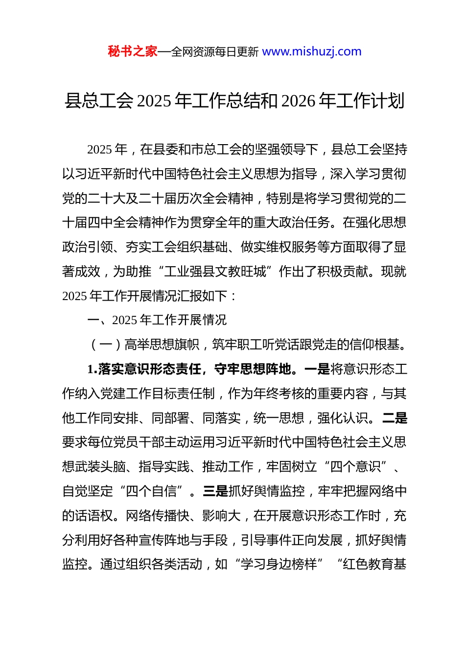 秘书之家—全网资源每日更新 www.mishuzj.com县总工会 2025 年工作总结和 2026 年工作计划 2025 年,在县委和市总工会的坚强领导下,县总工会坚持以习近平新时代中国特色社会主义思想为指导,深入学习贯彻党的二十大及二十届历次全会精神,特别是将学习贯彻党的二十届四中全会精神作为贯穿全年的重大政治任务。在强化思想政治引领、夯实工会组织基础、做实维权服务等方面取得了显著成效,为助推“工业强县文教旺城”作出了积极贡献。现就2025 年工作开展情况汇报如下:一、2025 年工作开展情况(一)高举思想旗帜,筑牢职工听党话跟党走的信仰根基。1.落实意识形态责任,守牢思想阵地。一是将意识形态工作纳入党建工作目标责任制,作为年终考核的重要内容,与其他工作同安排、同部署、同落实,统一思想,强化认识。二是要求每位党员干部主动运用习近平新时代中国特色社会主义思想武装头脑、指导实践、推动工作,牢固树立“四个意识”、自觉坚定“四个自信”。三是抓好舆情监控,牢牢把握网络中的话语权。网络传播快、影响大,在开展意识形态工作时,充分利用好各种宣传阵地与手段,引导事件正向发展,抓好舆情监控。通过组织各类活动,如“学习身边榜样”“红色教育基秘书之家—全网资源每日更新 www.mishuzj.com地参观”等,激发党员干部和群众的思想共鸣,进一步增强凝聚力和向心力。2.强化理论武装,筑牢思想建设基石。一是高度重视党员学习教育,将主题教育学习作为党组首要政治任务,深入学习习近平新时代中国特色社会主义思想和党的二十届历次全会精神,进一步坚定捍卫“两个确立”,做到“两个维护”的思想自觉、政治自觉、行动自觉。二是多层次推进学习走深走实,围绕第一议题、主题教育、党内制度、党风廉政建设等方面,制定年度学习计划,组织开展集中学习 12 次,党组成员结合实际工作讲微党课 4 次。三是多形式助力学习入脑入心,组织到**市廉政文化雕塑园、**等参观学习、开展深入贯彻中央八项规定精神学习教育实践活动和全县基层工会干部理论学习培训班活动等,进一步筑牢反腐倡廉思想根基。(二)聚焦服务大局,点燃职工建功高质量发展的奋斗引擎。1.大力培树劳模工匠。一是弘扬劳模精神、劳动精神、工匠精神,成功推荐湖南省先进工作者 1 人,省劳动模范 1 人,**市先进工作者 1 人,市劳动模范 5 人。二是加强技术培训。11月上旬,在**村、**村组织开展两期“一户一产业”包装培训,农村富余劳动力、城镇失业人员、脱贫户家庭成员、等群体秘书之家—全网资源每日更新 www.mishuzj.com140 人参加培训,培训通过率 100%,成功帮助 135 人实现稳定就业,5 名学员自主创业。2025 年联合多部门开展安全生产事故调查 2 起。三是关心劳模工匠。“迎新春慰问劳模”活动共走访慰问国、省、市、县四级劳模代表 13 人,发放慰问金及物资 3 万余元。开展庆祝“五一”活动,走访慰问劳模、先进工作者及一线职工 10 人,发放慰问金 2 万元。开展劳模生活状态摸底调查工作,为 10 名劳模申报了生活困难和特殊困难补助金。组织 4 名省劳模赴云南、杭州参加疗休养活动。组织 50 名技术工人赴疗休养基地开展活动。2.精心组织技能竞赛。为推动**特色美食文化的传承创新,助力县域经济高质量发展,12 月 25 日,**县首届厨师中式烹饪劳动职业技能竞赛在云集大酒店举行,来自全县各餐饮企业烹饪精英同台竞技,角逐“**乡厨大师”“**乡村名厨”“**名菜”荣誉。王诚兵等 10 人斩获“**乡村名厨”称号,王勇等 10人获评“**乡厨大师”,“牛气冲天”等 18 道特色菜品成功入选“**名菜”。(三)强化维权服务,构建职工共建共享的和谐关系。1.深入推进维权服务。一是开展“春季要约行动”,推进集体合同签订和工资协商。2025 年,全县行业性工资集体协议涵盖企业总数 37 家,涵盖职工 1215 人,区域性涵盖 156 家企秘书之家—全网资源每日更新 www.mishuzj.com业,涵盖职工 6428 人,百人以上单个企业签订工资集体协议 59家,涵盖职工 4129 人。同时,进企业开展春节工资集体协商会议,拍摄宣传片推广经验。二是“工...