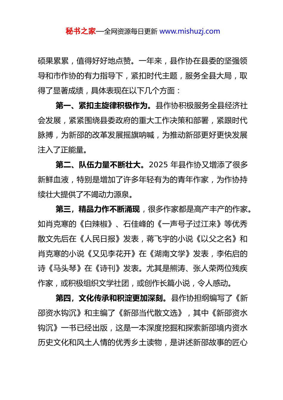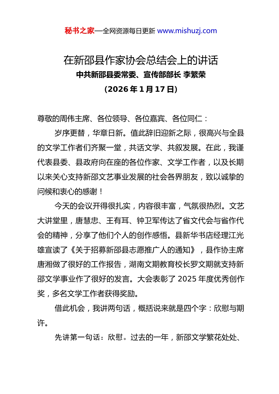 秘书之家—全网资源每日更新 www.mishuzj.com在新邵县作家协会总结会上的讲话中共新邵县委常委、宣传部部长 李繁荣(2026 年 1 月 17 日)尊敬的周伟主席、各位领导、各位嘉宾、各位同仁: 岁序更替,华章日新。值此辞旧迎新之际,很高兴与全县的文学工作者们齐聚一堂,共话文学、共叙发展。在此,我谨代表县委、县政府向在座的各位作家、文学工作者,以及长期以来关心支持新邵文艺事业发展的社会各界朋友,致以诚挚的问候和衷心的感谢! 今天的会议开得很扎实,内容很丰富,气氛很热烈。文艺大讲堂里,唐慧忠、王有耳、钟卫军传达了省文代会与省作代会的精神,分享了他们个人的创作感悟。县新华书店经理江光雄宣读了《关于招募新邵县志愿推广人的通知》,县作协主席唐湘做了很好的工作报告,湖南文期教育校长罗文期就支持新邵文学事业作了很好的发言。大会表彰了 2025 年度优秀创作奖,多名文学工作者获得奖励。 借此机会,我讲两句话,概括说来就是四个字:欣慰与期许。 先讲第一句话:欣慰。过去的一年,新邵文学繁花处处、秘书之家—全网资源每日更新 www.mishuzj.com硕果累累,值得好好地点赞。一年来,县作协在县委的坚强领导和市作协的有力指导下,紧扣时代主题,服务全县大局,取得了显著成绩,具体表现在以下几个方面: 第一、紧扣主旋律积极作为。县作协积极服务全县经济社会发展,紧紧围绕县委政府的重大工作决策和部署,紧跟时代脉搏,为新邵的改革发展摇旗呐喊,为推动新邵更好更快发展注入了正能量。 第二、队伍力量不断壮大。2025 年县作协又增添了很多新鲜血液,特别是增加了许多年轻有为的青年作家,为作协持续壮大提供了不竭动力源泉。 第三,精品力作不断涌现,很多作家都是高产丰产的作家。如肖克寒的《白辣椒》、石佳峰的《一声号子过江来》等优秀散文先后在《人民日报》发表,蒋飞宇的小说《以父之名》和肖克寒的小说《又见李花开》在《湖南文学》发表,李佑启的诗《马头琴》在《诗刊》发表。尤其是熊涛、张人荣两位残疾作家,或积极组织文学社团,或创作长篇小说,令人感动。 第四,文化传承和积淀更加深刻。县作协担纲编写了《新邵资水钩沉》和主编了《新邵当代散文选》,其中《新邵资水钩沉》一书已经出版,这是一本深度挖掘和探索新邵境内资水历史文化和风土人情的优秀乡土读物,是讲述新邵故事的匠心秘书之家—全网资源每日更新 www.mishuzj.com之作;《新邵当代散文选》即将公开出版,该书围绕新邵县经济社会发展、风景名胜、文化名人、风土人情、风物特产等题材,收集了新邵建县以来近百名作家创作的百余篇散文,是深层次展现新邵风采、树立新邵形象的重要窗口。这种讲好新邵故事,传承新邵历史文化的重要工作,历史意义和现实意义都非常巨大,需要我们一代一代地不遗余力地去推动。在这方面,县作协积极作为,取得的成绩有目共睹。在此,我代表县委、政府,向作协的各位作家们表示衷心的感谢。 第五,社会影响力不断扩大。今天,市作协周伟主席亲自莅临现场指导,对新邵县作协既往的成绩给予了高度评价和肯定,每一句话都是鼓励和鞭策。我相信,我们在座的每一位作家,都会把周伟主席的讲话精神入耳入心,并在下一步的创作中,锚定新起点,注入新动力,取得新的更大的成绩。 再讲第二句话:期许。 新的一年已经来临。转眼就是春季,春季是播种的季节,也是充满生机的季节。2026 年,新邵作协如何进一步开展好工作、取得更好更多成绩,是在座每位作家都应该好好思考的问题。借此机会,我对县作协 2026 年的工作提几点希望。 一要锚定方向。县作协是我县文艺战线的重要力量,各位作为记录时代、书写家乡的“笔杆子”,要深入学习贯彻习近秘书之家—全网资源每日更新 www.mishuzj.com平文化思想,紧紧围绕县委政府工作大局,多关注新邵发展的火热实践。今年我县作为第五届邵阳旅游发展大会承办单位,希望大家能按照“文艺+旅游”的思路,积极为全县重点景区做概念、做文章,通过文化故事渲染、文艺作品呈现,打造新邵的文化之旅、情怀之旅、康养之旅。二要深耕本土。2025 年新邵获评第八届全国文明城市提名城市,“村光大...