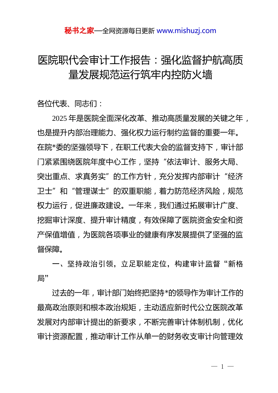 秘书之家—全网资源每日更新 www.mishuzj.com医院职代会审计工作报告:强化监督护航高质量发展规范运行筑牢内控防火墙各位代表、同志们:2025 年是医院全面深化改革、推动高质量发展的关键之年,也是提升内部治理能力、强化权力运行制约监督的重要一年。在院*委的坚强领导下,在职工代表大会的监督支持下,审计部门紧紧围绕医院年度中心工作,坚持“依法审计、服务大局、突出重点、求真务实”的工作方针,充分发挥内部审计“经济卫士”和“管理谋士”的双重职能,着力防范经济风险,规范权力运行,促进廉政建设。一年来,我们通过拓展审计广度、挖掘审计深度、提升审计精度,有效保障了医院资金安全和资产保值增值,为医院各项事业的健康有序发展提供了坚强的监督保障。一、坚持政治引领,立足职能定位,构建审计监督“新格局”过去的一年,审计部门始终把坚持*的领导作为审计工作的最高政治原则和根本政治规矩,主动适应新时代公立医院改革发展对内部审计提出的新要求,不断完善审计体制机制,优化审计资源配置,推动审计工作从单一的财务收支审计向管理效— 1 —秘书之家—全网资源每日更新 www.mishuzj.com益审计转型,初步构建起集中统一、全面覆盖、权威高效的审计监督体系。(一)完善顶层设计,夯实审计制度“压舱石”制度建设是规范审计行为、提升审计质量的基础。我们结合国家卫健委关于加强公立医院内部审计工作的相关规定以及医院实际运行情况,对医院原有的内审制度进行了全面的梳理和修订。一是修订完善审计章程。重新界定了内部审计的职能权限、工作程序和责任追究机制,进一步明确了审计委员会的领导职责,确保审计工作有法可依、有章可循。二是建立审计整改联动机制。出台了《医院审计整改工作管理办法》,明确了被审计科室主要负责人为整改第一责任人,建立了审计部门与纪检监察、组织人事、财务等部门的协作机制,形成了监督合力,解决了长期以来“屡审屡犯”的顽疾。三是规范委托社会审计管理。针对医院工程项目多、专业性强的情况,制定了《社会中介机构选聘及考核管理办法》,强化对第三方审计机构的准入审核、过程监管和质量考评,有效防范了外包风险,确保了审计结果的客观公正。(二)统筹计划管理,织密审计覆盖“监督网”我们坚持“全面覆盖、突出重点”的原则,科学编制年度审计项目计划,确保审计监督无死角、无盲区。首先,大幅提— 2 —秘书之家—全网资源每日更新 www.mishuzj.com升审计项目覆盖面。全年共完成各类审计项目 xx 项,其中财务收支审计 xx 项,基建修缮工程结算审计 xx 项,物资采购及合同审计 xx 项,经济责任审计 xx 项,专项调查审计 xx 项。其次,强化关键环节管控。将审计触角向事前、事中延伸,重点加强了对年度预算执行、重大项目招投标、高值医用耗材管理等高风险领域的跟踪审计,及时发现并纠正偏差,实现了由“事后算账”向“事前防范、事中控制”的转变。最后,有效整合审计资源。通过“内审人员+外聘专家+职能部门骨干”的混合编组模式,解决了审计力量不足与审计任务繁重之间的矛盾,全年共提出审计建议 xx 条,被采纳 xx 条,促进增收节支 xx 万元,审计监督的震慑作用和建设性作用得到有效发挥。(三)聚焦队伍建设,锻造素质过硬“特种兵”审计质量的提升离不开高素质的专业队伍。我们高度重视审计人员的能力建设,致力于打造一支政治过硬、业务精通、作风优良的“审计铁军”。一方面,强化政治理论学习。深入学习贯彻上级关于审计工作的****批示精神,增强审计人员的政治敏锐性和政治鉴别力,确保审计工作始终沿着正确的方向前进。另一方面,提升专业胜任能力。采取“走出去、请进来”的方式,组织审计人员参加卫健系统内审业务培训 xx 人次,鼓励在职人员考取 cia(国际注册内部审计师)、cpa(注册会— 3 —秘书之家—全网资源每日更新 www.mishuzj.com计师)等执业资格,并在实际项目中开展“以审代训”,着力提升审计人员运用大数据分析、查核复杂账务、综合研判问题的能力。二、聚焦重点领域,深化过程管控,打好资金安全“保卫战”资金是医院运行的血液,工程和采购是医院支...