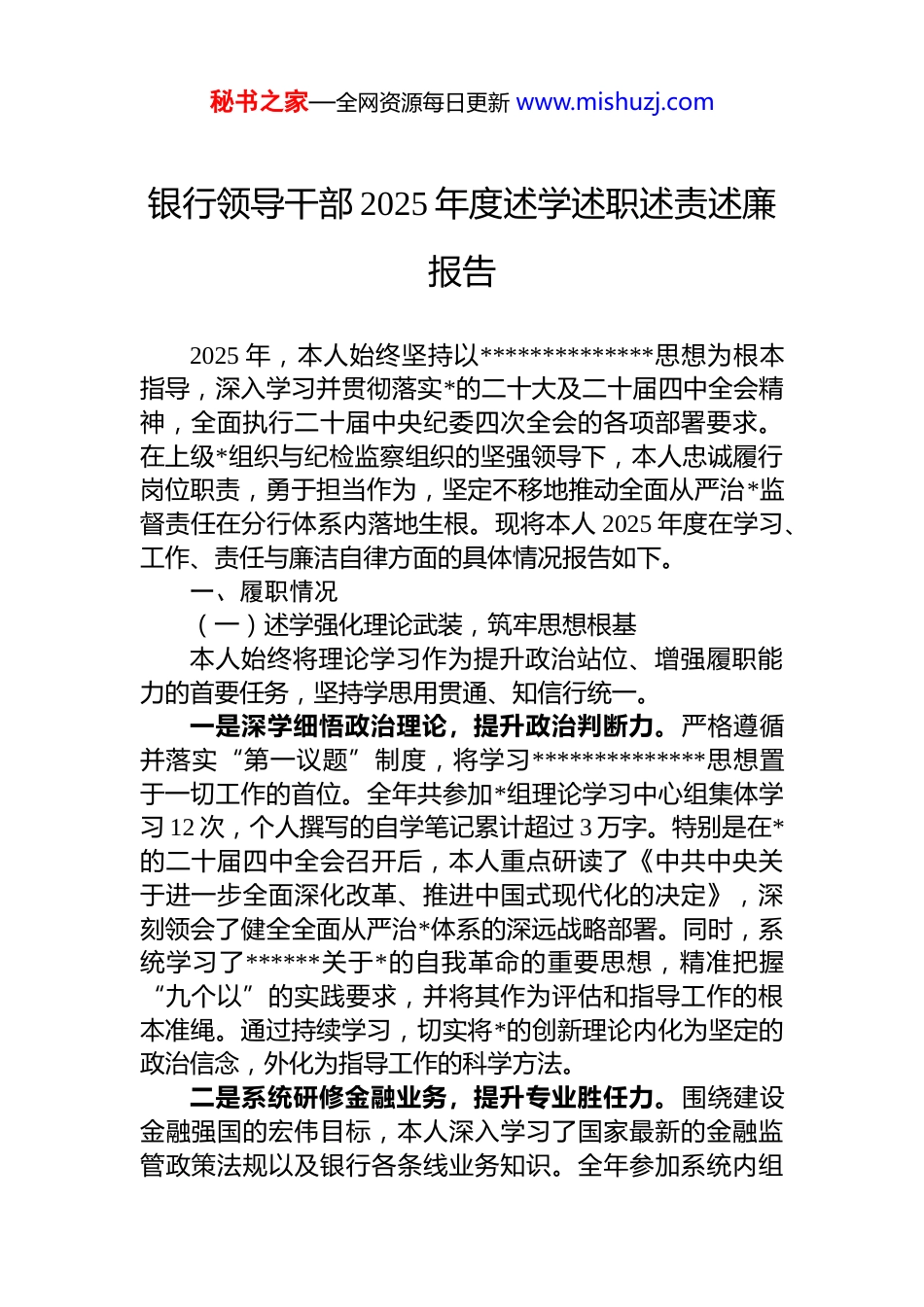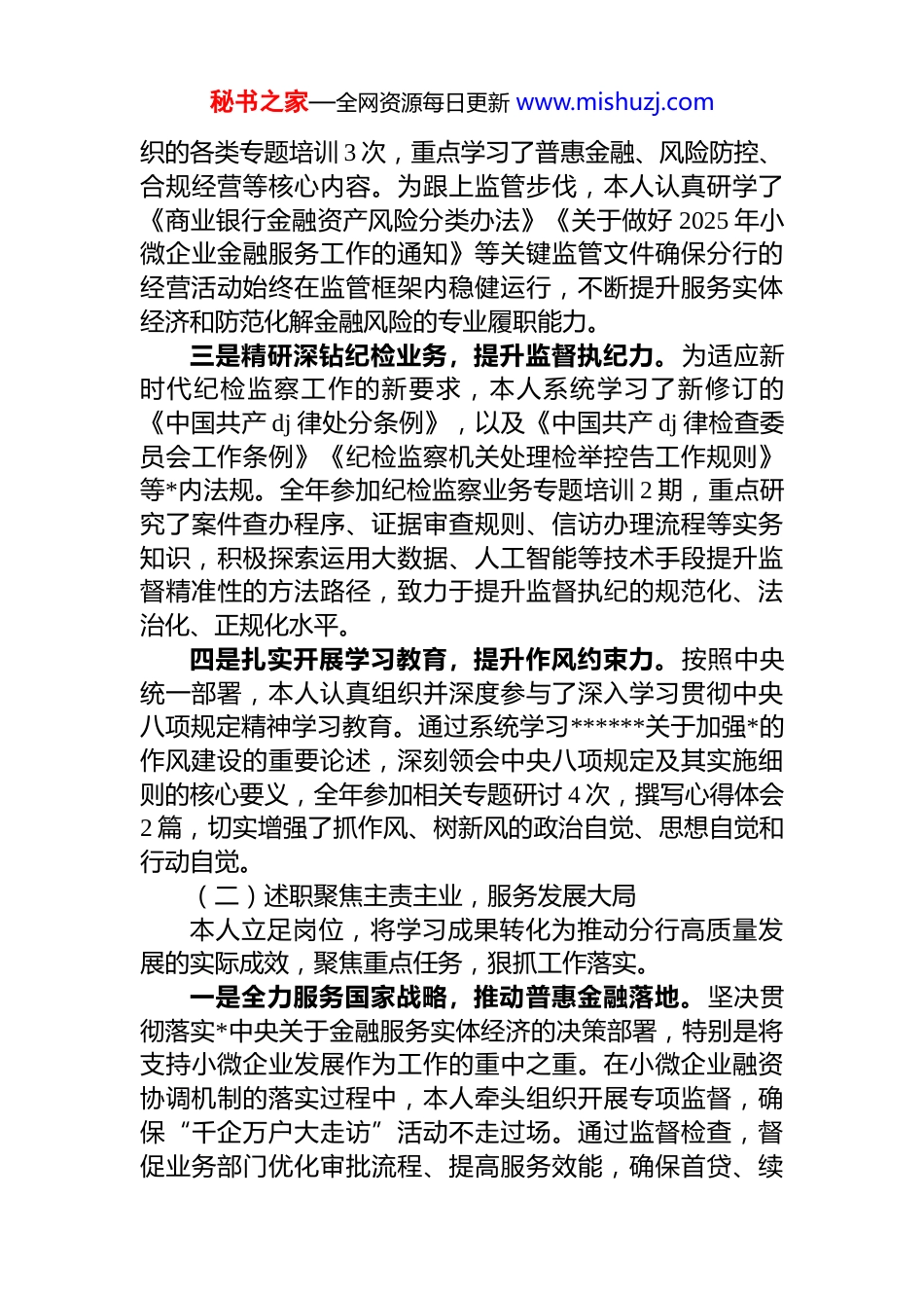 秘书之家—全网资源每日更新 www.mishuzj.com银行领导干部 2025 年度述学述职述责述廉报告2025 年,本人始终坚持以**************思想为根本指导,深入学习并贯彻落实*的二十大及二十届四中全会精神,全面执行二十届中央纪委四次全会的各项部署要求。在上级*组织与纪检监察组织的坚强领导下,本人忠诚履行岗位职责,勇于担当作为,坚定不移地推动全面从严治*监督责任在分行体系内落地生根。现将本人 2025 年度在学习、工作、责任与廉洁自律方面的具体情况报告如下。一、履职情况(一)述学强化理论武装,筑牢思想根基本人始终将理论学习作为提升政治站位、增强履职能力的首要任务,坚持学思用贯通、知信行统一。一是深学细悟政治理论,提升政治判断力。严格遵循并落实“第一议题”制度,将学习**************思想置于一切工作的首位。全年共参加*组理论学习中心组集体学习 12 次,个人撰写的自学笔记累计超过 3 万字。特别是在*的二十届四中全会召开后,本人重点研读了《中共中央关于进一步全面深化改革、推进中国式现代化的决定》,深刻领会了健全全面从严治*体系的深远战略部署。同时,系统学习了******关于*的自我革命的重要思想,精准把握“九个以”的实践要求,并将其作为评估和指导工作的根本准绳。通过持续学习,切实将*的创新理论内化为坚定的政治信念,外化为指导工作的科学方法。二是系统研修金融业务,提升专业胜任力。围绕建设金融强国的宏伟目标,本人深入学习了国家最新的金融监管政策法规以及银行各条线业务知识。全年参加系统内组秘书之家—全网资源每日更新 www.mishuzj.com织的各类专题培训 3 次,重点学习了普惠金融、风险防控、合规经营等核心内容。为跟上监管步伐,本人认真研学了《商业银行金融资产风险分类办法》《关于做好 2025 年小微企业金融服务工作的通知》等关键监管文件确保分行的经营活动始终在监管框架内稳健运行,不断提升服务实体经济和防范化解金融风险的专业履职能力。三是精研深钻纪检业务,提升监督执纪力。为适应新时代纪检监察工作的新要求,本人系统学习了新修订的《中国共产 dj 律处分条例》,以及《中国共产 dj 律检查委员会工作条例》《纪检监察机关处理检举控告工作规则》等*内法规。全年参加纪检监察业务专题培训 2 期,重点研究了案件查办程序、证据审查规则、信访办理流程等实务知识,积极探索运用大数据、人工智能等技术手段提升监督精准性的方法路径,致力于提升监督执纪的规范化、法治化、正规化水平。四是扎实开展学习教育,提升作风约束力。按照中央统一部署,本人认真组织并深度参与了深入学习贯彻中央八项规定精神学习教育。通过系统学习******关于加强*的作风建设的重要论述,深刻领会中央八项规定及其实施细则的核心要义,全年参加相关专题研讨 4 次,撰写心得体会2 篇,切实增强了抓作风、树新风的政治自觉、思想自觉和行动自觉。(二)述职聚焦主责主业,服务发展大局本人立足岗位,将学习成果转化为推动分行高质量发展的实际成效,聚焦重点任务,狠抓工作落实。一是全力服务国家战略,推动普惠金融落地。坚决贯彻落实*中央关于金融服务实体经济的决策部署,特别是将支持小微企业发展作为工作的重中之重。在小微企业融资协调机制的落实过程中,本人牵头组织开展专项监督,确保“千企万户大走访”活动不走过场。通过监督检查,督促业务部门优化审批流程、提高服务效能,确保首贷、续秘书之家—全网资源每日更新 www.mishuzj.com贷政策执行到位,信贷资金直达效率显著提升。得益于此协调机制的有效运行,截至 2025 年 6 月末,全国银行业对“推荐清单”内经营主体的新发放贷款已达 17.8 万亿元,其中信用贷款占比达到 32.8%,有力地支持了小微企业的生存与发展。我分行普惠型小微企业贷款增速也顺利达到预期目标。二是主动防范化解风险,维护区域金融稳定。面对复杂严峻的经济金融形势,本人始终将风险防控置于突出位置。扎实推进风险化解专项监督,紧盯不良资产清收处置重点领域授信审批、抵押担保物管理等风险易发多发的关键环节。全年组织开展相关专项检查 2 次,共发现并识别出潜...