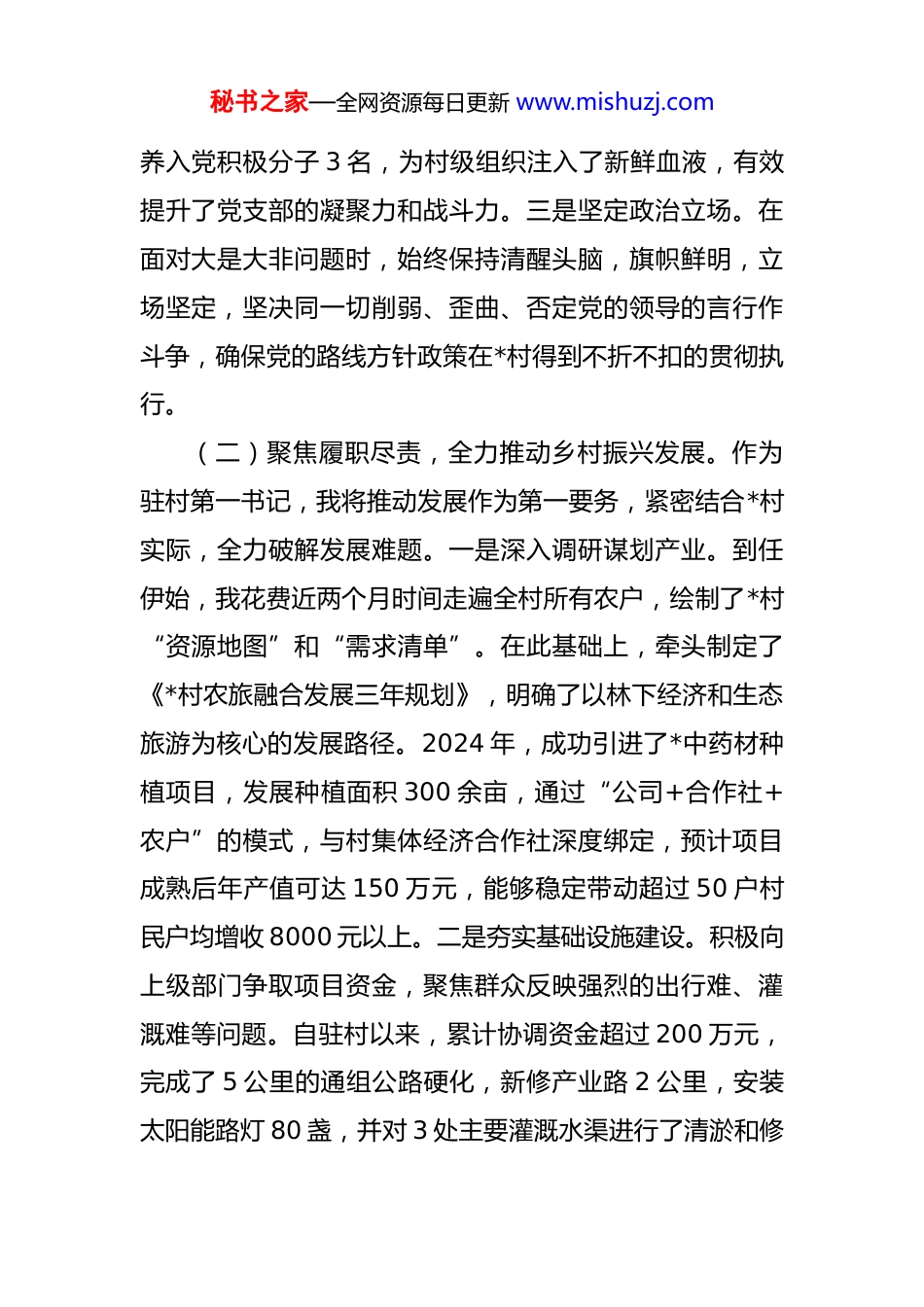 秘书之家—全网资源每日更新 www.mishuzj.com2025 年驻村第一书记政治考察谈话材料 尊敬的考察组领导:根据本次考察谈话安排,现将我自担任*县*乡*村驻村第一书记以来的个人思想、工作情况汇报如下。在组织的培养和关怀下,在乡党委、政府的坚强领导和全村干部群众的大力支持下,我始终牢记使命、恪尽职守,各项工作取得了一定进展。一、主要工作与成效(一)聚焦政治建设,持续筑牢基层战斗堡垒。我始终将政治建设摆在首位,深刻认识到驻村工作首要是政治责任。一是强化理论武装。坚持将学习贯彻习近平新时代中国特色社会主义思想作为首要政治任务,特别是深入学习领会关于“三农”工作、乡村振兴的重要论述,不断提升自身的政治判断力、政治领悟力、政治执行力。通过“第一书记讲党课”、主题党日等形式,带领村“两委”班子和全村党员读原著、学原文、悟原理,确保党的创新理论在*村落地生根。二是建强村级组织。协助村党支部严格落实“三会一课”、组织生活会等制度,不断规范党内政治生活。注重在产业发展一线、乡村治理网格中发现和培养入党积极分子,2024 年以来共发展预备党员 2 名,培秘书之家—全网资源每日更新 www.mishuzj.com养入党积极分子 3 名,为村级组织注入了新鲜血液,有效提升了党支部的凝聚力和战斗力。三是坚定政治立场。在面对大是大非问题时,始终保持清醒头脑,旗帜鲜明,立场坚定,坚决同一切削弱、歪曲、否定党的领导的言行作斗争,确保党的路线方针政策在*村得到不折不扣的贯彻执行。(二)聚焦履职尽责,全力推动乡村振兴发展。作为驻村第一书记,我将推动发展作为第一要务,紧密结合*村实际,全力破解发展难题。一是深入调研谋划产业。到任伊始,我花费近两个月时间走遍全村所有农户,绘制了*村“资源地图”和“需求清单”。在此基础上,牵头制定了《*村农旅融合发展三年规划》,明确了以林下经济和生态旅游为核心的发展路径。2024 年,成功引进了*中药材种植项目,发展种植面积 300 余亩,通过“公司+合作社+农户”的模式,与村集体经济合作社深度绑定,预计项目成熟后年产值可达 150 万元,能够稳定带动超过 50 户村民户均增收 8000 元以上。二是夯实基础设施建设。积极向上级部门争取项目资金,聚焦群众反映强烈的出行难、灌溉难等问题。自驻村以来,累计协调资金超过 200 万元,完成了 5 公里的通组公路硬化,新修产业路 2 公里,安装太阳能路灯 80 盏,并对 3 处主要灌溉水渠进行了清淤和修秘书之家—全网资源每日更新 www.mishuzj.com复,极大改善了群众的生产生活条件。三是提升乡村治理效能。以积分制管理为抓手,修订完善了《*村村规民约》,将环境卫生、尊老爱幼、参与公益等纳入积分管理范围,每季度进行评比表彰,有效激发了群众参与乡村治理的内生动力。*村的村容村貌和乡风文明程度得到显著提升,2024 年被评为“县级文明村寨”。(三)聚焦群众路线,用心用情服务父老乡亲。我始终牢记“从群众中来,到群众中去”的工作方法,坚持把群众满意不满意作为衡量工作的根本标准。一是当好群众的“贴心人”。坚持每日走访,随身携带《民情日记》,详细记录群众的所思所想、所急所盼。对于群众反映的问题,能当场解决的绝不拖延,需要协调的及时跟进。例如,在了解到*组部分村民因地势较高存在季节性饮水困难后,我多次与县水务部门沟通协调,最终成功争取到小型安全饮水巩固提升项目,彻底解决了该区域 30 余户群众的饮水安全问题。二是当好政策的“宣传员”。利用群众会、院坝会等时机,用通俗易懂的语言向群众宣传解释党的惠民政策,特别是医疗保障、养老保险、教育资助等与群众切身利益相关的政策,确保好政策家喻户晓、应享尽享。三是当好矛盾的“调解员”。坚持“小事不出组、大事不出村”,积极参与村级矛盾纠纷排查化解工作。对于秘书之家—全网资源每日更新 www.mishuzj.com邻里纠纷、土地争议等,与村干部一同上门调解,耐心听取双方诉求,依法依理进行疏导,成功化解各类矛盾纠纷20 余起,维护了全村的和谐稳定。(四)聚焦廉洁纪律,始终保持清正廉洁本色。我时刻警醒自己,驻村第一书记的形...