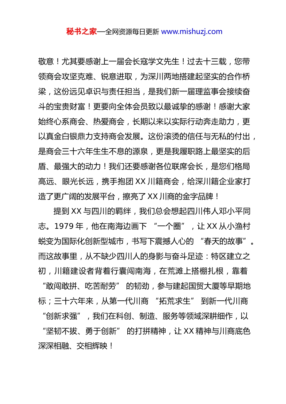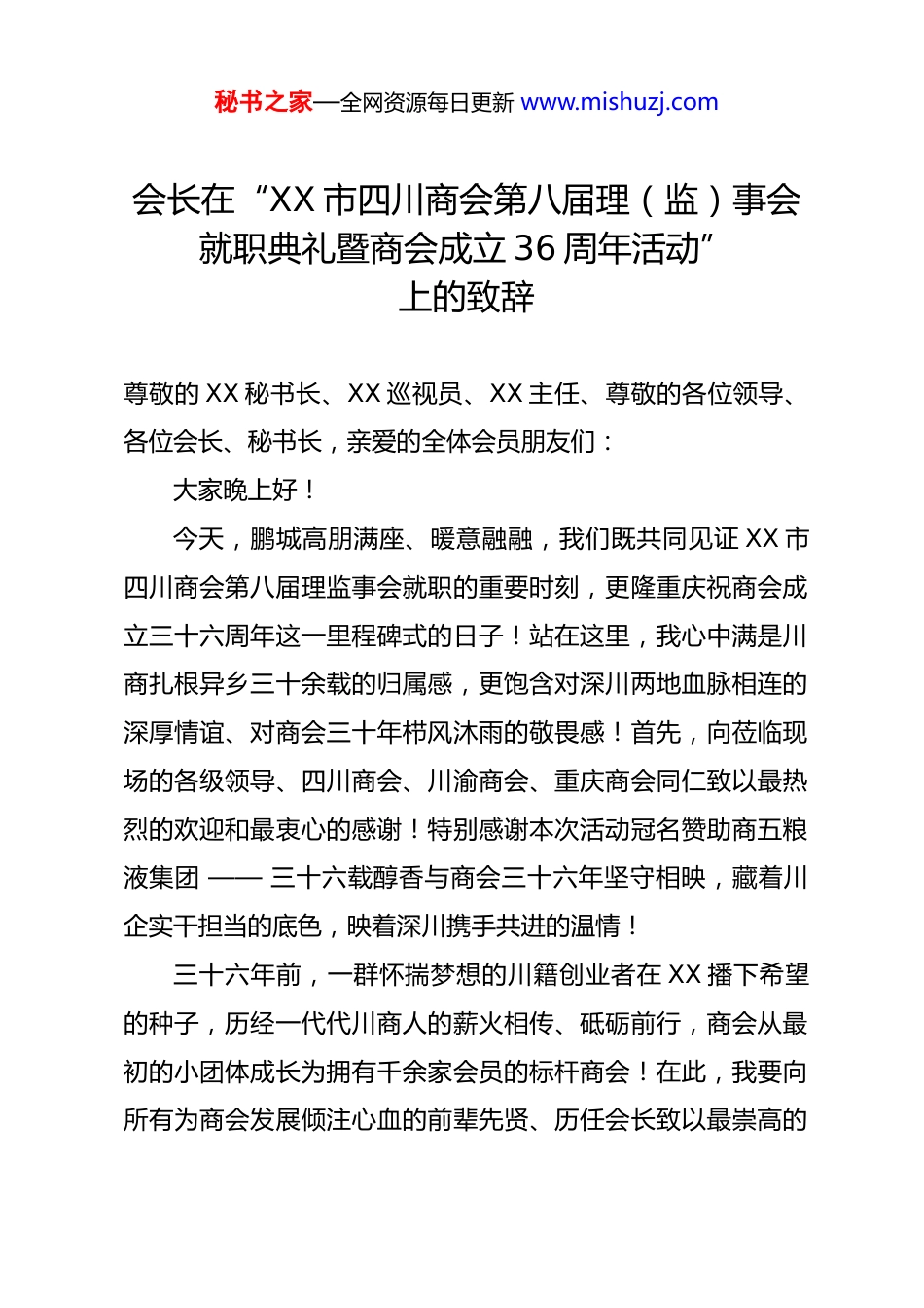 秘书之家—全网资源每日更新 www.mishuzj.com会长在“XX 市四川商会第八届理(监)事会就职典礼暨商会成立 36 周年活动”上的致辞尊敬的 XX 秘书长、XX 巡视员、XX 主任、尊敬的各位领导、各位会长、秘书长,亲爱的全体会员朋友们:大家晚上好!今天,鹏城高朋满座、暖意融融,我们既共同见证 XX 市四川商会第八届理监事会就职的重要时刻,更隆重庆祝商会成立三十六周年这一里程碑式的日子!站在这里,我心中满是川商扎根异乡三十余载的归属感,更饱含对深川两地血脉相连的深厚情谊、对商会三十年栉风沐雨的敬畏感!首先,向莅临现场的各级领导、四川商会、川渝商会、重庆商会同仁致以最热烈的欢迎和最衷心的感谢!特别感谢本次活动冠名赞助商五粮液集团 —— 三十六载醇香与商会三十六年坚守相映,藏着川企实干担当的底色,映着深川携手共进的温情!三十六年前,一群怀揣梦想的川籍创业者在 XX 播下希望的种子,历经一代代川商人的薪火相传、砥砺前行,商会从最初的小团体成长为拥有千余家会员的标杆商会!在此,我要向所有为商会发展倾注心血的前辈先贤、历任会长致以最崇高的秘书之家—全网资源每日更新 www.mishuzj.com敬意!尤其要感谢上一届会长寇学文先生!过去十三载,您带领商会攻坚克难、锐意进取,为深川两地搭建起坚实的合作桥梁,这份远见卓识与责任担当,是我们新一届理监事会接续奋斗的宝贵财富!更要向全体会员致以最诚挚的感谢!感谢大家始终心系商会、热爱商会,长期以来以实际行动奔走助力,更以真金白银鼎力支持商会发展。这份滚烫的信任与无私的付出,是商会三十六年生生不息的源泉,更是我履职路上最坚实的后盾、最强大的动力!我们还要感谢各位联席会长,是您们格局高远、眼光长远,携手抱团 XX 川籍商会,给深川籍企业家打造了更广阔的发展平台,擦亮了 XX 川商的金字品牌!提到 XX 与四川的羁绊,我们总会想起四川伟人邓小平同志。1979 年,他在南海边画下 “一个圈”,让 XX 从小渔村蜕变为国际化创新型城市,书写下震撼人心的 “春天的故事”。而这故事里,从不缺少四川人的身影与奋斗足迹:特区建立之初,川籍建设者背着行囊闯南海,在荒滩上搭棚扎根,靠着 “敢闯敢拼、吃苦耐劳” 的韧劲,参与建起国贸大厦等早期地标;三十六年来,从第一代川商 “拓荒求生” 到新一代川商 “创新求强”,我们在科创、制造、服务等领域深耕细作,以 “坚韧不拔、勇于创新” 的打拼精神,让 XX 精神与川商底色深深相融、交相辉映!秘书之家—全网资源每日更新 www.mishuzj.com从 “开拓创新” 到 “敢闯敢试”,XX 精神的迭代升级,始终与川商 “敢为人先、抱团发展” 的优良传统高度契合;三十六载春华秋实,商会始终坚守 “服务会员、链接两地” 的初心。今天,我们接过接力棒,站在新的历史起点上,将始终以“服务、学习、互助、共赢” 为核心价值观,践行 “服务川商、建设 XX、回报家乡” 的核心思路:在服务川商上,聚焦 “赋智赋能”,当前的世界逆全球化趋势明显,全球经济面临着重大的不确定性,我们如何应对不确定性呢?我想学习是非常有效的方式之一!多年来我有一个心得体会,就是持之以恒地向优秀的人学习,拜高人为师,向高人请教—— 我们杰美晟模具公司过去五年的人均产值翻了一番,正是得益于多位高人的指点!其中三位贵人今天也来到了现场,也就是今晚我们要颁牌的三位导师,他们是真正的牛人和高人!希望他们今年带来的六天课程,能够为大家开启不一样的企业发展之路;同时我们将搭建全球川商资源共享平台,为会员发展精准对接各类优质资源;在建设 XX 上,依托特区独特优势,助力会员企业高效链接国际资源,以实干实绩为 XX 发展注入强劲川商动能;在回报家乡上,持续深化深川合作纽带,组织返乡考察、设立公益基金,实现企业发展与家乡繁荣的双向奔赴、互利共赢!为扎实落地目标,我们将推进三项重点计划:一是搭建 秘书之家—全网资源每日更新 www.mishuzj.com“三维服务体系”,保障导师授课与资源平台高效运转、实效落地,让商会服务更有温度;二是打造 “川商科创联盟”,常态化...