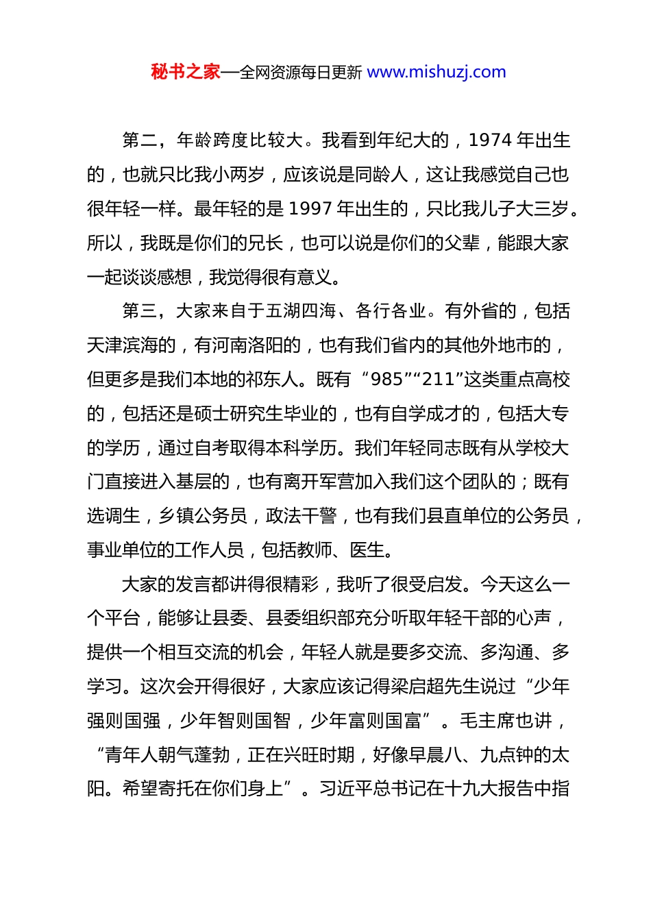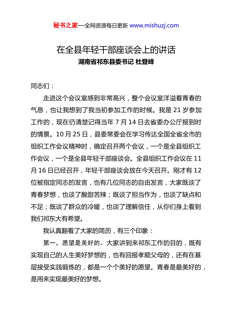 秘书之家—全网资源每日更新 www.mishuzj.com在全县年轻干部座谈会上的讲话湖南省祁东县委书记 杜登峰同志们:走进这个会议室感到非常高兴,整个会议室洋溢着青春的气息,也让我想到了我当初参加工作的时候。我是 21 岁参加工作的,现在仍清楚记得当年 7 月 14 日去省委办公厅报到时的情景。10 月 25 日,县委常委会在学习传达全国全省全市的组织工作会议精神时,确定召开两个会议,一个是全县组织工作会议,一个是全县年轻干部座谈会。全县组织工作会议在 11月 16 日已经召开,年轻干部座谈会放在今天召开。刚才有 12位被指定同志的发言,也有几位同志的自由发言,大家既谈了青春梦想,也谈了酸甜苦辣;既谈了担当作为,也谈了缺点和不足;既谈了群众的冷暖,也谈了理解信任,从你们身上看到我们祁东大有希望。我认真翻看了大家的简历,有三个印象:第一,愿望是美好的。大家讲到来祁东工作的目的,既有实现自己的人生美好梦想的,也有回报孝顺父母的,还有在基层接受实践锻炼的,都是一个个美好的愿望。青春是最美好的,是用来实现最美好的梦想。秘书之家—全网资源每日更新 www.mishuzj.com第二,年龄跨度比较大。我看到年纪大的,1974 年出生的,也就只比我小两岁,应该说是同龄人,这让我感觉自己也很年轻一样。最年轻的是 1997 年出生的,只比我儿子大三岁。所以,我既是你们的兄长,也可以说是你们的父辈,能跟大家一起谈谈感想,我觉得很有意义。第三,大家来自于五湖四海、各行各业。有外省的,包括天津滨海的,有河南洛阳的,也有我们省内的其他外地市的,但更多是我们本地的祁东人。既有“985”“211”这类重点高校的,包括还是硕士研究生毕业的,也有自学成才的,包括大专的学历,通过自考取得本科学历。我们年轻同志既有从学校大门直接进入基层的,也有离开军营加入我们这个团队的;既有选调生,乡镇公务员,政法干警,也有我们县直单位的公务员,事业单位的工作人员,包括教师、医生。大家的发言都讲得很精彩,我听了很受启发。今天这么一个平台,能够让县委、县委组织部充分听取年轻干部的心声,提供一个相互交流的机会,年轻人就是要多交流、多沟通、多学习。这次会开得很好,大家应该记得梁启超先生说过“少年强则国强,少年智则国智,少年富则国富”。毛主席也讲,“青年人朝气蓬勃,正在兴旺时期,好像早晨八、九点钟的太阳。希望寄托在你们身上”。习近平总书记在十九大报告中指秘书之家—全网资源每日更新 www.mishuzj.com出,“青年兴则国家兴,青年强则国家强。青年一代有理想、有本领、有担当,国家就有前途,民族就有希望”。只要我们在座的各位奋发有为、顽强拼搏,祁东一定会发展更好、更有希望。今天,我既想以一个县委书记的身份,结合习近平总书记在全国组织工作会议上以及在其他相关会议上的重要讲话,跟大家讲一讲党中央对年轻干部的关怀、培养的方向方针、基本的要求,同时结合我个人成长的一些经历,给年轻干部谈一点个人自己的感想。具体来说,我们年轻干部要坚持做好以下五个方面:一、年轻干部要始终绷紧讲政治这根弦现在党中央选人用人突出政治建设的标准,选人用人把政治标准放在首位。省委组织部从去年开始,对全省 122 个县市区的党政正职进行了政治建设的考察,把政治建设考察看得非常重,这是放在首要的标准。政治建设考察什么内容?主要考察政治忠诚、政治定力、政治担当、政治能力、政治自律这五个具体的方面。大家千万不要把讲政治看成是空洞的、抽象的,讲政治是实际的、具体的。现在讲什么事情的时候,都是把提高政治站位放在第一位党的十八大以后,查处的党的高级领导干部,周永康是 1942秘书之家—全网资源每日更新 www.mishuzj.com年 12 月出生的,他 31 岁任辽河石油勘探局地球物理勘探处处长,41 岁任辽河石油勘探局局长、辽宁省盘锦市市长,43 岁任石油工业部副部长。薄熙来是个红二代,他也是 43 岁任大连市市长,大连市是副省级城市,市长相当于副部长、副省长。最后,倒台的原因之一就是不讲政治,破坏了党的团结统一,严重违反党的政治纪律和政治规矩,受到了严肃查处。所以,我们年轻...