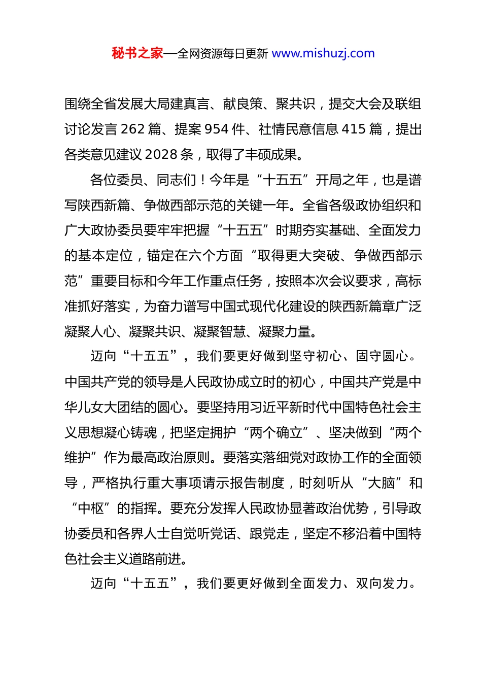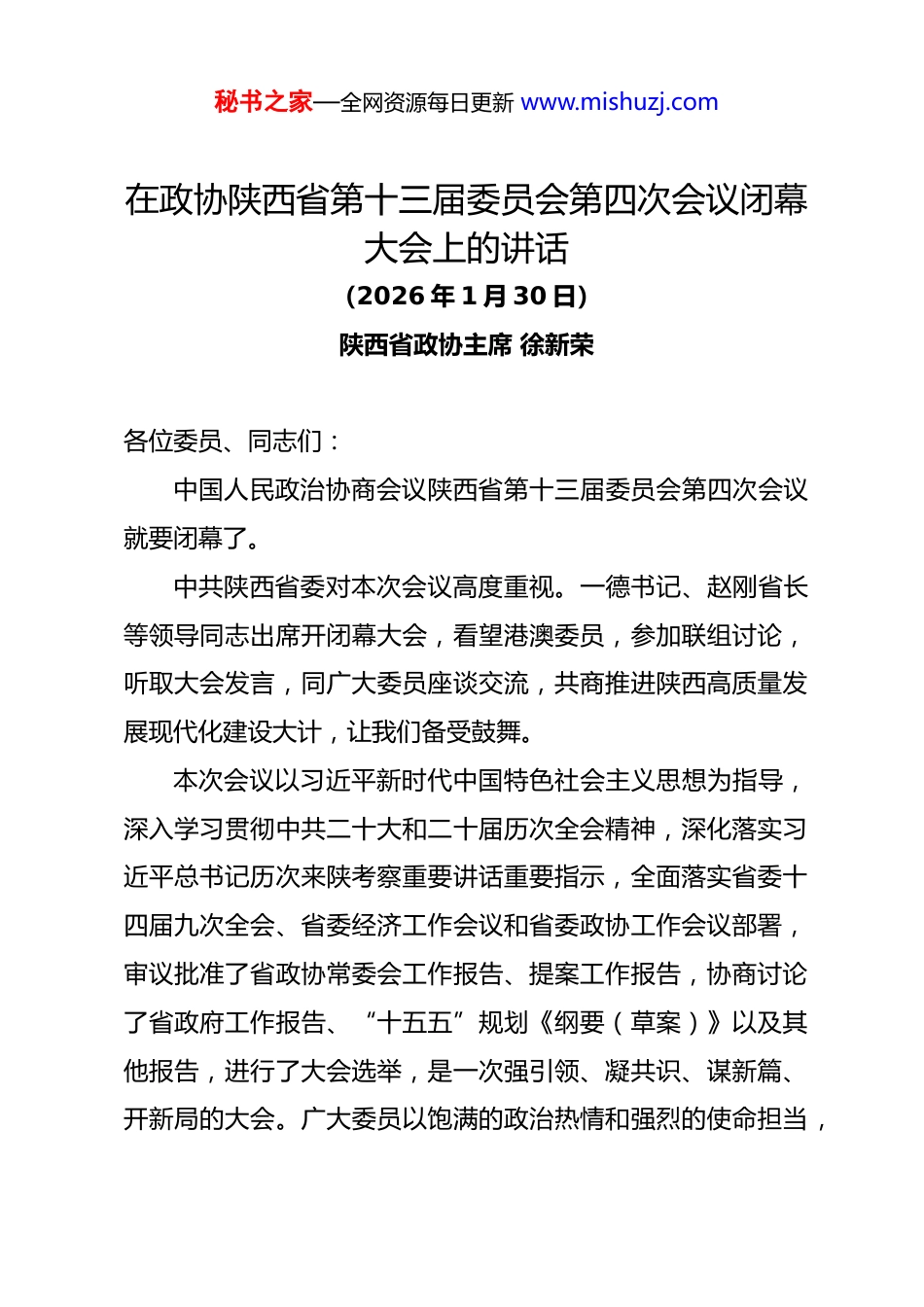 秘书之家—全网资源每日更新 www.mishuzj.com在政协陕西省第十三届委员会第四次会议闭幕大会上的讲话(2026 年 1 月 30 日)陕西省政协主席 徐新荣各位委员、同志们:中国人民政治协商会议陕西省第十三届委员会第四次会议就要闭幕了。中共陕西省委对本次会议高度重视。一德书记、赵刚省长等领导同志出席开闭幕大会,看望港澳委员,参加联组讨论,听取大会发言,同广大委员座谈交流,共商推进陕西高质量发展现代化建设大计,让我们备受鼓舞。本次会议以习近平新时代中国特色社会主义思想为指导,深入学习贯彻中共二十大和二十届历次全会精神,深化落实习近平总书记历次来陕考察重要讲话重要指示,全面落实省委十四届九次全会、省委经济工作会议和省委政协工作会议部署,审议批准了省政协常委会工作报告、提案工作报告,协商讨论了省政府工作报告、“十五五”规划《纲要(草案)》以及其他报告,进行了大会选举,是一次强引领、凝共识、谋新篇、开新局的大会。广大委员以饱满的政治热情和强烈的使命担当,秘书之家—全网资源每日更新 www.mishuzj.com围绕全省发展大局建真言、献良策、聚共识,提交大会及联组讨论发言 262 篇、提案 954 件、社情民意信息 415 篇,提出各类意见建议 2028 条,取得了丰硕成果。各位委员、同志们!今年是“十五五”开局之年,也是谱写陕西新篇、争做西部示范的关键一年。全省各级政协组织和广大政协委员要牢牢把握“十五五”时期夯实基础、全面发力的基本定位,锚定在六个方面“取得更大突破、争做西部示范”重要目标和今年工作重点任务,按照本次会议要求,高标准抓好落实,为奋力谱写中国式现代化建设的陕西新篇章广泛凝聚人心、凝聚共识、凝聚智慧、凝聚力量。迈向“十五五”,我们要更好做到坚守初心、固守圆心。中国共产党的领导是人民政协成立时的初心,中国共产党是中华儿女大团结的圆心。要坚持用习近平新时代中国特色社会主义思想凝心铸魂,把坚定拥护“两个确立”、坚决做到“两个维护”作为最高政治原则。要落实落细党对政协工作的全面领导,严格执行重大事项请示报告制度,时刻听从“大脑”和“中枢”的指挥。要充分发挥人民政协显著政治优势,引导政协委员和各界人士自觉听党话、跟党走,坚定不移沿着中国特色社会主义道路前进。迈向“十五五”,我们要更好做到全面发力、双向发力。秘书之家—全网资源每日更新 www.mishuzj.com中国式现代化已经展开壮美画卷,呈现出无比光明灿烂的前景。站在新的历史起点,要聚焦我省“十五五”规划实施,围绕深化开展“三个年”活动,加快建设教育强省、科技强省、人才强省、文化强省,大力发展县域经济、民营经济、开放型经济、数字经济,深入调研协商、务实开展监督。要坚持建言资政和凝聚共识双向发力,不断丰富“有事好商量、众人的事情由众人商量”的实践形式,以政协高质量履职服务全省高质量发展。迈向“十五五”,我们要更好做到心系人民、服务人民。家事国事天下事,让人民过上幸福生活是头等大事。要厚植为民情怀,树立和践行正确政绩观,切实把群众的“心上事”当成我们的“上心事”。要深入界别群众察实情、听民声,从人民群众急难愁盼中找准履职的切入口和发力点,多提有质量、有温度、能落地的意见建议,书写人民政协为人民的时代答卷。迈向“十五五”,我们要更好做到团结奋斗、接续奋斗。中国式现代化是人类历史上前所未有的伟大创举,需要全体中华儿女齐心协力、砥砺奋进。要坚持大团结大联合,唱响大合唱、画好同心圆,形成万众一心推进陕西高质量发展现代化建设的磅礴伟力。要努力做有信仰、有情怀、有担当、有形象的政协委员,自觉当好“十五五”发展的参与者、建设者、推动者,引导社会各界勠力同心、奋发进取,一步一个脚印、一程秘书之家—全网资源每日更新 www.mishuzj.com接着一程把我省现代化建设的宏伟蓝图变成美好现实。各位委员、同志们!实现中国式现代化没有捷径,唯有实干。让我们更加紧密地团结在以习近平同志为核心的中共中央周围,高举习近平新时代中国特色社会主义思想伟大旗帜,在中共陕西省委的坚强领导下,齐众心、汇众力、集众智,为谱写陕西新篇、争做西部示范作出更大贡献。