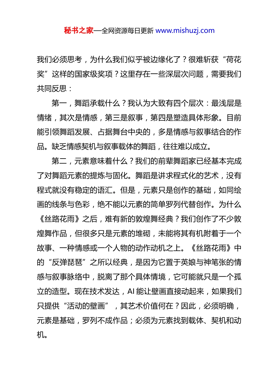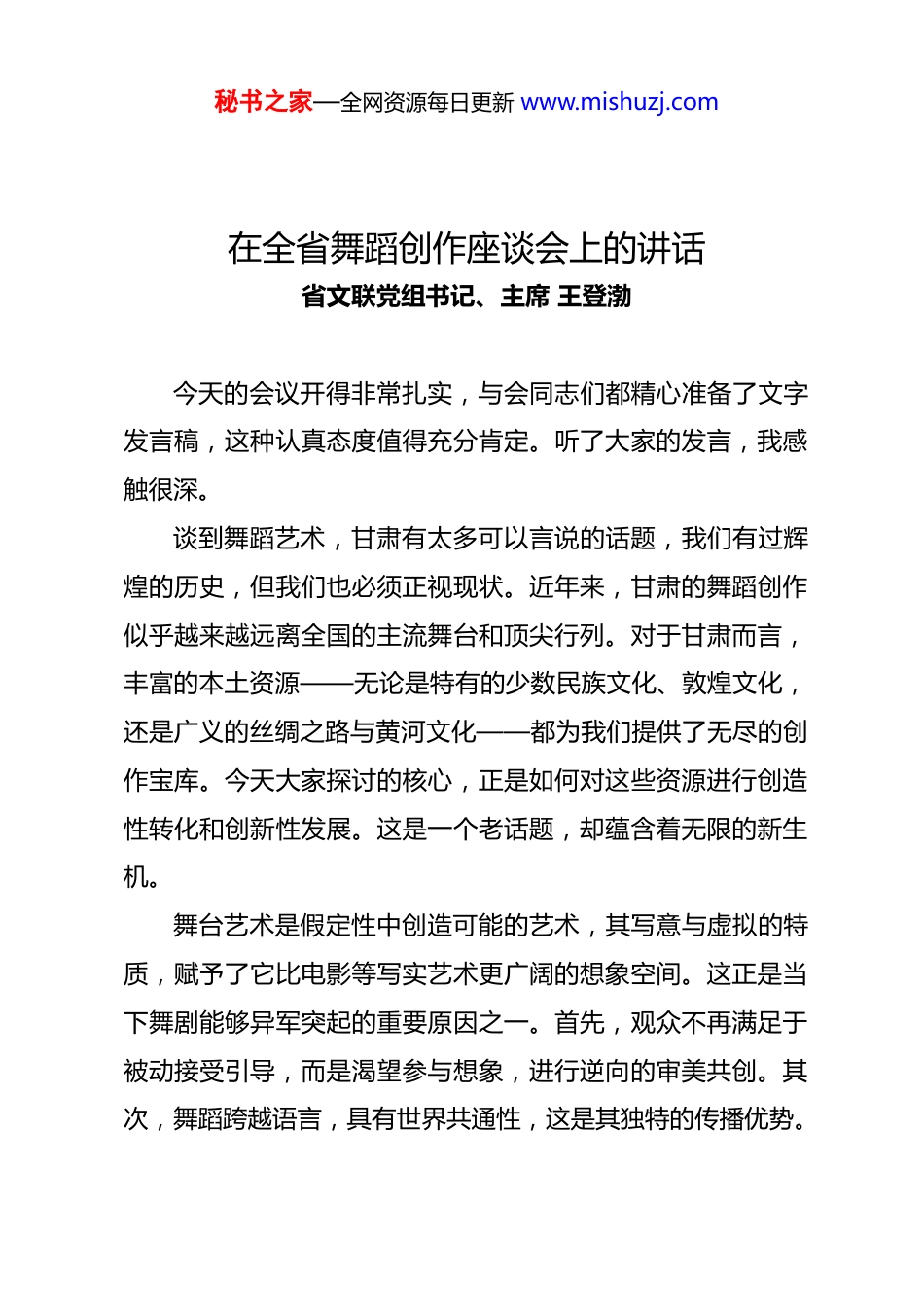 秘书之家—全网资源每日更新 www.mishuzj.com在全省舞蹈创作座谈会上的讲话省文联党组书记、主席 王登渤今天的会议开得非常扎实,与会同志们都精心准备了文字发言稿,这种认真态度值得充分肯定。听了大家的发言,我感触很深。谈到舞蹈艺术,甘肃有太多可以言说的话题,我们有过辉煌的历史,但我们也必须正视现状。近年来,甘肃的舞蹈创作似乎越来越远离全国的主流舞台和顶尖行列。对于甘肃而言,丰富的本土资源——无论是特有的少数民族文化、敦煌文化,还是广义的丝绸之路与黄河文化——都为我们提供了无尽的创作宝库。今天大家探讨的核心,正是如何对这些资源进行创造性转化和创新性发展。这是一个老话题,却蕴含着无限的新生机。舞台艺术是假定性中创造可能的艺术,其写意与虚拟的特质,赋予了它比电影等写实艺术更广阔的想象空间。这正是当下舞剧能够异军突起的重要原因之一。首先,观众不再满足于被动接受引导,而是渴望参与想象,进行逆向的审美共创。其次,舞蹈跨越语言,具有世界共通性,这是其独特的传播优势。秘书之家—全网资源每日更新 www.mishuzj.com我们必须思考,为什么我们似乎被边缘化了?很难斩获“荷花奖”这样的国家级奖项?这里存在一些深层次问题,需要我们共同反思:第一,舞蹈承载什么?我认为大致有四个层次:最浅层是情绪,其次是情感,第三是叙事,第四是塑造具体形象。目前能引领舞蹈发展、占据舞台中央的,多是情感与叙事结合的作品。缺乏情感契机与叙事载体的舞蹈,往往难以成立。第二,元素意味着什么?我们的前辈舞蹈家已经基本完成了对舞蹈元素的提炼与固化。舞蹈是讲求程式化的艺术,没有程式就没有稳定的语汇。但是,元素只是创作的基础,如同绘画的线条与色彩,绝不能以元素的简单罗列代替创作。为什么《丝路花雨》之后,难有新的敦煌舞经典?我们创作了不少敦煌舞作品,但很多只是元素的堆砌,未能将其有机附着于一个故事、一种情感或一个人物的动作动机之上。《丝路花雨》中的“反弹琵琶”之所以经典,是因为它置于英娘与神笔张的情感与叙事脉络中,脱离了那个具体情境,它可能就只是一个孤立的造型。现在技术发达,AI 能让壁画直接动起来,如果我们只提供“活动的壁画”,其艺术价值何在?因此,必须明确,元素是基础,罗列不成作品;必须为元素找到载体、契机和动机。秘书之家—全网资源每日更新 www.mishuzj.com第三,语汇如何成为作品?这涉及环节与动机。任何人物形象的舞台呈现,大概都经历感知、感觉、判断、行动四个环节,而行动需要动机。我们现在很多舞蹈,演员上场缺乏明确的动机、任务和情感逻辑,人物不承担具体的叙事或表意功能,导致感染力薄弱。舞蹈天生的弱点在于其“解释功能”的缺失,无法像语言艺术那样清晰说明复杂关系。因此,舞蹈必须将情感推向相对极端化的状态,并创造强烈而准确的情境,观众才能理解和共鸣。第四,肢体语言的局限与超越。我们的演员在技术技巧方面存在短板,这与生源、艺术教育现状有关。当肢体表现存在天花板时,如何弥补?答案就在于强化情境营造、情感表达、叙事能力和最终的艺术形象塑造。我们的一些大型群舞,往往停留在队形调度与造型展示,缺乏一个贯穿的、立体的艺术形象,不具备艺术作品应有的基本要素。基于以上问题,我认为在利用本土资源时,首先要对素材进行价值判断。许多民族舞蹈的基本语汇早在数十年前就已提炼完成,单纯再现劳动场景已无新意。关键在于,要赋予这些行为(如保安族的“浪尖”动作、裕固族的“织褐子”)以新的任务、目的和情感指向,让元素在特定载体中焕发新生。第五,文学支撑不可或缺。回顾中国舞剧发展史,《丝路秘书之家—全网资源每日更新 www.mishuzj.com花雨》的重大突破在于打破了戏曲程式的束缚。但它的成功,恰恰在于将敦煌元素与一个完整的戏剧性故事相结合。纵观中外经典舞剧,从《红楼梦》到《罗密欧与朱丽叶》,从《堂吉诃德》到《永不消逝的电波》,无不依托于坚实的文学或叙事基础。因为人的思维载体是语言,舞蹈构思的初始阶段,很难脱离文学性的构思。如果我们把现在省内很多舞蹈的动作记录还原成文字脚本,其苍白可能会暴露无遗。甘...