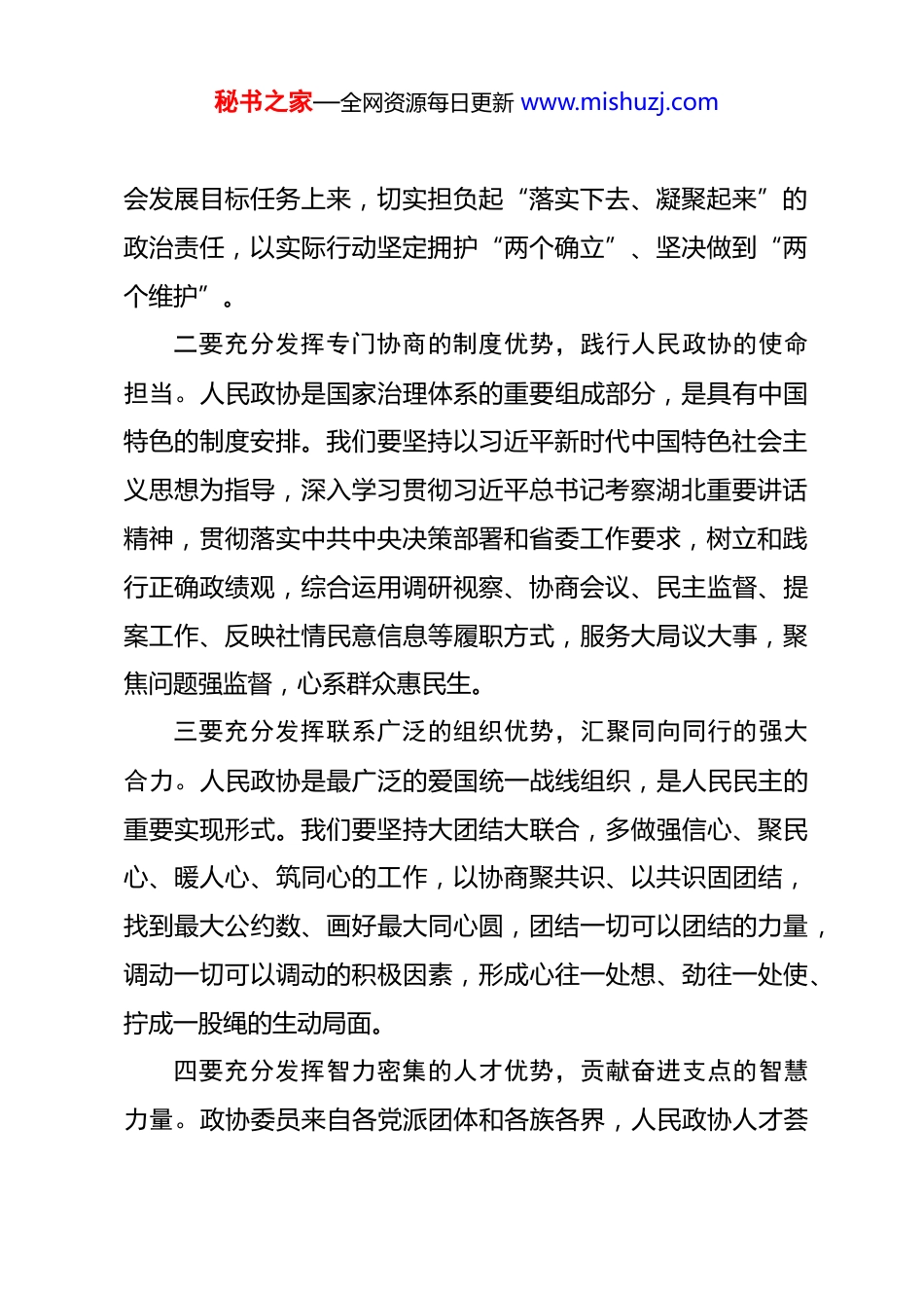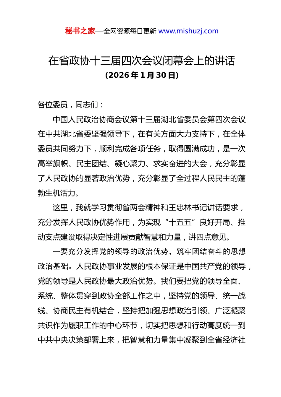 秘书之家—全网资源每日更新 www.mishuzj.com在省政协十三届四次会议闭幕会上的讲话(2026 年 1 月 30 日)各位委员,同志们:中国人民政治协商会议第十三届湖北省委员会第四次会议在中共湖北省委坚强领导下,在有关方面大力支持下,在全体委员共同努力下,顺利完成各项任务,取得圆满成功,是一次高举旗帜、民主团结、凝心聚力、求实奋进的大会,充分彰显了人民政协的显著政治优势,充分彰显了全过程人民民主的蓬勃生机活力。这里,我就学习贯彻省两会精神和王忠林书记讲话要求,充分发挥人民政协优势作用,为实现“十五五”良好开局、推动支点建设取得决定性进展贡献智慧和力量,讲四点意见。一要充分发挥党的领导的政治优势,筑牢团结奋斗的思想政治基础。人民政协事业发展的根本保证是中国共产党的领导,党的领导是人民政协最大政治优势。我们要把党的领导全面、系统、整体贯穿到政协全部工作之中,坚持党的领导、统一战线、协商民主有机结合,坚持把加强思想政治引领、广泛凝聚共识作为履职工作的中心环节,切实把思想和行动高度统一到中共中央决策部署上来,把智慧和力量集中凝聚到全省经济社秘书之家—全网资源每日更新 www.mishuzj.com会发展目标任务上来,切实担负起“落实下去、凝聚起来”的政治责任,以实际行动坚定拥护“两个确立”、坚决做到“两个维护”。二要充分发挥专门协商的制度优势,践行人民政协的使命担当。人民政协是国家治理体系的重要组成部分,是具有中国特色的制度安排。我们要坚持以习近平新时代中国特色社会主义思想为指导,深入学习贯彻习近平总书记考察湖北重要讲话精神,贯彻落实中共中央决策部署和省委工作要求,树立和践行正确政绩观,综合运用调研视察、协商会议、民主监督、提案工作、反映社情民意信息等履职方式,服务大局议大事,聚焦问题强监督,心系群众惠民生。三要充分发挥联系广泛的组织优势,汇聚同向同行的强大合力。人民政协是最广泛的爱国统一战线组织,是人民民主的重要实现形式。我们要坚持大团结大联合,多做强信心、聚民心、暖人心、筑同心的工作,以协商聚共识、以共识固团结,找到最大公约数、画好最大同心圆,团结一切可以团结的力量,调动一切可以调动的积极因素,形成心往一处想、劲往一处使、拧成一股绳的生动局面。四要充分发挥智力密集的人才优势,贡献奋进支点的智慧力量。政协委员来自各党派团体和各族各界,人民政协人才荟秘书之家—全网资源每日更新 www.mishuzj.com萃、智力密集。我们要锚定习近平总书记赋予湖北的使命任务,围绕中心大局,紧扣重大问题,紧盯群众关切,瞄准前瞻前沿,聚焦综合融合,系统谋划协商议题,深入调查研究、积极协商建言、加强民主监督、促进工作落实,实现“十五五”良好开局,推动支点建设取得决定性进展。各位委员、同志们!加快建成支点任务光荣艰巨,中国式现代化前景光明美好让我们更加紧密团结在以习近平同志为核心的中共中央周围,坚持以习近平新时代中国特色社会主义思想为指导,在中共湖北省委坚强领导下,牢记嘱托、感恩奋进,鼓足干劲、勇毅前行,为在长江经济带高质量发展中奋勇争先,加快建成中部地区崛起的重要战略支点,奋力谱写中国式现代化湖北篇章而团结奋斗!