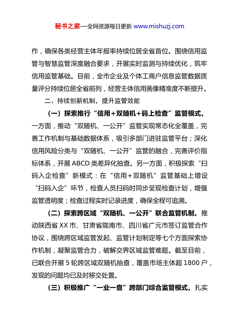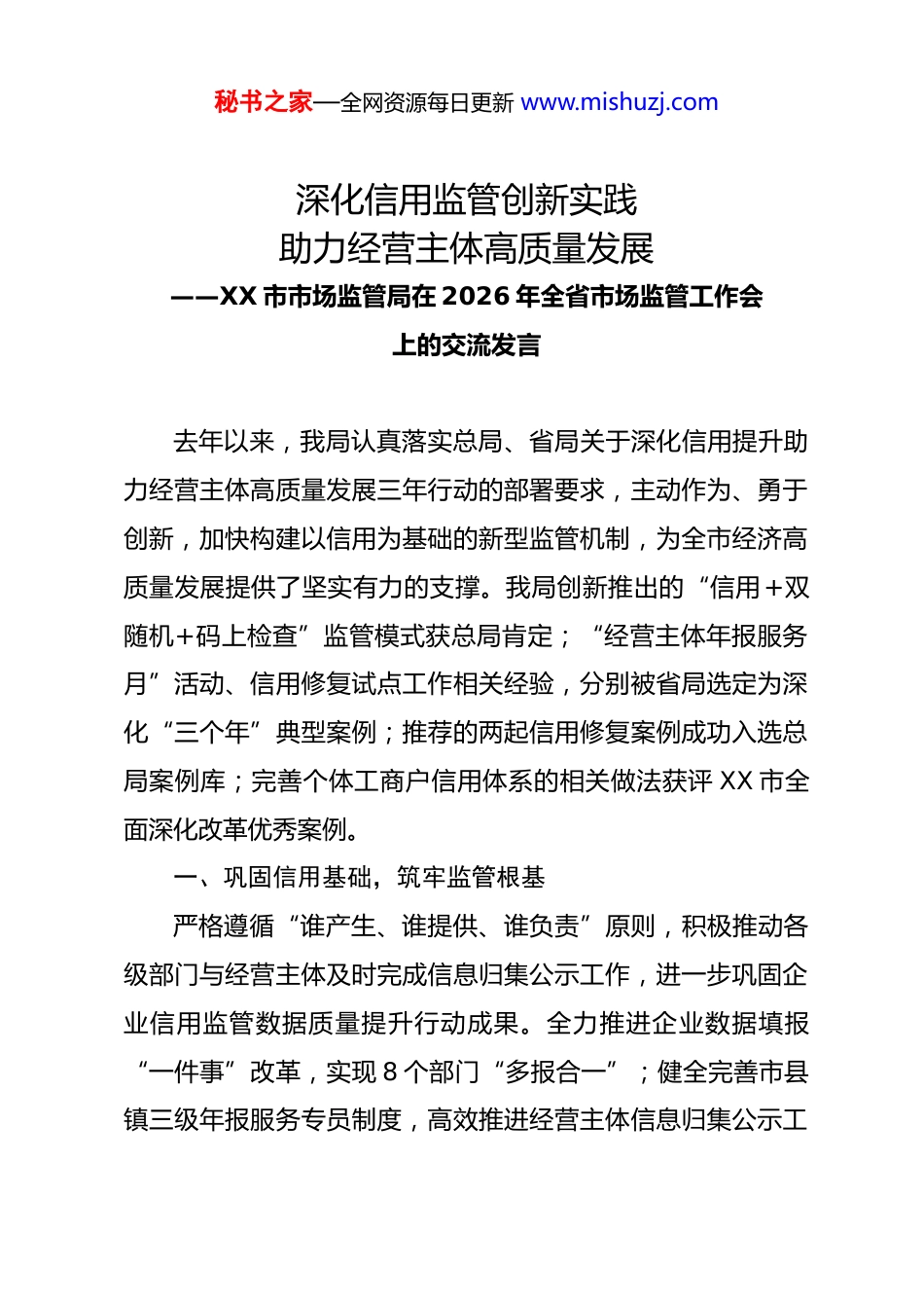 秘书之家—全网资源每日更新 www.mishuzj.com深化信用监管创新实践助力经营主体高质量发展——XX 市市场监管局在 2026 年全省市场监管工作会上的交流发言去年以来,我局认真落实总局、省局关于深化信用提升助力经营主体高质量发展三年行动的部署要求,主动作为、勇于创新,加快构建以信用为基础的新型监管机制,为全市经济高质量发展提供了坚实有力的支撑。我局创新推出的“信用+双随机+码上检查”监管模式获总局肯定;“经营主体年报服务月”活动、信用修复试点工作相关经验,分别被省局选定为深化“三个年”典型案例;推荐的两起信用修复案例成功入选总局案例库;完善个体工商户信用体系的相关做法获评 XX 市全面深化改革优秀案例。一、巩固信用基础,筑牢监管根基严格遵循“谁产生、谁提供、谁负责”原则,积极推动各级部门与经营主体及时完成信息归集公示工作,进一步巩固企业信用监管数据质量提升行动成果。全力推进企业数据填报“一件事”改革,实现 8 个部门“多报合一”;健全完善市县镇三级年报服务专员制度,高效推进经营主体信息归集公示工秘书之家—全网资源每日更新 www.mishuzj.com作,确保各类经营主体年报率持续位居全省首位。围绕信用监管与智慧监管深度融合要求,开展实时监测与持续优化,筑牢信用监管基础。目前,全市企业及个体工商户信息监管数据质量评分持续位居全省前列,经营主体信用画像精准度不断提升。二、持续创新机制,提升监管效能(一)探索推行“信用+双随机+码上检查”监管模式。一方面,推动“双随机、一公开”监管实现常态化全覆盖,完善工作机制与基础数据体系,吸引多部门进驻监管平台;深化信用风险分类与“双随机、一公开”监管的融合,完善评价指标体系,开展 ABCD 类差异化抽查。另一方面,积极探索“扫码入企检查”新模式:在“信用+双随机”监管基础上增设“扫码入企”环节,检查人员扫码时同步呈现检查计划,增强监管透明度;检查过程实时记录进度,确保全程可追溯。(二)探索跨区域“双随机、一公开”联合监管机制。推动陕西省 XX 市、甘肃省陇南市、四川省广元市签订监管合作协议,围绕跨区域监管发起、监管计划制定等七个方面探索协作机制,凝聚监管合力,破解交界区域监管难题。截至目前,已联合开展 5 轮跨区域双随机抽查,覆盖市场主体超 1800 户,发现的问题均已及时移交处置。(三)积极推广“一业一查”跨部门综合监管模式。扎实秘书之家—全网资源每日更新 www.mishuzj.com推动跨部门综合监管与“双随机、一公开”监管深度融合,按照“能联则联、应联尽联”原则,由行业主管部门牵头组织联合检查,推动监管模式从“按事项管”向“按行业管”转变;同时,创新“查教结合”模式,将监管执法与指导服务有机融合。成功举办全市“双随机、一公开”监管暨跨部门综合监管现场会,推广先进经验,引导各级各部门真抓实干、务求实效。全市全年累计开展抽查 1201 批次,同比减少 28.13%;部门联合抽查占比达 63.28%,同比提高 7.33 个百分点;抽取经营主体数量同比减少 51.11%。通过合并检查事项,企业受检频次大幅降低,群众满意度持续提升。(四)坚持“失信惩戒、信用修复、自主承诺”三位一体构建诚信建设长效机制。一是充分发挥信用信息公示作用,深化信用联合惩戒。全市全年列入企业经营异常名录或严重违法失信名单的经营主体达 4.66 万余户,公示行政处罚信息 811条。二是把握全省深化信用修复试点及全国“信用修复服务年”活动契机,以信用修复“高效办成一件事”改革为抓手,通过完善信用修复指导员制度、推行“三书同达”告知机制、规范线上修复流程、拓展线下修复渠道、引导推广“掌上办”、落实“免申即享”政策、开通信用“绿色通道”、强化宣传引导等举措,助力企业高效重塑信用、轻装前行。全市系统全年秘书之家—全网资源每日更新 www.mishuzj.com完成 1.98 万条失信记录修复,覆盖制造业、服务业等多个领域。覆盖九个行业,惠及 1.69 万户经营主体。三是积极引导各类经营主体开展自主承诺活动,强化经营者诚信自律意识,压实主体责任。作为全省率先推行“十统一六到位”管理模式的...