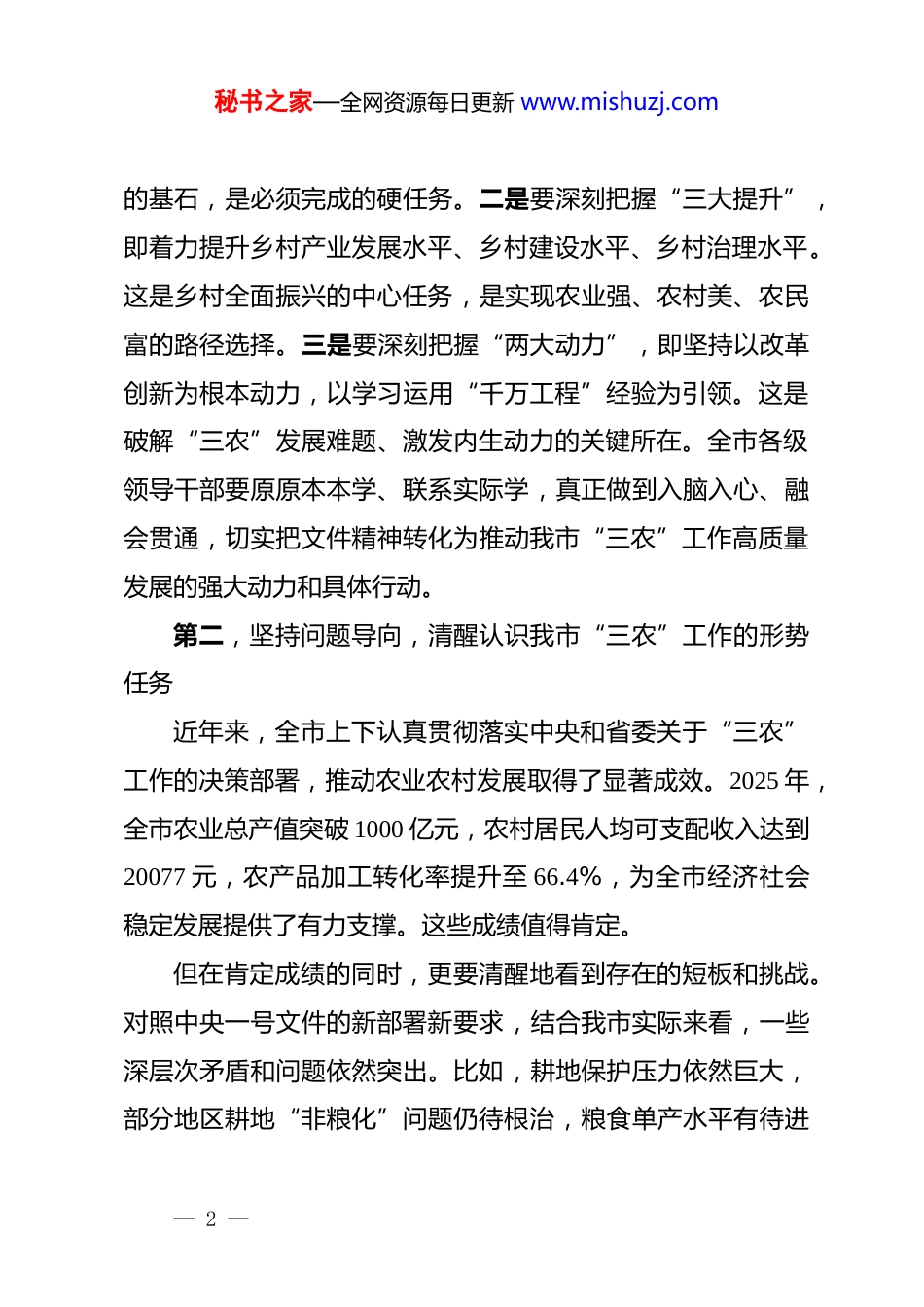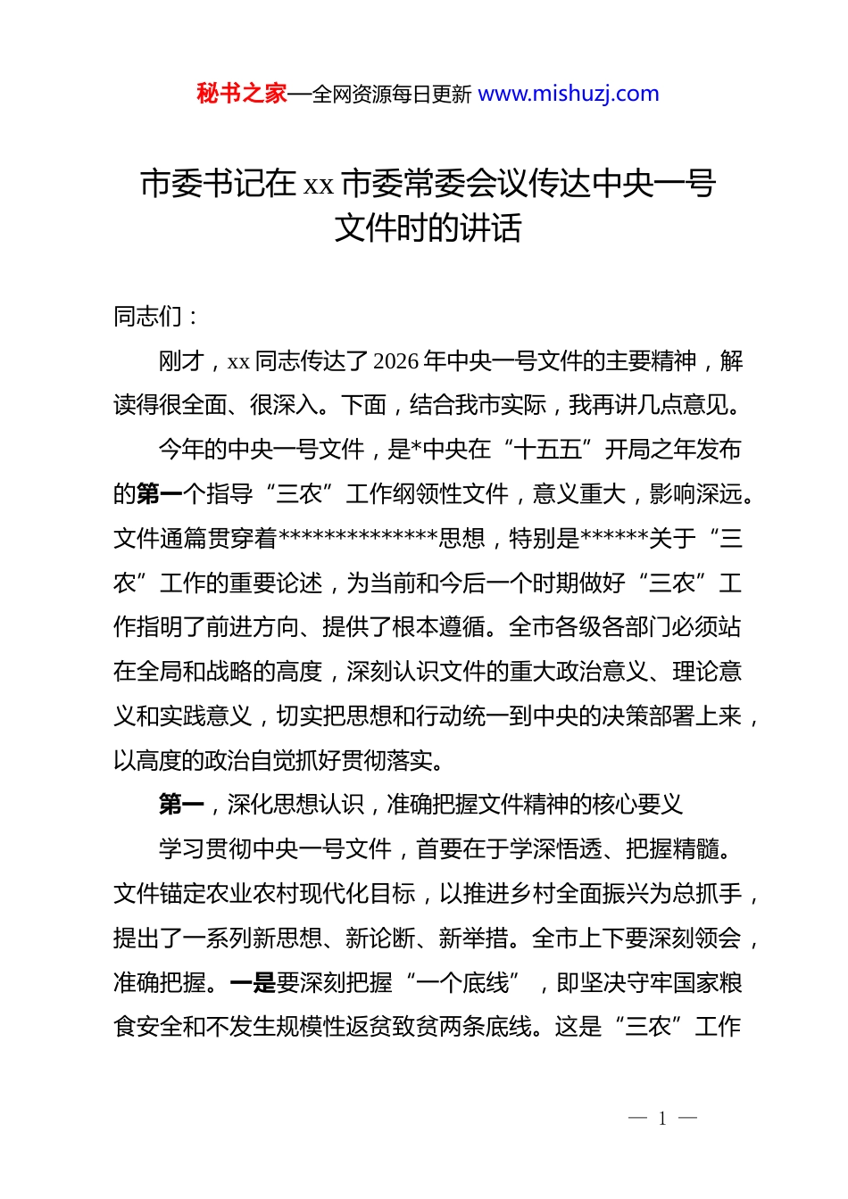秘书之家—全网资源每日更新 www.mishuzj.com市委书记在 xx 市委常委会议传达中央一号文件时的讲话同志们:刚才,xx 同志传达了 2026 年中央一号文件的主要精神,解读得很全面、很深入。下面,结合我市实际,我再讲几点意见。今年的中央一号文件,是*中央在“十五五”开局之年发布的第一个指导“三农”工作纲领性文件,意义重大,影响深远。文件通篇贯穿着**************思想,特别是******关于“三农”工作的重要论述,为当前和今后一个时期做好“三农”工作指明了前进方向、提供了根本遵循。全市各级各部门必须站在全局和战略的高度,深刻认识文件的重大政治意义、理论意义和实践意义,切实把思想和行动统一到中央的决策部署上来,以高度的政治自觉抓好贯彻落实。第一,深化思想认识,准确把握文件精神的核心要义学习贯彻中央一号文件,首要在于学深悟透、把握精髓。文件锚定农业农村现代化目标,以推进乡村全面振兴为总抓手,提出了一系列新思想、新论断、新举措。全市上下要深刻领会,准确把握。一是要深刻把握“一个底线”,即坚决守牢国家粮食安全和不发生规模性返贫致贫两条底线。这是“三农”工作— 1 —秘书之家—全网资源每日更新 www.mishuzj.com的基石,是必须完成的硬任务。二是要深刻把握“三大提升”,即着力提升乡村产业发展水平、乡村建设水平、乡村治理水平。这是乡村全面振兴的中心任务,是实现农业强、农村美、农民富的路径选择。三是要深刻把握“两大动力”,即坚持以改革创新为根本动力,以学习运用“千万工程”经验为引领。这是破解“三农”发展难题、激发内生动力的关键所在。全市各级领导干部要原原本本学、联系实际学,真正做到入脑入心、融会贯通,切实把文件精神转化为推动我市“三农”工作高质量发展的强大动力和具体行动。第二,坚持问题导向,清醒认识我市“三农”工作的形势任务近年来,全市上下认真贯彻落实中央和省委关于“三农”工作的决策部署,推动农业农村发展取得了显著成效。2025 年,全市农业总产值突破 1000 亿元,农村居民人均可支配收入达到20077 元,农产品加工转化率提升至 66.4%,为全市经济社会稳定发展提供了有力支撑。这些成绩值得肯定。但在肯定成绩的同时,更要清醒地看到存在的短板和挑战。对照中央一号文件的新部署新要求,结合我市实际来看,一些深层次矛盾和问题依然突出。比如,耕地保护压力依然巨大,部分地区耕地“非粮化”问题仍待根治,粮食单产水平有待进— 2 —秘书之家—全网资源每日更新 www.mishuzj.com一步提高;农业产业链条短、精深加工不足的问题尚未根本解决,品牌效应不强,市场竞争力有待提升;农民增收渠道还不够宽,持续稳定增收的基础尚不牢固;农村基础设施和公共服务体系仍有短板,与农民群众对美好生活的向往还有差距。这些问题,既是挑战,也是下一步工作的着力点。必须坚持问题导向,把中央一号文件作为破解难题的“金钥匙”,精准发力,靶向施策,推动我市“三农”工作再上新台阶。第三,聚焦重点任务,奋力谱写 xx 乡村全面振兴新篇章一分部署,九分落实。贯彻落实中央一号文件,关键在于行动,在于结合 xx 实际创造性地开展工作。各级各部门要迅速行动起来,逐条逐项对照文件要求,制定具体方案,明确责任分工,确保各项任务落地生根、开花结果。一要全力保障粮食和重要农产品稳定安全供给。这是头等大事。市农业农村局、市自然资源局要牵头,严格落实耕地保护和粮食安全*政同责。要坚决遏制耕地“非农化”、有效防止“非粮化”,扎实推进高标准农田建设,确保粮食播种面积稳定在 920 万亩以上。要大力实施新一轮千亿斤粮食产能提升行动,聚焦良田、良种、良机、良法集成配套,特别要加大对丘陵山区适用农机装备的研发推广力度,力争粮食单产和总产实现新突破。同时,要抓好“菜篮子”工程,稳定生猪产能,发— 3 —秘书之家—全网资源每日更新 www.mishuzj.com展多元化食物供给体系。二要聚力做强做优乡村富民产业。产业振兴是乡村振兴的重中之重。市工信局、市农业农村局、市商务局要协同发力,围绕我市辣椒、茶叶、生态畜牧、中药材等特色优势产业,着力在延链...