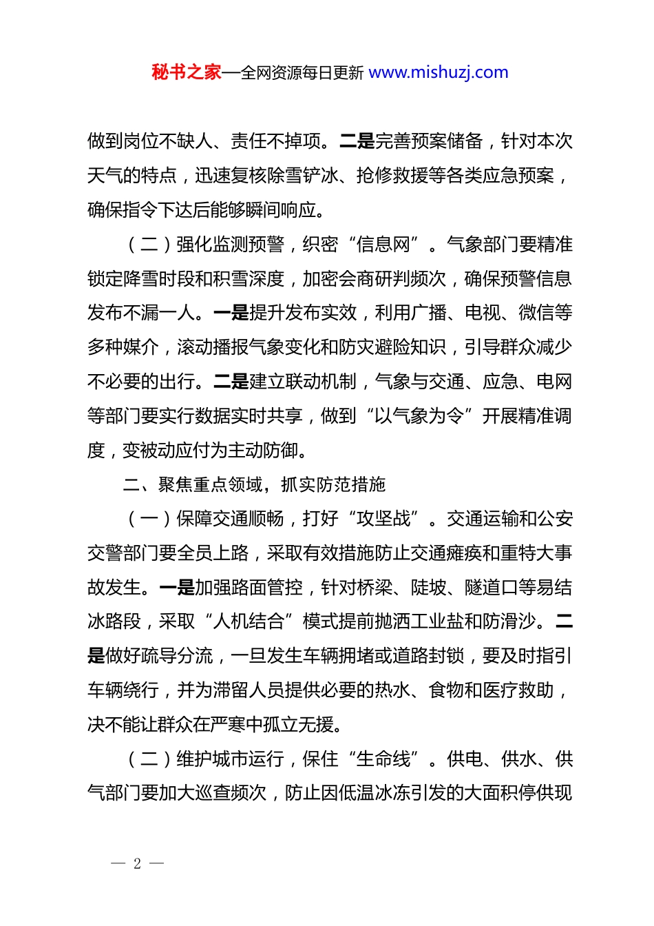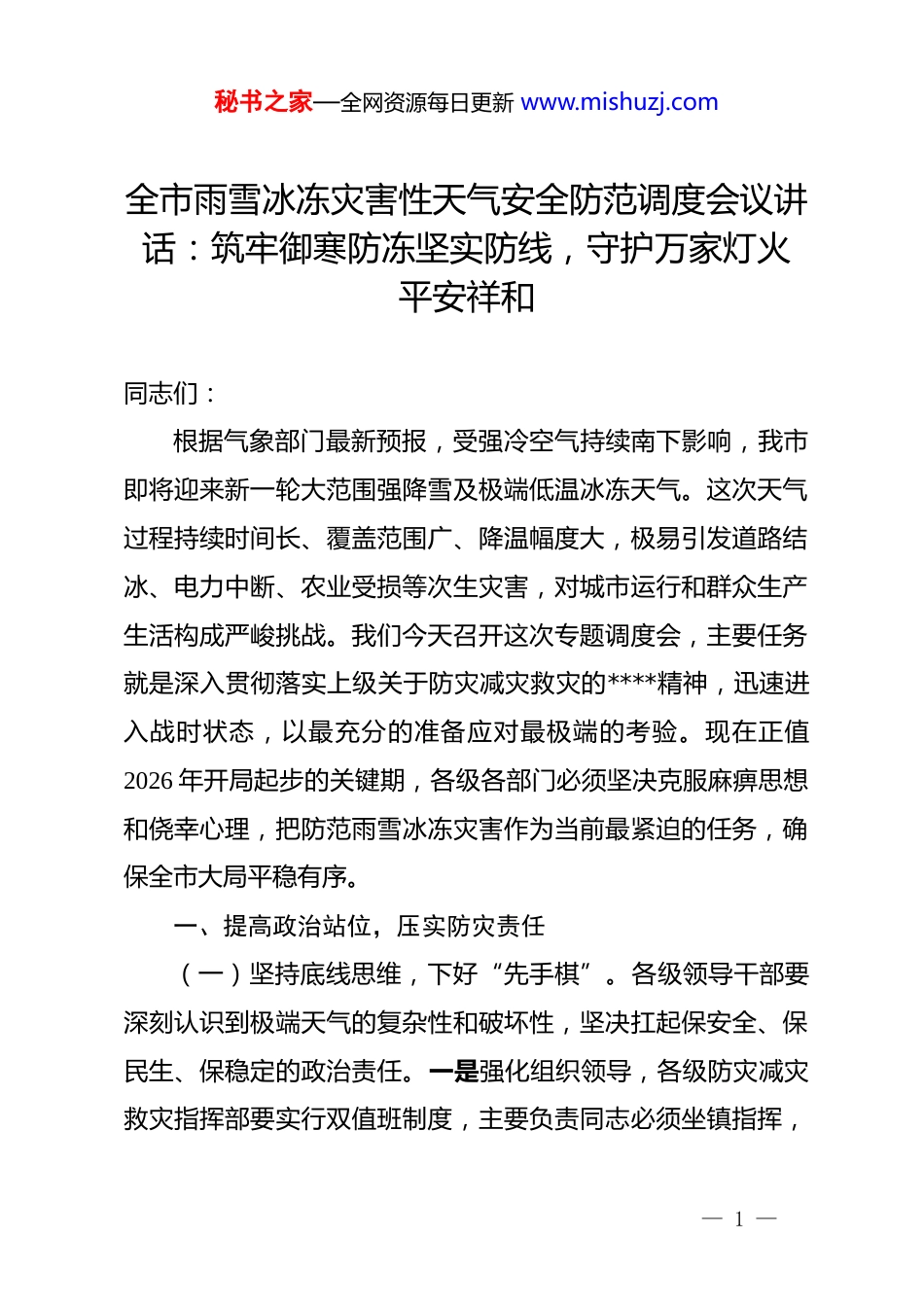 秘书之家—全网资源每日更新 www.mishuzj.com全市雨雪冰冻灾害性天气安全防范调度会议讲话:筑牢御寒防冻坚实防线,守护万家灯火平安祥和同志们:根据气象部门最新预报,受强冷空气持续南下影响,我市即将迎来新一轮大范围强降雪及极端低温冰冻天气。这次天气过程持续时间长、覆盖范围广、降温幅度大,极易引发道路结冰、电力中断、农业受损等次生灾害,对城市运行和群众生产生活构成严峻挑战。我们今天召开这次专题调度会,主要任务就是深入贯彻落实上级关于防灾减灾救灾的****精神,迅速进入战时状态,以最充分的准备应对最极端的考验。现在正值2026 年开局起步的关键期,各级各部门必须坚决克服麻痹思想和侥幸心理,把防范雨雪冰冻灾害作为当前最紧迫的任务,确保全市大局平稳有序。一、提高政治站位,压实防灾责任(一)坚持底线思维,下好“先手棋”。各级领导干部要深刻认识到极端天气的复杂性和破坏性,坚决扛起保安全、保民生、保稳定的政治责任。一是强化组织领导,各级防灾减灾救灾指挥部要实行双值班制度,主要负责同志必须坐镇指挥,— 1 —秘书之家—全网资源每日更新 www.mishuzj.com做到岗位不缺人、责任不掉项。二是完善预案储备,针对本次天气的特点,迅速复核除雪铲冰、抢修救援等各类应急预案,确保指令下达后能够瞬间响应。(二)强化监测预警,织密“信息网”。气象部门要精准锁定降雪时段和积雪深度,加密会商研判频次,确保预警信息发布不漏一人。一是提升发布实效,利用广播、电视、微信等多种媒介,滚动播报气象变化和防灾避险知识,引导群众减少不必要的出行。二是建立联动机制,气象与交通、应急、电网等部门要实行数据实时共享,做到“以气象为令”开展精准调度,变被动应付为主动防御。二、聚焦重点领域,抓实防范措施(一)保障交通顺畅,打好“攻坚战”。交通运输和公安交警部门要全员上路,采取有效措施防止交通瘫痪和重特大事故发生。一是加强路面管控,针对桥梁、陡坡、隧道口等易结冰路段,采取“人机结合”模式提前抛洒工业盐和防滑沙。二是做好疏导分流,一旦发生车辆拥堵或道路封锁,要及时指引车辆绕行,并为滞留人员提供必要的热水、食物和医疗救助,决不能让群众在严寒中孤立无援。(二)维护城市运行,保住“生命线”。供电、供水、供气部门要加大巡查频次,防止因低温冰冻引发的大面积停供现— 2 —秘书之家—全网资源每日更新 www.mishuzj.com象。一是确保能源供应,加强对输电线路和长输管线的监测,建立抢修突击队,确保“随断随修”。二是保障市政安全,城管部门要组织力量及时清理农贸市场、公交站台等公共建筑顶部的积雪,防止发生坍塌事故。同时,要督促各单位落实门前三包责任,发动志愿者参与扫雪除冰行动。(三)守护农业生产,稳住“菜篮子”。农业农村部门要组织技术力量深入一线,指导农户做好防冻保苗工作。一是强化设施加固,重点排查加固大棚、畜禽舍等农业设施,落实“防寒保温”措施,最大限度减少农业损失。二是保障物资储备,调度好种子、化肥等春耕物资,确保灾后能迅速恢复生产。同时,要加强市场价格监测,严厉打击借灾囤积居奇、恶意涨价的行为,确保物价水平总体平稳。三、坚持民生优先,落实温暖保障(一)关爱弱势群体,送去“定心丸”。民政和街道社区要全面开展敲门行动,确保困难群众不因严寒受冻挨饿。一是加强精准救助,对散居特困人员、独居老人、流浪乞讨人员进行逐一排查,及时发放棉衣棉被等防寒物资。二是加密巡视深度,发挥基层网格员作用,一旦发现取暖安全隐患或身体不适情况,必须第一时间上报处置,用温暖的脚步丈量民情的厚度。(二)紧盯生产安全,扣紧“安全带”。各安委会成员单— 3 —秘书之家—全网资源每日更新 www.mishuzj.com位要结合季节特点,深入开展冬季安全生产大检查。一是防范火灾风险,严厉整治违规使用高功率电器、明火取暖等行为,坚决遏制群死群伤事故发生。二是强化企业监管,针对化工、矿山等高危行业,要督促企业严格执行防滑、防冻、防泄漏措施。对于不具备安全生产条件的岗位,要果断采取停工避险措施,坚决做到“不安全不生产”。四、严肃工作纪律,...