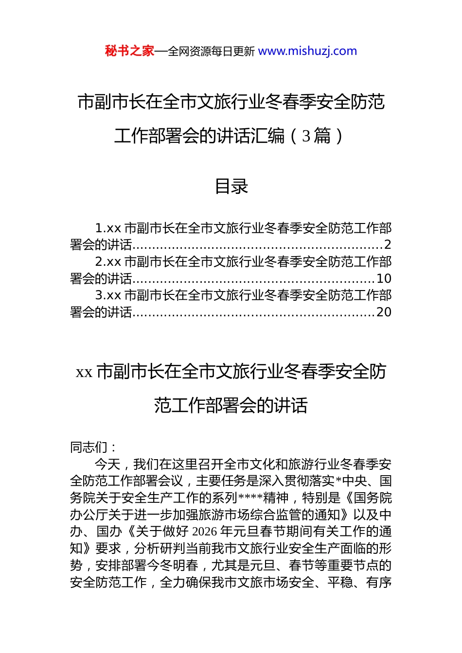 秘书之家—全网资源每日更新 www.mishuzj.com市副市长在全市文旅行业冬春季安全防范工作部署会的讲话汇编(3 篇)目录1.xx 市副市长在全市文旅行业冬春季安全防范工作部署会的讲话...............................................................22.xx 市副市长在全市文旅行业冬春季安全防范工作部署会的讲话.............................................................103.xx 市副市长在全市文旅行业冬春季安全防范工作部署会的讲话.............................................................20xx 市副市长在全市文旅行业冬春季安全防范工作部署会的讲话同志们:今天,我们在这里召开全市文化和旅游行业冬春季安全防范工作部署会议,主要任务是深入贯彻落实*中央、国务院关于安全生产工作的系列****精神,特别是《国务院办公厅关于进一步加强旅游市场综合监管的通知》以及中办、国办《关于做好 2026 年元旦春节期间有关工作的通知》要求,分析研判当前我市文旅行业安全生产面临的形势,安排部署今冬明春,尤其是元旦、春节等重要节点的安全防范工作,全力确保我市文旅市场安全、平稳、有序秘书之家—全网资源每日更新 www.mishuzj.com运行。刚才,xx 同志传达了上级文件精神,听取了部分区的工作汇报,总体上大家做了不少工作,但也必须清醒看到存在的短板和风险。下面,我讲几点意见。一、统一思想、提高站位,深刻认识做好冬春季文旅安全工作的极端重要性安全生产是民生大事,事关人民福祉,事关经济社会发展大局,一丝一毫不能放松。文旅行业是展示城市形象的重要窗口,是满足人民群众美好生活需要的重要领域,同时也是人员密集、活动频繁、风险易发的重点行业。冬春季历来是安全生产的关键期,特别是元旦、春节、元宵等传统节日接踵而至,冰雪旅游、温泉度假、民俗节庆、室内文化活动等供需两旺,群众出游意愿强烈,各类文旅场所人流量将大幅攀升,安全保障压力显著增大。我们必须深刻认识到:第一,这是践行“人民至上、生命至上”理念的直接体现。保障游客和从业人员的生命财产安全,是文旅产业发展的最基本前提和不可逾越的红线。任何一起安全事故都可能对人民群众造成无法挽回的损失,都会严重损害*和政府的形象。我们必须以“时时放心不下”的责任感,把安全防范工作抓实抓细,切实担负起“促一方发展、保一方平安”的政治责任。第二,这是推动文旅产业高质量发展的重要基石。安全是发展的基础,稳定是强盛的前提。没有安全这个“1”,后面再多的“0”也毫无意义。当前,我市文旅市场正处于复苏振兴和提质升级的关键阶段,安全稳定的市场环境是吸引游客、提升消费信心、促进产业可持续发展的根本保障任何安全事故都可能引发连锁反应,冲击市场秩序,影响行业声誉,甚至阻碍整体发展进程。第三,这是应对当前复杂严峻安全形势的迫切需要。综合分析,冬春季我市文旅行业安全风险呈现出一些新特点、新趋势,可以概括为“五个化”:一是旅游井喷的节秘书之家—全网资源每日更新 www.mishuzj.com点化。客流高度集中于节假日,特别是“两节”期间,重点景区、热门街区、大型活动场所可能面临瞬时超大客流压力。二是人员聚集的潮汐化。游客流向呈现明显的潮汐特征,早晚、景区内外、交通枢纽等人流集散地安全管理难度加大。三是安全风险的隐蔽化。除传统的消防、交通设施设备安全风险外,新兴业态带来的新风险、因极端天气(如低温雨雪冰冻)诱发的不确定性风险、因服务质量或纠纷引发的社会风险等交织叠加,识别和防范难度增加四是事故影响的放大化。文旅领域社会关注度高,一旦发生安全事故,极易在短时间内通过网络等渠道迅速传播发酵,形成舆论热点,造成广泛的社会影响,甚至可能影响城市形象。五是整体发展的趋近化。随着区域旅游一体化发展,周边地区发生的重大安全事故也可能对我市产生波及效应,需要我们树立全域安全观,加强联防联控。面对这些特点,全市各级各相关部门必须克服麻痹思想、侥幸心理和厌战情绪,切实增强风险意识、忧患意识和底线思维,把困难估计得更充分一些,把风险思考得更深入一些,把措施制定得更周密一些,全力以赴打好冬...
