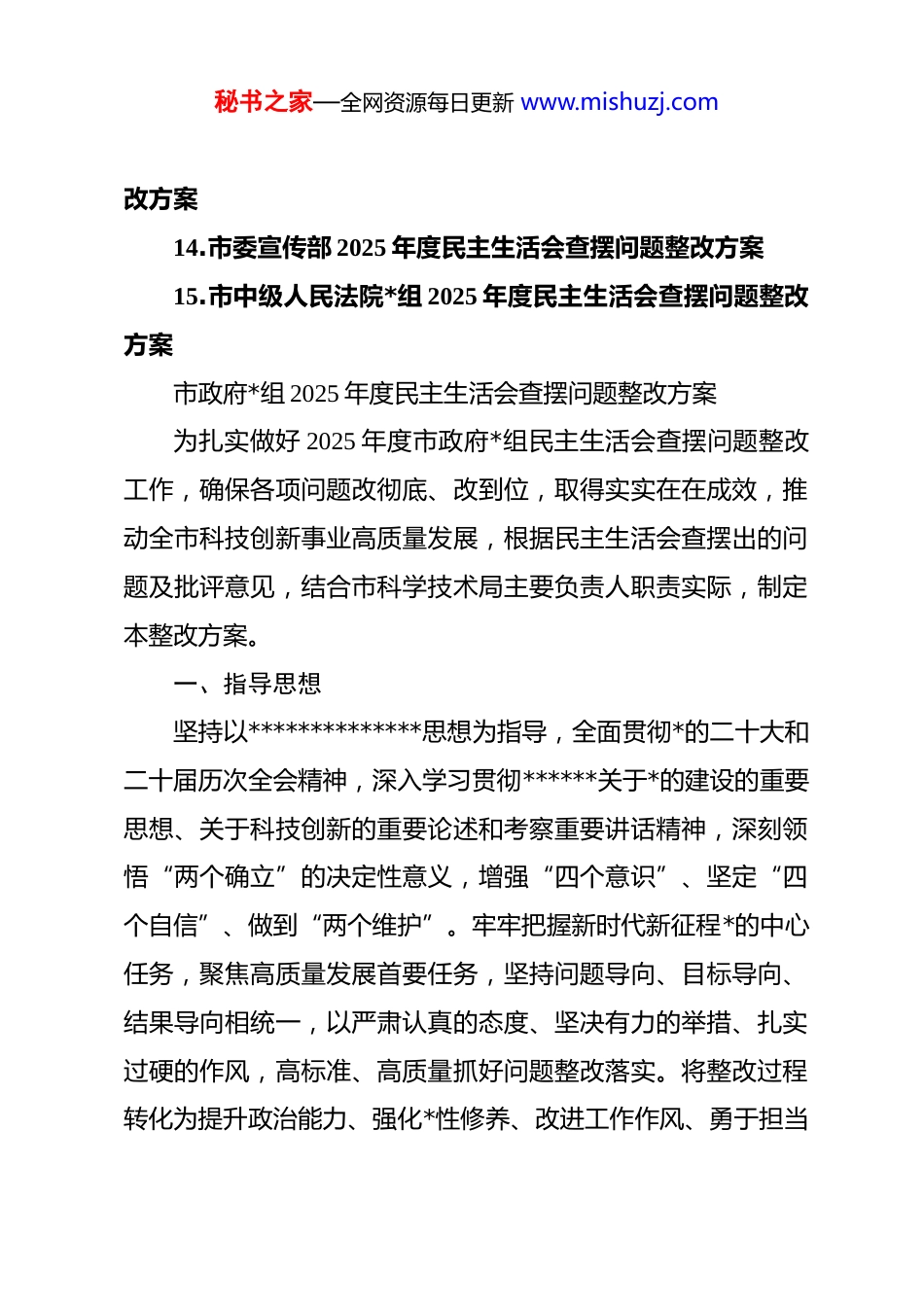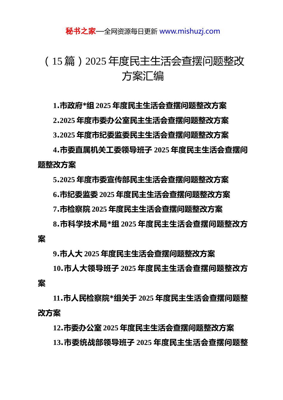 秘书之家—全网资源每日更新 www.mishuzj.com(15 篇)2025 年度民主生活会查摆问题整改方案汇编1.市政府*组 2025 年度民主生活会查摆问题整改方案2.2025 年度市委办公室民主生活会查摆问题整改方案3.2025 年度市纪委监委民主生活会查摆问题整改方案4.市委直属机关工委领导班子 2025 年度民主生活会查摆问题整改方案5.2025 年度市委宣传部民主生活会查摆问题整改方案6.市纪委监委 2025 年度民主生活会查摆问题整改方案7.市检察院 2025 年度民主生活会查摆问题整改方案8.市科学技术局*组 2025 年度民主生活会查摆问题整改方案9.市人大 2025 年度民主生活会查摆问题整改方案10.市人大领导班子 2025 年度民主生活会查摆问题整改方案11.市人民检察院*组关于 2025 年度民主生活会查摆问题整改方案12.市委办公室 2025 年度民主生活会查摆问题整改方案13.市委统战部领导班子 2025 年度民主生活会查摆问题整秘书之家—全网资源每日更新 www.mishuzj.com改方案14.市委宣传部 2025 年度民主生活会查摆问题整改方案15.市中级人民法院*组 2025 年度民主生活会查摆问题整改方案市政府*组 2025 年度民主生活会查摆问题整改方案为扎实做好 2025 年度市政府*组民主生活会查摆问题整改工作,确保各项问题改彻底、改到位,取得实实在在成效,推动全市科技创新事业高质量发展,根据民主生活会查摆出的问题及批评意见,结合市科学技术局主要负责人职责实际,制定本整改方案。一、指导思想坚持以**************思想为指导,全面贯彻*的二十大和二十届历次全会精神,深入学习贯彻******关于*的建设的重要思想、关于科技创新的重要论述和考察重要讲话精神,深刻领悟“两个确立”的决定性意义,增强“四个意识”、坚定“四个自信”、做到“两个维护”。牢牢把握新时代新征程*的中心任务,聚焦高质量发展首要任务,坚持问题导向、目标导向、结果导向相统一,以严肃认真的态度、坚决有力的举措、扎实过硬的作风,高标准、高质量抓好问题整改落实。将整改过程转化为提升政治能力、强化*性修养、改进工作作风、勇于担当秘书之家—全网资源每日更新 www.mishuzj.com作为、扛牢管*治*责任的实际行动,不断巩固拓展 zt 教育成果,为加快建设高水平国家创新型城市、奋力谱写中国式现代化实践新篇章提供坚强政治保证和强大科技支撑。二、整改目标通过集中整改,实现以下目标:一是政治站位实现新提升。市政府*组成员特别是市科技局主要负责人政治判断力、政治领悟力、政治执行力显著增强,自觉在思想上政治上行动上同以***同志为核心的*中央保持高度一致,确保*的路线方针政策和省委、市委决策部署在科技领域不折不扣落地生根。二是理论武装达到新高度。对*的创新理论,特别是关于发展新质生产力、实现高水平科技自立自强等重要论述的理解把握更加系统深入,运用*的科学理论指导科技创新实践、破解发展难题的能力水平切实提升。三是宗旨意识得到新强化。坚持以人民为中心的发展思想更加牢固,服务创新主体、科技人才的意识与能力持续提升,人民群众和科研人员在科技创新领域的获得感、幸福感、安全感更加充实。四是担当作为展现新气象。树立和践行正确政绩观,破解科技体制机制障碍、攻克关键核心技术的锐气和斗志更加昂扬,推动科技创新的思路举措更加精准有效,全市科技创新综合实力稳步提升。五是政治生态呈现新面貌。全面从严治*政治责任压紧压实,领导班子凝聚力战斗力进一步增强,秘书之家—全网资源每日更新 www.mishuzj.com*员干部纪律规矩意识入脑入心,风清气正、干事创业的良好政治生态持续巩固发展。确保在 2025 年 12 月底前完成集中整改,并持续推进长期整改任务,形成常态化长效化机制。三、整改措施针对民主生活会查摆出的突出问题,结合市科学技术局主要负责人工作职责,制定以下整改措施:(一)聚焦强化政治忠诚、提升政治能力方面存在的问题1.深化理论武装固根基,淬炼绝对忠诚政治品格。坚持将学习贯彻**************思想作为首要政治任务和终身课题,每月至少组织 1 次市科技局*组理论学习中心组专题学习,每季度至少开展 1 次交流研讨,原原...
