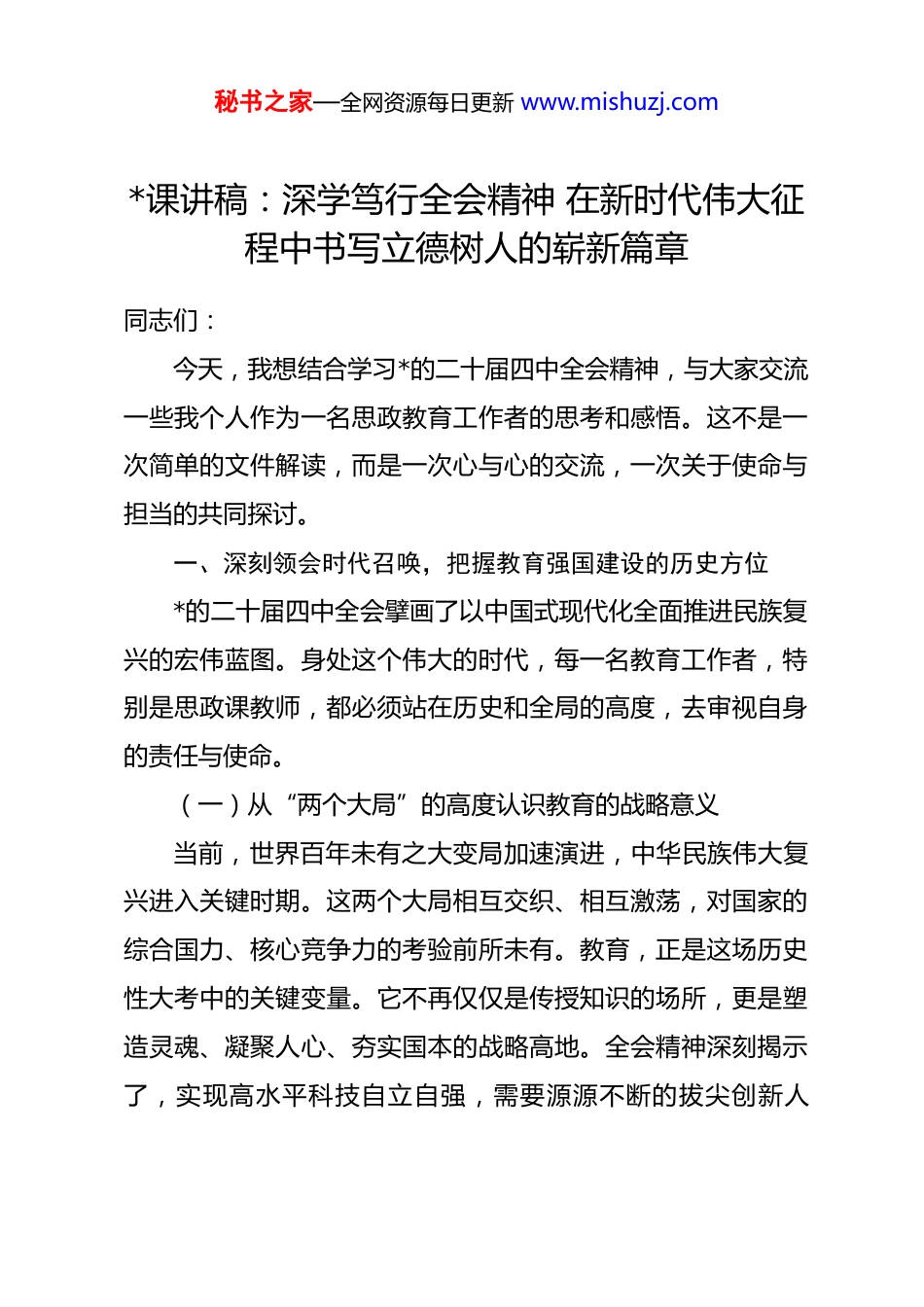 秘书之家—全网资源每日更新 www.mishuzj.com*课讲稿:深学笃行全会精神 在新时代伟大征程中书写立德树人的崭新篇章同志们:今天,我想结合学习*的二十届四中全会精神,与大家交流一些我个人作为一名思政教育工作者的思考和感悟。这不是一次简单的文件解读,而是一次心与心的交流,一次关于使命与担当的共同探讨。一、深刻领会时代召唤,把握教育强国建设的历史方位*的二十届四中全会擘画了以中国式现代化全面推进民族复兴的宏伟蓝图。身处这个伟大的时代,每一名教育工作者,特别是思政课教师,都必须站在历史和全局的高度,去审视自身的责任与使命。(一)从“两个大局”的高度认识教育的战略意义当前,世界百年未有之大变局加速演进,中华民族伟大复兴进入关键时期。这两个大局相互交织、相互激荡,对国家的综合国力、核心竞争力的考验前所未有。教育,正是这场历史性大考中的关键变量。它不再仅仅是传授知识的场所,更是塑造灵魂、凝聚人心、夯实国本的战略高地。全会精神深刻揭示了,实现高水平科技自立自强,需要源源不断的拔尖创新人秘书之家—全网资源每日更新 www.mishuzj.com才;应对复杂严峻的国际意识形态斗争,需要亿万民众坚如磐石的理想信念。这一切的根基,都在于教育,在于培养什么人、怎样培养人、为谁培养人这个根本问题。因此,从事教育事业,尤其是在思政教育的第一线,绝非一份普通的职业,而是在为国家的长治久安与民族的未来发展筑基垒台,其意义重大,责任如山。(二)从中国式现代化的全局把握教育的核心地位中国式现代化,是人口规模巨大的现代化,是全体人民共同富裕的现代化,是物质文明和精神文明相协调的现代化,是人与自然和谐共生的现代化,是走和平发展道路的现代化。这五个特征,每一个都与教育息息相关。没有高素质的国民,人口规模的优势就无法转化为发展优势;没有教育公平与质量的提升,共同富裕就缺少了重要的实现路径;没有精神文明的极大丰富,物质文明的成果就会黯然失色。全会强调,要加快建设教育强国,正是把教育摆在了中国式现代化建设中先导性、基础性、全局性的位置。作为思政教育工作者,就是要引导青年一代深刻理解中国式现代化的理论内涵与实践要求,让他们明白,自己未来的个人发展,与国家现代化的宏伟进程是紧密相连、同频共振的。(三)从维护国家安全的维度审视教育的特殊使命秘书之家—全网资源每日更新 www.mishuzj.com全会公报中,“安全”是高频词。国家安全是民族复兴的根基,而意识形态安全是国家安全的“压舱石”。当今世界,思想文化的交流、交融、交锋日趋激烈,没有硝烟的战场同样惊心动魄。青年学生正处在价值观形成和确立的关键时期,他们是各种社会思潮影响和争取的重要对象。思政课的主阵地,守住了,就能为青年学生的思想打好底色、筑牢防线,培养出具有高度政治鉴别力和坚定制度自信的可靠接班人。反之,如果这块阵地失守,后果不堪设想。所以,讲好每一堂思政课,都不是在完成一项单纯的教学任务,而是在参与一场没有硝烟的伟大斗争,是在为国家的思想根基、为民族的精神长城添砖加瓦。这份使命,无比特殊,也无比光荣。二、坚守立德树人初心,回答好“为谁培养人”的根本问题作为**思政教育学院的一名*员和负责人,我时常在想,学院的名字本身就赋予了我们特殊的精神传承。先辈们在风雨如晦的年代,为探寻救国救民的真理而奔走呼号,他们心中燃烧的,正是对国家、对人民最深沉的爱与责任。今天,我们接过历史的接力棒,就是要用同样的赤诚之心,去回答好“为谁培养人”这个时代课题。(一)坚定理想信念是育人之本秘书之家—全网资源每日更新 www.mishuzj.com育人的根本,在于育心铸魂。一个人如果没有坚定的理想信念,知识再多,本领再强,也可能迷失方向,甚至走上歧途。我们的教育,就是要旗帜鲜明地引导学生坚定对马克思主义的信仰、对中国特色社会主义的信念、对实现中华民族伟大复兴中国梦的信心。这并非空洞的说教,而是要将宏大的理论,转化为学生能够理解、能够认同、能够内化于心的道理。要讲清楚中国共产*为什么能、马克思主义为什么行、中国特色社会主义为什么好。我常常对我们的老...
