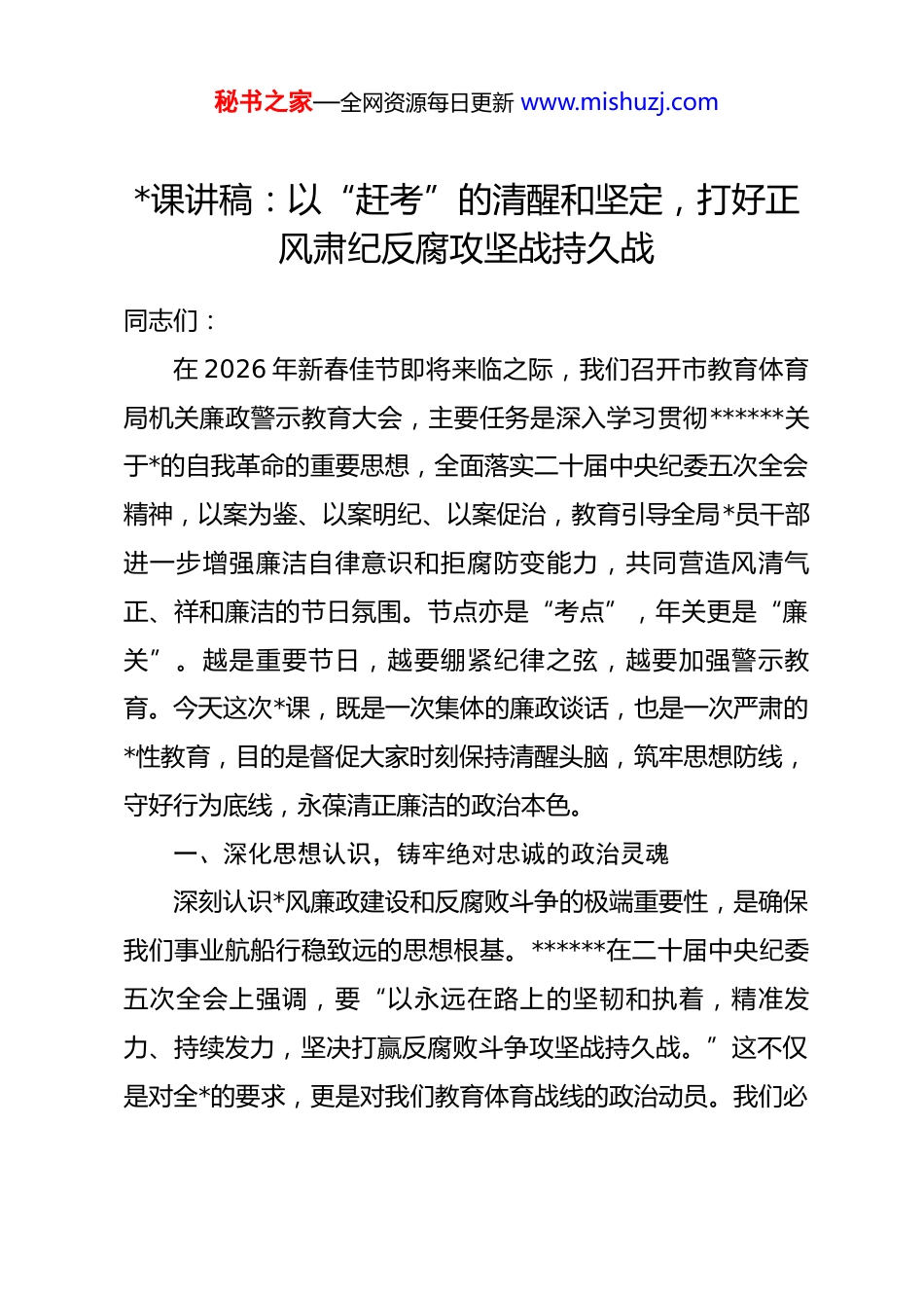 秘书之家—全网资源每日更新 www.mishuzj.com*课讲稿:以“赶考”的清醒和坚定,打好正风肃纪反腐攻坚战持久战同志们:在 2026 年新春佳节即将来临之际,我们召开市教育体育局机关廉政警示教育大会,主要任务是深入学习贯彻******关于*的自我革命的重要思想,全面落实二十届中央纪委五次全会精神,以案为鉴、以案明纪、以案促治,教育引导全局*员干部进一步增强廉洁自律意识和拒腐防变能力,共同营造风清气正、祥和廉洁的节日氛围。节点亦是“考点”,年关更是“廉关”。越是重要节日,越要绷紧纪律之弦,越要加强警示教育。今天这次*课,既是一次集体的廉政谈话,也是一次严肃的*性教育,目的是督促大家时刻保持清醒头脑,筑牢思想防线,守好行为底线,永葆清正廉洁的政治本色。一、深化思想认识,铸牢绝对忠诚的政治灵魂深刻认识*风廉政建设和反腐败斗争的极端重要性,是确保我们事业航船行稳致远的思想根基。******在二十届中央纪委五次全会上强调,要“以永远在路上的坚韧和执着,精准发力、持续发力,坚决打赢反腐败斗争攻坚战持久战。”这不仅是对全*的要求,更是对我们教育体育战线的政治动员。我们必秘书之家—全网资源每日更新 www.mishuzj.com须从政治高度审视自身肩负的立德树人、为国育才的神圣使命,深刻理解廉洁从政是履行职责使命的必然要求,是维护教育公平、体育精神的底线红线。当前,教育改革进入深水区,体育发展面临新任务,越是任务繁重,越要加强*的建设,越要狠抓*风廉政建设。唯有铸牢政治忠诚,夯实思想根基,才能确保*的教育方针和体育政策不折不扣落到实处,才能办好人民满意的教育和体育事业。(一)坚持政治引领,把稳理想信念“定盘星”。坚定的理想信念是共产*人的精神支柱和政治灵魂,是抵御各种诱惑、经受任何考验的“压舱石”。******深刻指出,“一个干部只有把世界观、人生观、价值观的总开关拧紧了,把思想觉悟、精神境界提高了,才能从不敢腐到不想腐。”对于教育体育工作者而言,理想信念不仅关乎个人修养,更直接关系到“培养什么人、怎样培养人、为谁培养人”的根本问题。必须将强化理论武装作为终身课题,持续深入学习*的创新理论,特别是关于教育、体育的重要论述,掌握其核心要义和精神实质,用以武装头脑、指导实践、推动工作。要通过深入学习,不断提高政治判断力、政治领悟力、政治执行力,自觉在思想上政治上行动上同*中央保持高度一致,确保*的路线方针政策在教育体育领域得到全面贯彻。要深刻认识到,我们所从事的每一项工秘书之家—全网资源每日更新 www.mishuzj.com作都具有鲜明的政治属性,无论是制定政策、分配资源,还是管理学校、举办赛事,都必须首先从政治上看,从做到“两个维护”的高度去把握。要将理想信念教育融入日常、抓在经常,通过严肃认真的*内政治生活锤炼*性,通过深入细致的思政工作涤荡灵魂,引导广大干部教师不忘立德树人初心,牢记为*育人、为国育才使命,自觉做中国特色社会主义的坚定信仰者和忠实实践者,以自身的清正廉洁守护教育体育领域的政治生态和育人环境。(二)严守纪律规矩,拉直 dj 国法“标准线”。d 的纪律规矩是*的生命线,是*员干部必须遵守的行为准则。******反复强调,“要加强纪律教育,使铁的纪律转化为*员、干部的日常习惯和自觉遵循。”教育体育系统不是“无菌区”“真空层”,同样面临着各种风险和考验。必须把学习遵守*章*规 dj和国家法律法规作为基础性、经常性工作,让*员干部知敬畏、存戒惧、守底线。要重点强化政治纪律和组织纪律,带动廉洁纪律、群众纪律、工作纪律、生活纪律全面严起来。要教育引导干部教师深刻理解,遵守纪律规矩不是束缚手脚,而是干事创业的“安全阀”和“护身符”。在项目审批、招生考试、职称评定、经费使用、场馆运营、赛事举办、器材采购等关键环节,必须严格按制度、按程序、按规矩办事,决不允许搞变秘书之家—全网资源每日更新 www.mishuzj.com通、打折扣、作选择。要牢固树立法治思维和制度意识,自觉尊法学法守法用法,坚持依法决策、依法行政、依法治教、依法治体。要清醒认识到,权力是*和人民赋予的,只能用来为公为民,决不...