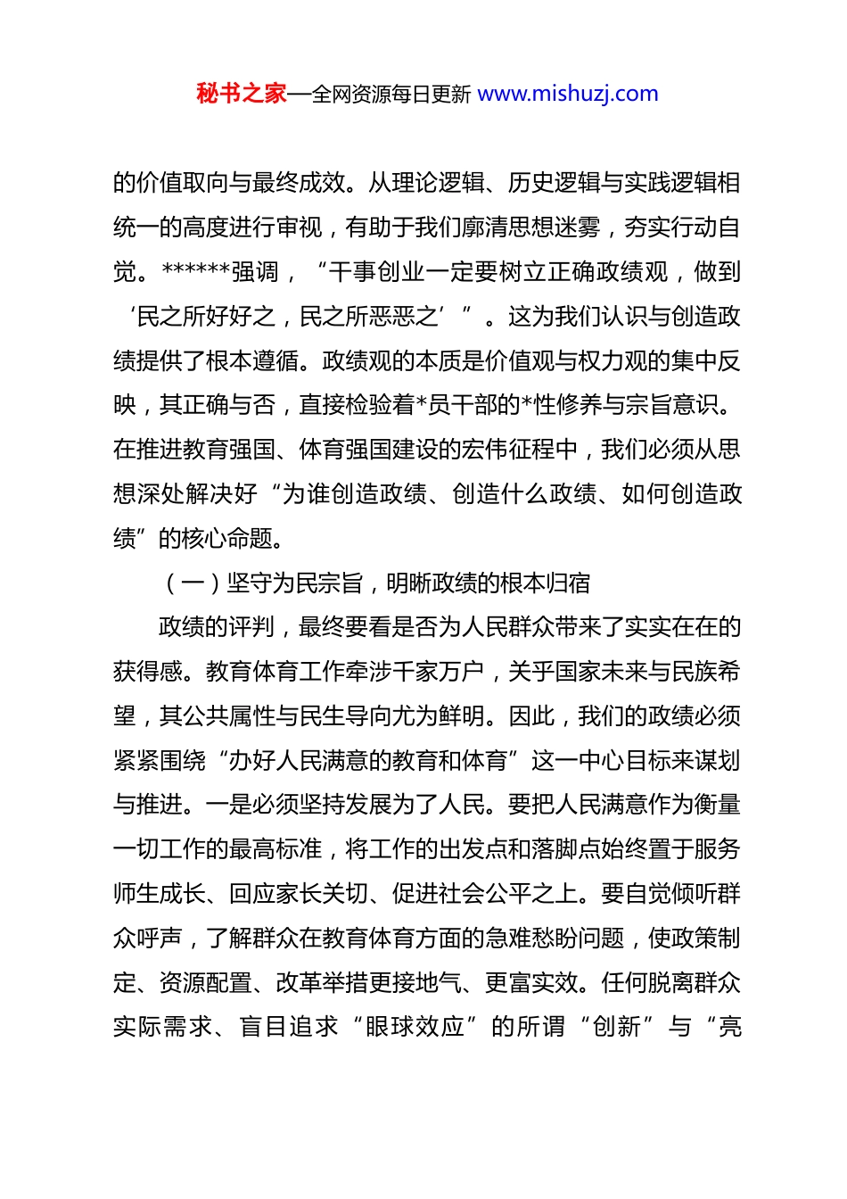 秘书之家—全网资源每日更新 www.mishuzj.com*课讲稿:以赶考永远在路上的清醒坚定,奋力书写立德树人崭新答卷同志们:在新春佳节即将来临之际,我们召开局机关全体干部廉政警示教育大会,这既是深化全面从严治*、加强廉洁文化建设的规定动作,也是巩固拓展 zt 教育成果、激励干部担当作为的重要举措。节点就是考点,年关亦是廉关。越是关键时刻,越要绷紧纪律之弦、筑牢思想之堤。本次*课的核心主题是“树立和践行正确政绩观”,旨在引导大家深刻把握“政绩为谁而树、树什么样的政绩、靠什么树政绩”这一根本问题,将正确的权力观、事业观、发展观融入教育体育工作的全过程各方面,以更加务实的作风、更加清廉的形象、更加优异的成绩,迎接新的一年。******深刻指出,“树立和践行正确政绩观,起决定性作用的是*性。”我们必须牢记,只有*性坚强、摒弃私心杂念,才能保证政绩观不出偏差,才能创造出经得起实践、人民、历史检验的实绩。一、深刻把握核心要义,筑牢正确政绩观的思想根基理解正确政绩观的丰富内涵与时代要求,是我们践行的前提。这不仅关系到个人成长方向,更决定了我们教育事业发展秘书之家—全网资源每日更新 www.mishuzj.com的价值取向与最终成效。从理论逻辑、历史逻辑与实践逻辑相统一的高度进行审视,有助于我们廓清思想迷雾,夯实行动自觉。******强调,“干事创业一定要树立正确政绩观,做到‘民之所好好之,民之所恶恶之’”。这为我们认识与创造政绩提供了根本遵循。政绩观的本质是价值观与权力观的集中反映,其正确与否,直接检验着*员干部的*性修养与宗旨意识。在推进教育强国、体育强国建设的宏伟征程中,我们必须从思想深处解决好“为谁创造政绩、创造什么政绩、如何创造政绩”的核心命题。(一)坚守为民宗旨,明晰政绩的根本归宿政绩的评判,最终要看是否为人民群众带来了实实在在的获得感。教育体育工作牵涉千家万户,关乎国家未来与民族希望,其公共属性与民生导向尤为鲜明。因此,我们的政绩必须紧紧围绕“办好人民满意的教育和体育”这一中心目标来谋划与推进。一是必须坚持发展为了人民。要把人民满意作为衡量一切工作的最高标准,将工作的出发点和落脚点始终置于服务师生成长、回应家长关切、促进社会公平之上。要自觉倾听群众呼声,了解群众在教育体育方面的急难愁盼问题,使政策制定、资源配置、改革举措更接地气、更富实效。任何脱离群众实际需求、盲目追求“眼球效应”的所谓“创新”与“亮秘书之家—全网资源每日更新 www.mishuzj.com点”,都不是真正的政绩。二是必须坚持发展依靠人民。要尊重人民群众在教育体育实践中的主体地位和首创精神,善于从基层一线汲取智慧,从生动实践中总结经验。在推动教育改革、完善体育公共服务体系等过程中,要充分调动学校、教师、学生、家长及社会各界的积极性、主动性、创造性,形成共建共享的良好格局。政绩的创造,是集体智慧的结晶,而非个人能力的独舞。三是必须坚持发展成果由人民共享。要着力破解教育发展不平衡不充分问题,推动优质教育资源扩容下沉,促进基本公共体育服务均等化,让每一个孩子都能享有公平而有质量的教育,让每一位市民都能享有便捷而高效的体育服务。要持续在缩小城乡、区域、校际差距上下功夫,在关爱特殊群体、完善资助体系上出实招,确保发展成果更多更公平惠及全体人民。******要求,“把惠民生、暖民心、顺民意的工作做到群众心坎上”。我们的政绩,就应体现为人民群众在教育体育领域幸福感、满意度的切实提升。(二)遵循客观规律,把握政绩的科学内涵教育工作具有基础性、先导性、全局性地位,体育工作关乎人民健康与精神塑造,二者均有其内在的发展规律。树立正确政绩观,必须深刻认识、自觉遵循这些规律,克服急功近利、揠苗助长的短视行为。一是必须遵循人才成长与教育教学秘书之家—全网资源每日更新 www.mishuzj.com规律。教育是静待花开的艺术,具有长期性、渐进性、潜在性特点。要坚决破除“唯分数、唯升学、唯文凭、唯论文、唯帽子”的顽瘴痼疾,建立健全促进学生全面发展、健康成长的科学评价体系。要尊重学生个体差异,因材施教,为不同禀赋的学生...