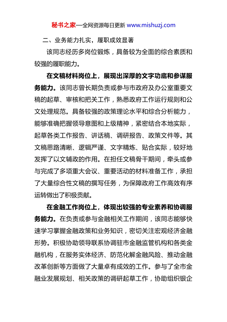 秘书之家—全网资源每日更新 www.mishuzj.com关于 XXX 同志的现实表现材料XXX,男,汉族,中共党员,XXXX 年 XX 月出生XXXX 年 XX 月参加工作,XXXX 年 XX 月加入中国共产党,大学学历,现任 XX 市人民政府办公室 XX 科科长。该同志历经文稿材料、金融、人事、文书等多岗位锻炼,政治素质好,业务能力全面,工作作风扎实,现实表现如下:一、政治立场坚定,党性修养过硬该同志始终把讲政治摆在首位,能够自觉运用党的创新理论武装头脑、指导实践、推动工作。坚持深入学习贯彻习近平新时代中国特色社会主义思想,深刻领悟“两个确立”的决定性意义,增强“四个意识”、坚定“四个自信”、做到“两个维护”。在大是大非面前头脑清醒,立场坚定,自觉在思想上政治上行动上同党中央保持高度一致,坚决贯彻执行党的路线方针政策和上级党委、政府的决策部署。注重党性锻炼,积极参加党内政治生活,严格遵守党的政治纪律和政治规矩,在大局下思考、在大局下行动,确保了各项工作沿着正确的政治方向推进。能够将理论学习成果转化为推动工作的实际能力,善于从政治高度思考和处理问题,体现了较高的政治判断力、政治领悟力、政治执行力。秘书之家—全网资源每日更新 www.mishuzj.com二、业务能力扎实,履职成效显著该同志经历多岗位锻炼,具备较为全面的综合素质和较强的履职能力。在文稿材料岗位上,展现出深厚的文字功底和参谋服务能力。该同志曾长期负责或参与市政府及办公室重要文稿的起草、审核和把关工作,熟悉政府工作运行规则和公文处理规范。具备较强的政策理论水平和综合分析能力,能够准确把握领导意图和上级精神,紧密结合本地实际,起草各类工作报告、讲话稿、调研报告、政策文件等。其文稿思路清晰、逻辑严谨、文字精炼、贴合实际,较好地发挥了以文辅政的作用。在担任文稿骨干期间,牵头或参与完成了多项重大会议、重要活动的材料准备工作,承担了大量综合性文稿的撰写任务,为保障政府工作高效有序运转做出了积极贡献。在金融工作岗位上,体现出较强的专业素养和协调服务能力。在负责或参与金融相关工作期间,该同志能够快速学习掌握金融政策和业务知识,密切关注宏观经济金融形势。积极协助领导联系协调驻市金融监管机构和各类金融机构,在服务实体经济、防范化解金融风险、推动金融改革创新等方面做了大量卓有成效的工作。参与了全市金融业发展规划、相关政策的调研起草工作,协助组织银企秘书之家—全网资源每日更新 www.mishuzj.com对接活动,在优化金融生态环境、引导金融资源支持地方重点项目建设和小微企业发展等方面发挥了积极作用。具备较强的风险意识和应对能力,在处置相关金融风险隐患时,能够提出建设性意见,为维护区域金融稳定贡献了力量。在人事工作岗位上,表现出较强的原则性和组织协调能力。该同志在承担人事相关工作期间,能够认真贯彻执行党的干部路线和人事工作政策法规,坚持原则,公道正派。熟悉干部选拔任用、考核奖惩、教育培训、工资福利等方面的业务流程。在办公室内部人事管理、干部队伍建设等方面,能够细致做好基础工作,协助领导加强干部日常管理和监督,参与组织干部考察、年度考核等工作。注重沟通协调,能够耐心做好干部的思想政治工作,积极帮助解决实际困难,在营造和谐稳定、积极向上的人事工作氛围方面发挥了较好作用。在文书工作岗位上,展现出严谨细致和高效规范的工作作风。该同志熟悉收发文办理、印信管理、档案管理、机要保密等文书工作的各个环节,能够严格按照规章制度办事,确保公文运转高效、准确、安全、保密。工作责任心强,注重细节,在处理大量日常公文时能够做到有条不紊、及时准确。积极推动办公自动化应用,提高了文书处秘书之家—全网资源每日更新 www.mishuzj.com理效率。在保障政府指令畅通、信息上传下达方面起到了重要的枢纽作用。三、工作勤勉务实,担当精神可嘉该同志具有强烈的事业心和责任感,工作态度端正,勤奋敬业,甘于奉献。无论在任何岗位,都能够全身心投入,做到干一行、爱一行、钻一行。面对繁重的工作任务能够主动担当,迎难而上,经常加班加点,毫无怨言。在工作中注重实效...
