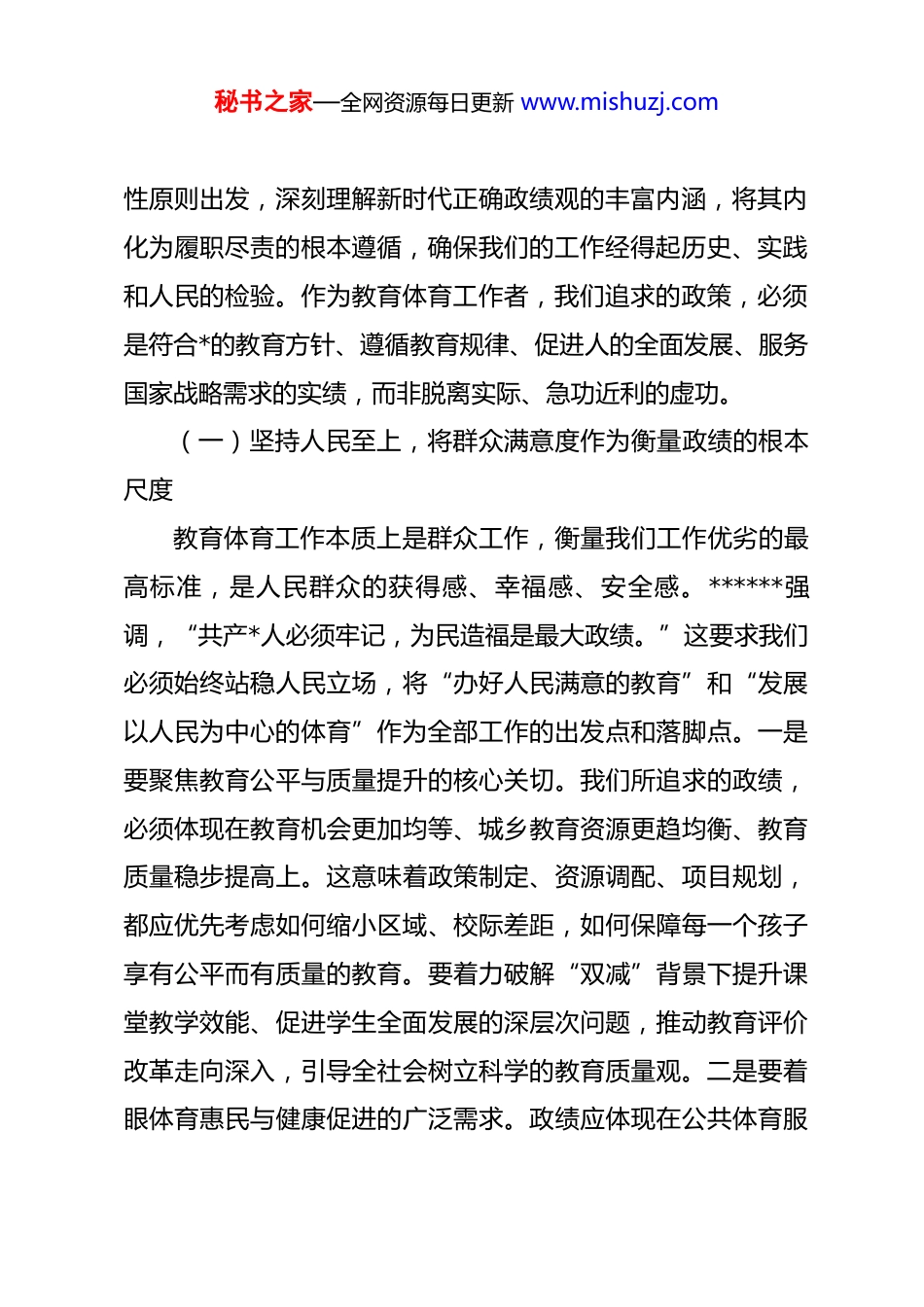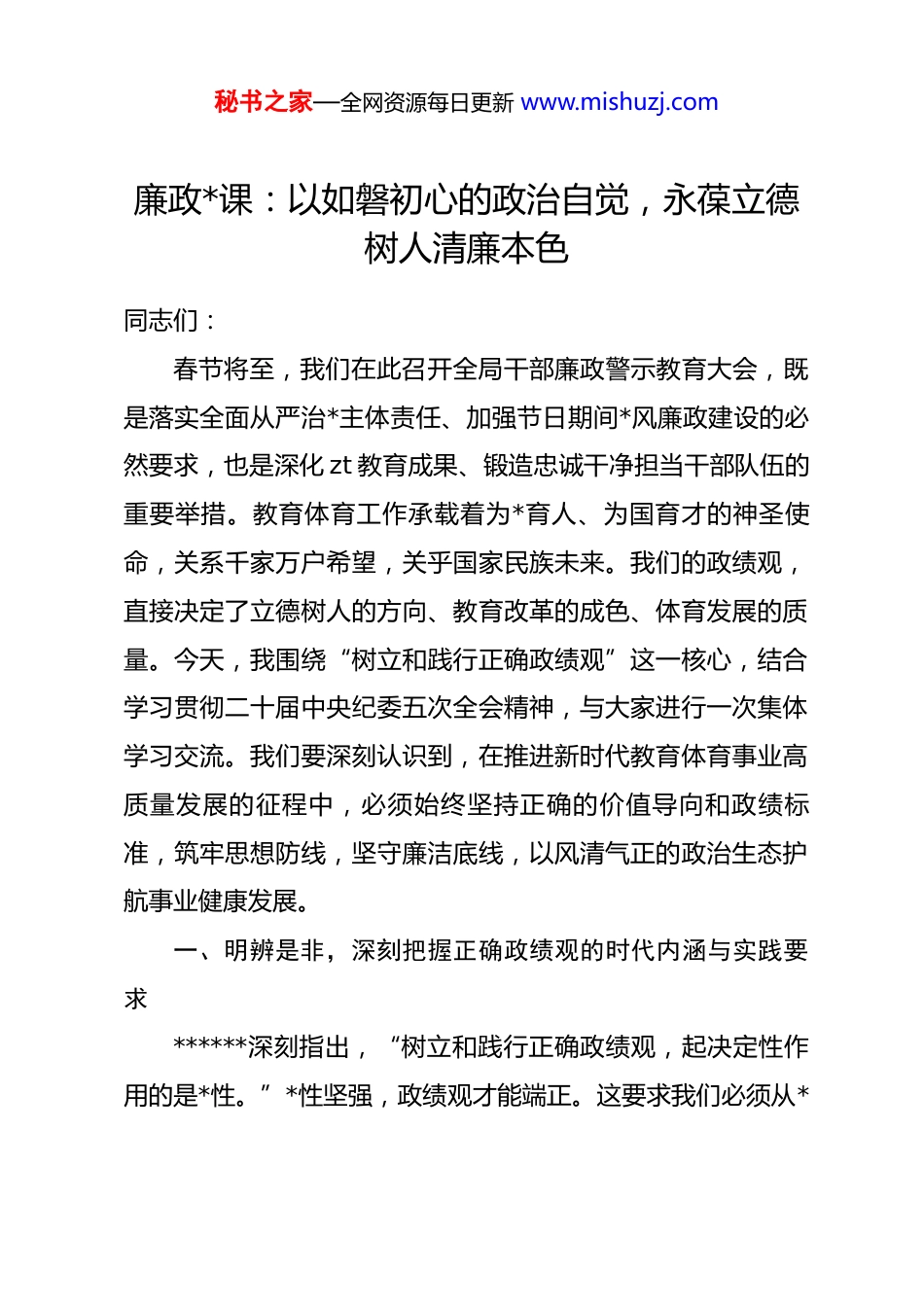 秘书之家—全网资源每日更新 www.mishuzj.com廉政*课:以如磐初心的政治自觉,永葆立德树人清廉本色同志们:春节将至,我们在此召开全局干部廉政警示教育大会,既是落实全面从严治*主体责任、加强节日期间*风廉政建设的必然要求,也是深化 zt 教育成果、锻造忠诚干净担当干部队伍的重要举措。教育体育工作承载着为*育人、为国育才的神圣使命,关系千家万户希望,关乎国家民族未来。我们的政绩观,直接决定了立德树人的方向、教育改革的成色、体育发展的质量。今天,我围绕“树立和践行正确政绩观”这一核心,结合学习贯彻二十届中央纪委五次全会精神,与大家进行一次集体学习交流。我们要深刻认识到,在推进新时代教育体育事业高质量发展的征程中,必须始终坚持正确的价值导向和政绩标准,筑牢思想防线,坚守廉洁底线,以风清气正的政治生态护航事业健康发展。一、明辨是非,深刻把握正确政绩观的时代内涵与实践要求******深刻指出,“树立和践行正确政绩观,起决定性作用的是*性。”*性坚强,政绩观才能端正。这要求我们必须从*秘书之家—全网资源每日更新 www.mishuzj.com性原则出发,深刻理解新时代正确政绩观的丰富内涵,将其内化为履职尽责的根本遵循,确保我们的工作经得起历史、实践和人民的检验。作为教育体育工作者,我们追求的政策,必须是符合*的教育方针、遵循教育规律、促进人的全面发展、服务国家战略需求的实绩,而非脱离实际、急功近利的虚功。(一)坚持人民至上,将群众满意度作为衡量政绩的根本尺度教育体育工作本质上是群众工作,衡量我们工作优劣的最高标准,是人民群众的获得感、幸福感、安全感。******强调,“共产*人必须牢记,为民造福是最大政绩。”这要求我们必须始终站稳人民立场,将“办好人民满意的教育”和“发展以人民为中心的体育”作为全部工作的出发点和落脚点。一是要聚焦教育公平与质量提升的核心关切。我们所追求的政绩,必须体现在教育机会更加均等、城乡教育资源更趋均衡、教育质量稳步提高上。这意味着政策制定、资源调配、项目规划,都应优先考虑如何缩小区域、校际差距,如何保障每一个孩子享有公平而有质量的教育。要着力破解“双减”背景下提升课堂教学效能、促进学生全面发展的深层次问题,推动教育评价改革走向深入,引导全社会树立科学的教育质量观。二是要着眼体育惠民与健康促进的广泛需求。政绩应体现在公共体育服秘书之家—全网资源每日更新 www.mishuzj.com务体系更加完善、全民健身活动更加普及、青少年体质健康水平持续提升上。我们的工作重点应是建好群众身边的体育场地设施,组织好群众喜闻乐见的体育赛事活动,推动体教融合、体卫融合走深走实,让体育更好地服务健康中国战略和人民群众高品质生活需求。三是要回应师生、家长、社会的热点难点问题。政绩应体现在对学位供给、校园安全、师德师风、招生考试、体育场馆开放等社会高度关注问题的有效回应和切实解决上。必须坚持问题导向,深入基层一线调研,倾听真实声音,将解决群众的急难愁盼作为我们工作的着力点,用扎实的行动和实际的成效赢得群众的信任与支持。(二)遵循客观规律,将科学发展作为创造政绩的基本路径教育是慢的艺术,体育是系统工程,有其内在的规律性。树立正确政绩观,必须尊重规律、实事求是,坚决反对脱离实际、盲目蛮干。******要求,“谋划事业、制定政策、推进工作,要遵循客观规律,坚持一切从实际出发。”这警示我们,任何急功近利、违背规律的“政绩”,最终都会损害事业根基。一是要遵循学生身心成长规律和教育教学规律。教育政策的制定、教学改革的推进、育人方式的选择,都必须建立在对不同年龄段学生认知特点、心理发展阶段的科学认知基础上。秘书之家—全网资源每日更新 www.mishuzj.com要摒弃“唯分数”“唯升学”的短视行为,着力构建德智体美劳全面培养的教育体系,注重因材施教,激发学生内在潜能,培养创新精神和实践能力。要尊重教师专业自主权,为教师潜心育人创造良好环境,避免不必要的行政干扰和形式主义负担。二是要遵循体育人才培养和竞技体育发展规律。优秀运动员的成长周期漫长,需要科学选材、系统训练、文化教...