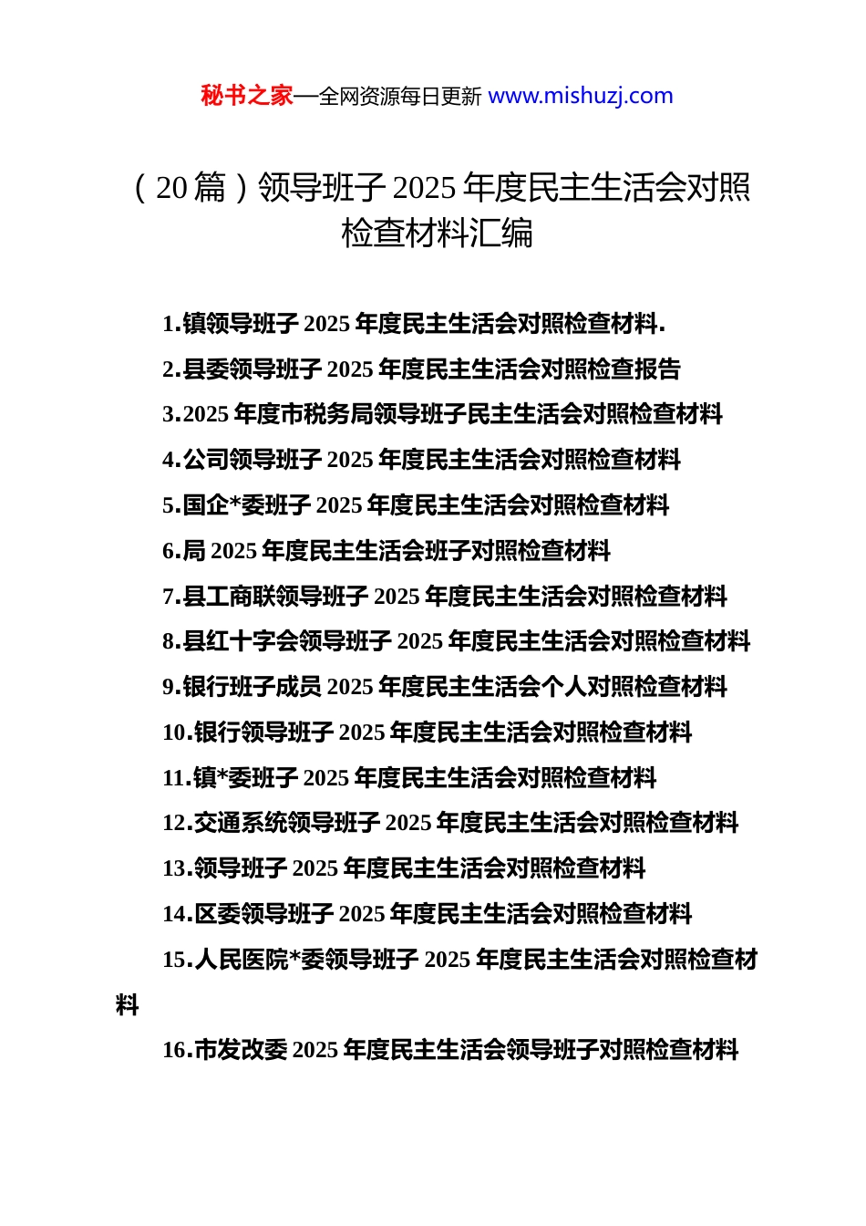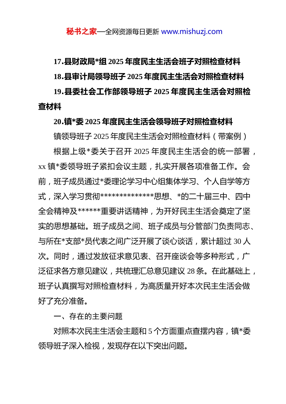秘书之家—全网资源每日更新 www.mishuzj.com(20 篇)领导班子 2025 年度民主生活会对照检查材料汇编1.镇领导班子 2025 年度民主生活会对照检查材料.2.县委领导班子 2025 年度民主生活会对照检查报告3.2025 年度市税务局领导班子民主生活会对照检查材料4.公司领导班子 2025 年度民主生活会对照检查材料5.国企*委班子 2025 年度民主生活会对照检查材料6.局 2025 年度民主生活会班子对照检查材料7.县工商联领导班子 2025 年度民主生活会对照检查材料8.县红十字会领导班子 2025 年度民主生活会对照检查材料9.银行班子成员 2025 年度民主生活会个人对照检查材料10.银行领导班子 2025 年度民主生活会对照检查材料11.镇*委班子 2025 年度民主生活会对照检查材料12.交通系统领导班子 2025 年度民主生活会对照检查材料13.领导班子 2025 年度民主生活会对照检查材料14.区委领导班子 2025 年度民主生活会对照检查材料15.人民医院*委领导班子 2025 年度民主生活会对照检查材料16.市发改委 2025 年度民主生活会领导班子对照检查材料秘书之家—全网资源每日更新 www.mishuzj.com17.县财政局*组 2025 年度民主生活会班子对照检查材料18.县审计局领导班子 2025 年度民主生活会对照检查材料19.县委社会工作部领导班子 2025 年度民主生活会对照检查材料20.镇*委 2025 年度民主生活会领导班子对照检查材料镇领导班子 2025 年度民主生活会对照检查材料(带案例)根据上级*委关于召开 2025 年度民主生活会的统一部署,xx 镇*委领导班子紧扣会议主题,扎实开展各项准备工作。会前,班子成员通过*委理论学习中心组集体学习、个人自学等方式,深入学习贯彻**************思想、*的二十届三中、四中全会精神及******重要讲话精神,为开好民主生活会奠定了坚实的思想基础。班子成员之间、班子成员与分管部门负责同志、与所在*支部*员代表之间广泛开展了谈心谈话,累计超过 30 人次。同时,通过发放征求意见表、召开座谈会等多种形式,广泛征求各方意见建议,共梳理汇总意见建议 28 条。在此基础上,班子认真撰写对照检查材料,为高质量开好本次民主生活会做好了充分准备。一、存在的主要问题对照本次民主生活会主题和 5 个方面重点查摆内容,镇*委领导班子深入检视,发现存在以下突出问题。秘书之家—全网资源每日更新 www.mishuzj.com(一)在带头强化政治忠诚、提高政治能力方面一是应对复杂局面的政治敏锐性不够强。面对意识形态领域的新挑战和经济社会发展中的新矛盾,班子在某些时刻的政治判断力、政治领悟力存在短板。2025 年 6 月,在处理与邻县xx 镇因跨界河道清淤引发的群众纠纷时,班子初期的应对措施仅停留在技术层面,未能从维护区域稳定和社会和谐的政治高度迅速决策,导致事件发酵,比预定时间晚了 2 天才向上级部门进行专题汇报,暴露出在突发事件面前政治站位不高、大局意识不强的问题。二是贯彻*中央决策部署的穿透力不够深。在执行中央关于绿色发展的重大决策部署上,存在“上热中温下冷”的现象。例如,为响应国家“双碳”目标,我镇规划了总装机容量 5 兆瓦的分布式光伏发电项目。但截至 2025 年底,仅完成 3 兆瓦的装机并网任务,完成率仅为 60%。究其原因,在于班子对项目实施的复杂性预估不足,对涉及的土地流转、电网接入等关键环节,前期调研不深不透,统筹协调力度不够,导致政策红利未能及时充分释放。三是严守政治纪律规矩的自觉性不够牢。班子成员能够在大是大非问题上保持清醒,但对一些“小节”“小事”上的政治要求认识不够深刻。在 2025 年下半年一次关于镇属企业负责人的人事酝酿过程中,个别班子成员在*委正式讨论前,通过非正式渠道相互通气、交换意见,秘书之家—全网资源每日更新 www.mishuzj.com虽然未影响最终的组织决定,但这种做法在一定程度上削弱了*委集体领导的严肃性和规范性,是政治纪律和政治规矩意识不强的具体表现。(二)在带头固本培元、增强*性方面一是理论学习往深里走、往实里走不够。班子理论学习存在表面化、形式化倾向,满足于“学过了”“读过了”,但在真学真懂、真...
