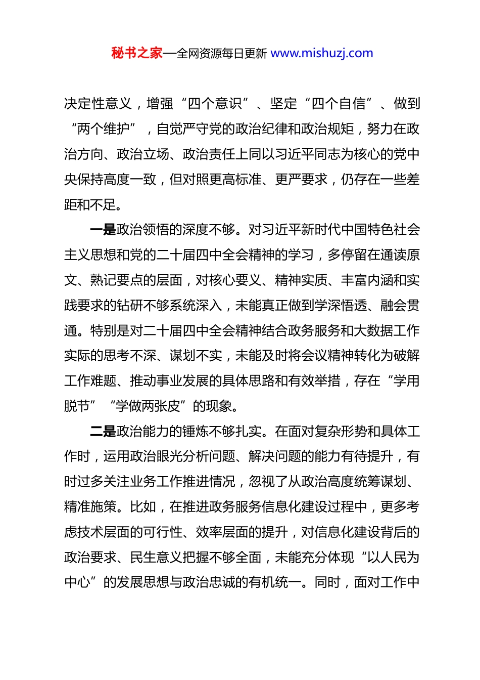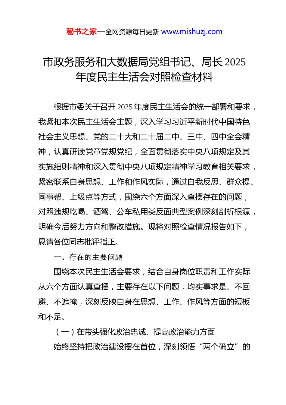 秘书之家—全网资源每日更新 www.mishuzj.com市政务服务和大数据局党组书记、局长 2025年度民主生活会对照检查材料 根据市委关于召开 2025 年度民主生活会的统一部署和要求,我紧扣本次民主生活会主题,深入学习习近平新时代中国特色社会主义思想、党的二十大和二十届二中、三中、四中全会精神,认真研读党章党规党纪,全面贯彻落实中央八项规定及其实施细则精神和深入贯彻中央八项规定精神学习教育相关要求,紧密联系自身思想、工作和作风实际,通过自我反思、群众提、同事帮、上级点等方式,围绕六个方面深入查摆存在的问题,对照违规吃喝、酒驾、公车私用类反面典型案例深刻剖析根源,明确今后努力方向和整改措施。现将对照检查情况报告如下,恳请各位同志批评指正。一、存在的主要问题围绕本次民主生活会要求,结合自身岗位职责和工作实际从六个方面认真查摆,主要存在以下问题,均实事求是、不回避、不遮掩,深刻反映自身在思想、工作、作风等方面的短板和不足。(一)在带头强化政治忠诚、提高政治能力方面始终坚持把政治建设摆在首位,深刻领悟“两个确立”的秘书之家—全网资源每日更新 www.mishuzj.com决定性意义,增强“四个意识”、坚定“四个自信”、做到“两个维护”,自觉严守党的政治纪律和政治规矩,努力在政治方向、政治立场、政治责任上同以习近平同志为核心的党中央保持高度一致,但对照更高标准、更严要求,仍存在一些差距和不足。一是政治领悟的深度不够。对习近平新时代中国特色社会主义思想和党的二十届四中全会精神的学习,多停留在通读原文、熟记要点的层面,对核心要义、精神实质、丰富内涵和实践要求的钻研不够系统深入,未能真正做到学深悟透、融会贯通。特别是对二十届四中全会精神结合政务服务和大数据工作实际的思考不深、谋划不实,未能及时将会议精神转化为破解工作难题、推动事业发展的具体思路和有效举措,存在“学用脱节”“学做两张皮”的现象。二是政治能力的锤炼不够扎实。在面对复杂形势和具体工作时,运用政治眼光分析问题、解决问题的能力有待提升,有时过多关注业务工作推进情况,忽视了从政治高度统筹谋划、精准施策。比如,在推进政务服务信息化建设过程中,更多考虑技术层面的可行性、效率层面的提升,对信息化建设背后的政治要求、民生意义把握不够全面,未能充分体现“以人民为中心”的发展思想与政治忠诚的有机统一。同时,面对工作中秘书之家—全网资源每日更新 www.mishuzj.com的不同意见和分歧,有时缺乏政治敏锐性,未能及时从政治角度分析研判,统筹协调的政治能力有待进一步增强。三是贯彻落实党中央决策部署的执行力有待提升。虽然能够坚决贯彻落实党中央大政方针和上级决策部署,但在具体推进过程中,有时存在“按部就班”“被动执行”的情况,缺乏主动担当、积极作为的意识,对一些难度较大、涉及多部门协调的工作,存在畏难情绪,推进力度不够、措施不够精准,导致部分决策部署落地见效不够明显。比如,在落实“数据共享共用”相关部署时,面对部分部门数据壁垒难以打破的问题,协调力度不够、创新举措不多,未能及时推动数据资源高效整合、充分利用。(二)在带头固本培元、增强党性方面始终坚持把政治修养摆在党性修养的首位,自觉以习近平新时代中国特色社会主义思想凝心铸魂,坚守共产党人精神追求,努力解决好世界观、人生观、价值观这个总开关问题,认真学习党章党规党纪,自觉用党性原则正心明道、修身律己,但对照党性修养的高标准、严要求,仍存在一些薄弱环节。一是理论学习的自觉性不够强。对理论学习的重要性认识不够深刻,存在“重业务、轻学习”的倾向,有时因工作繁忙就放松了理论学习,缺乏持之以恒、久久为功的学习自觉,学秘书之家—全网资源每日更新 www.mishuzj.com习计划落实不够到位,学习内容不够系统全面。在学习党章党规党纪和深入贯彻中央八项规定精神学习教育过程中,多是被动参与集体学习,主动利用业余时间钻研学习的意识不够,对党章党规党纪的具体条款、中央八项规定及其实施细则精神的具体要求,熟记于心、熟练运用不够,学习的实效性不强。二是理想信念的锤炼不够扎实。虽然...