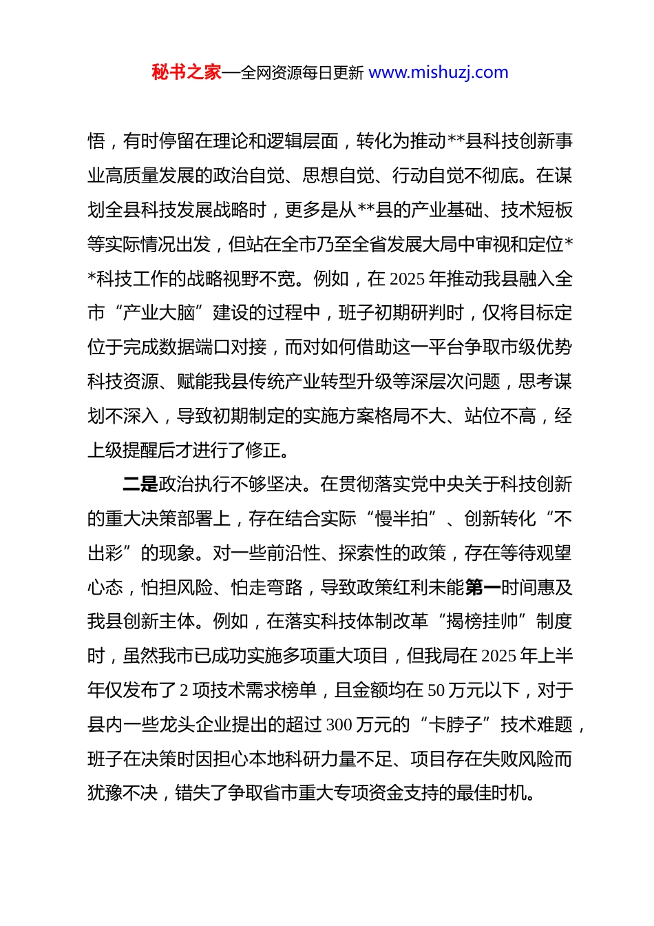 秘书之家—全网资源每日更新 www.mishuzj.com县局领导班子 2025 年度民主生活会对照检查材料 根据县委关于召开 2025 年度民主生活会的统一部署,**县科技局领导班子紧扣“深入学习贯彻习近平新时代中国特色社会主义思想,全面贯彻落实党的二十届三中、四中全会精神,深入贯彻落实习近平总书记重要讲话和重要指示批示精神,以打攻坚战、持久战的决心和恒心,锲而不舍落实中央八项规定精神,推进作风建设常态化长效化,以优良作风凝心聚力、真抓实干,聚焦高质量发展首要任务,扎实推进中国式现代化,为实现‘十五五’良好开局奠定坚实基础”这一主题,在深入开展学习研讨、广泛征求意见建议、坦诚进行谈心谈话的基础上,刀刃向内、揭短亮丑,深入查摆了存在的突出问题,深刻剖析了问题产生的根源,并明确了今后的努力方向和整改措施。现将对照检查情况报告如下。一、存在的问题班子成员坚持把自己摆进去、把职责摆进去、把工作摆进去,对照“五个带头”要求,深入检视,查摆出以下问题。(一)在带头强化政治忠诚、提高政治能力方面一是政治站位不够高远。对“两个确立”决定性意义的领秘书之家—全网资源每日更新 www.mishuzj.com悟,有时停留在理论和逻辑层面,转化为推动**县科技创新事业高质量发展的政治自觉、思想自觉、行动自觉不彻底。在谋划全县科技发展战略时,更多是从**县的产业基础、技术短板等实际情况出发,但站在全市乃至全省发展大局中审视和定位**科技工作的战略视野不宽。例如,在 2025 年推动我县融入全市“产业大脑”建设的过程中,班子初期研判时,仅将目标定位于完成数据端口对接,而对如何借助这一平台争取市级优势科技资源、赋能我县传统产业转型升级等深层次问题,思考谋划不深入,导致初期制定的实施方案格局不大、站位不高,经上级提醒后才进行了修正。二是政治执行不够坚决。在贯彻落实党中央关于科技创新的重大决策部署上,存在结合实际“慢半拍”、创新转化“不出彩”的现象。对一些前沿性、探索性的政策,存在等待观望心态,怕担风险、怕走弯路,导致政策红利未能第一时间惠及我县创新主体。例如,在落实科技体制改革“揭榜挂帅”制度时,虽然我市已成功实施多项重大项目,但我局在 2025 年上半年仅发布了 2 项技术需求榜单,且金额均在 50 万元以下,对于县内一些龙头企业提出的超过 300 万元的“卡脖子”技术难题,班子在决策时因担心本地科研力量不足、项目存在失败风险而犹豫不决,错失了争取省市重大专项资金支持的最佳时机。秘书之家—全网资源每日更新 www.mishuzj.com三是政治鉴别不够敏锐。对社会上一些涉及科技领域的错误思潮和模糊认识,如“技术脱钩论”“自主创新封闭论”等,缺乏旗帜鲜明的批驳和斗争。在干部队伍管理中,对一些干部在非正式场合发表的含有政治偏差的言论,有时仅作出口头提醒,未能从政治纪律的高度严肃对待,政治“探头”作用发挥不充分。班子成员在与企业家、科研人员座谈交流时,对他们提出的某些带有市场化、西方化倾向的观点,未能及时用党的创新理论和国家科技战略方针予以正确引导,政治引领作用发挥不强。(二)在带头固本培元、增强党性方面一是理论武装的“系统性”不强。学习习近平新时代中国特色社会主义思想,特别是关于科技创新的重要论述,存在碎片化、浅表化问题,满足于“学过了”“读过了”,但在融会贯通、学以致用上功夫下得不深。2025 年,局党组理论学习中心组虽完成了规定的 24 次集体学习,但其中围绕科技创新核心议题的专题研讨仅有 6 次,且多数学习停留在念文件、读文章层面,联系科技工作实际、破解发展难题的深度研讨不充分,导致理论学习与业务工作“两张皮”现象依然存在。二是党性锤炼的“主动性”不强。以普通党员身份参加支部组织生活不经常、不主动,存在“指导多、参与少”的现象。秘书之家—全网资源每日更新 www.mishuzj.com在开展批评和自我批评时,有时碍于情面,对班子其他同志的问题点得不深、不透,存在“犹抱琵琶半遮面”的好人主义思想。在学习**市科技系统内发生的艾鹏华、刘俊福等反面典型案例时班子成员多是“就事论事”进行剖析,把自己...
