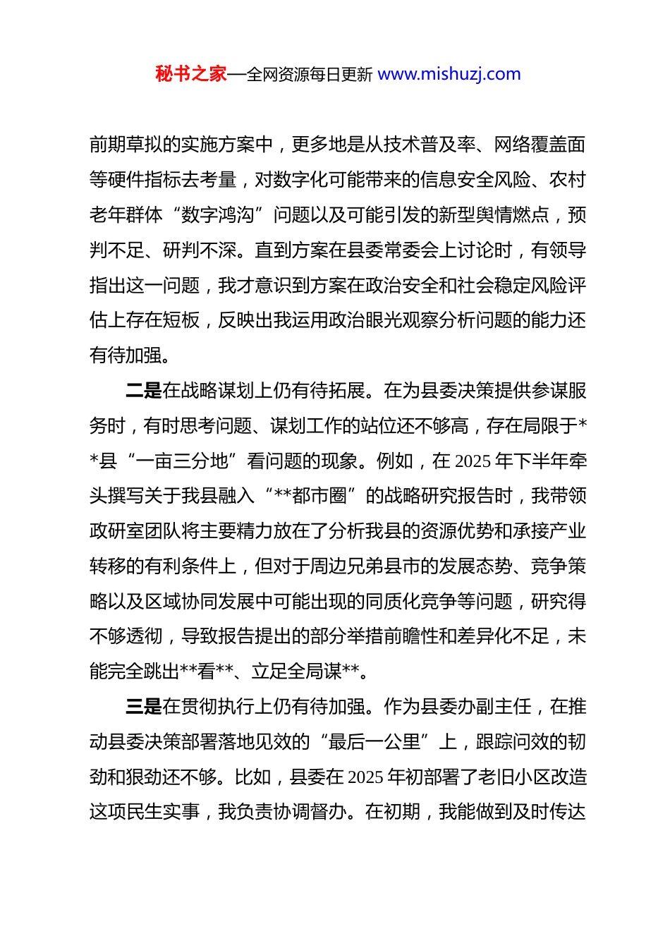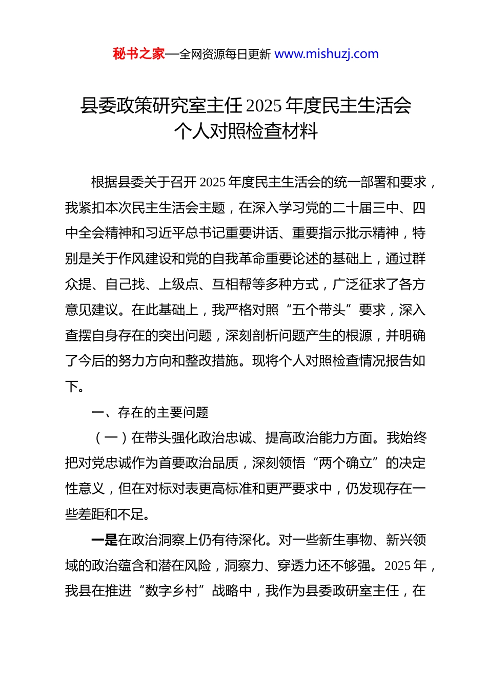 秘书之家—全网资源每日更新 www.mishuzj.com县委政策研究室主任 2025 年度民主生活会个人对照检查材料 根据县委关于召开 2025 年度民主生活会的统一部署和要求,我紧扣本次民主生活会主题,在深入学习党的二十届三中、四中全会精神和习近平总书记重要讲话、重要指示批示精神,特别是关于作风建设和党的自我革命重要论述的基础上,通过群众提、自己找、上级点、互相帮等多种方式,广泛征求了各方意见建议。在此基础上,我严格对照“五个带头”要求,深入查摆自身存在的突出问题,深刻剖析问题产生的根源,并明确了今后的努力方向和整改措施。现将个人对照检查情况报告如下。一、存在的主要问题(一)在带头强化政治忠诚、提高政治能力方面。我始终把对党忠诚作为首要政治品质,深刻领悟“两个确立”的决定性意义,但在对标对表更高标准和更严要求中,仍发现存在一些差距和不足。一是在政治洞察上仍有待深化。对一些新生事物、新兴领域的政治蕴含和潜在风险,洞察力、穿透力还不够强。2025 年,我县在推进“数字乡村”战略中,我作为县委政研室主任,在秘书之家—全网资源每日更新 www.mishuzj.com前期草拟的实施方案中,更多地是从技术普及率、网络覆盖面等硬件指标去考量,对数字化可能带来的信息安全风险、农村老年群体“数字鸿沟”问题以及可能引发的新型舆情燃点,预判不足、研判不深。直到方案在县委常委会上讨论时,有领导指出这一问题,我才意识到方案在政治安全和社会稳定风险评估上存在短板,反映出我运用政治眼光观察分析问题的能力还有待加强。二是在战略谋划上仍有待拓展。在为县委决策提供参谋服务时,有时思考问题、谋划工作的站位还不够高,存在局限于**县“一亩三分地”看问题的现象。例如,在 2025 年下半年牵头撰写关于我县融入“**都市圈”的战略研究报告时,我带领政研室团队将主要精力放在了分析我县的资源优势和承接产业转移的有利条件上,但对于周边兄弟县市的发展态势、竞争策略以及区域协同发展中可能出现的同质化竞争等问题,研究得不够透彻,导致报告提出的部分举措前瞻性和差异化不足,未能完全跳出**看**、立足全局谋**。三是在贯彻执行上仍有待加强。作为县委办副主任,在推动县委决策部署落地见效的“最后一公里”上,跟踪问效的韧劲和狠劲还不够。比如,县委在 2025 年初部署了老旧小区改造这项民生实事,我负责协调督办。在初期,我能做到及时传达秘书之家—全网资源每日更新 www.mishuzj.com会议精神、协调部门力量,但在项目推进中后期,更多地是通过审阅住建、财政等部门报送的书面材料来了解进度,深入一线“解剖麻雀”式的督查较少。**社区的改造工程原计划 2025年 10 月完工,但直到 12 月进度才刚过 70%,事后复盘,如果我能更早地进行现场督导,就能及时发现施工方资金链紧张的苗头,并协调解决,而不是等到问题积压后才被动应对。(二)在带头固本培元、增强党性方面。我坚持用习近平新时代中国特色社会主义思想武装头脑,锤炼党性,但在将党性要求内化于心、外化于行的过程中,还存在一些不足之处。一是在理论学习与实践结合上不够紧密。虽然能够坚持完成规定的学习任务,但有时存在“为学习而学习”的倾向,运用党的创新理论指导研究、推动工作的能力尚需提升。党的二十届四中全会就全面推进乡村振兴、加快农业农村现代化作出了系统部署,我在学习后虽然对相关论述熟稔于心,但在牵头起草我县 2026 年“三农”工作要点时,仍感到“书到用时方恨少”。面对我县特色农产品**桃的物流瓶颈和品牌附加值不高等现实问题,未能从新发展理念和全国统一大市场的宏观理论高度,提出具有独创性、突破性的政策建议,初稿被评价为“理论有余、土味不足”,与我县实际贴得不够紧。二是在党内政治生活锤炼上不够严格。作为班子成员,在秘书之家—全网资源每日更新 www.mishuzj.com开展批评和自我批评时,有时还存在“好人主义”思想,担心批评太尖锐会伤和气、影响团结,影响后续工作的协调推进。在一些工作协调会或文件会审会上,对于其他部门或同志工作中的一些瑕疵,比如材料质量不高、数据核算不准等问题,有时只是点到为...