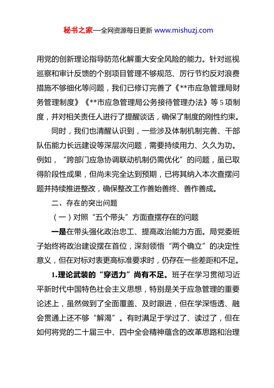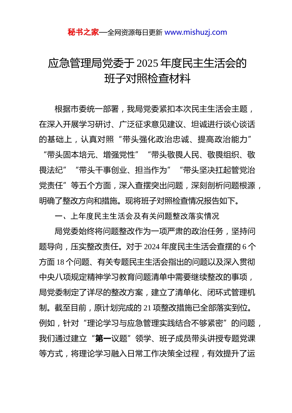 秘书之家—全网资源每日更新 www.mishuzj.com应急管理局党委于 2025 年度民主生活会的班子对照检查材料 根据市委统一部署,我局党委紧扣本次民主生活会主题,在深入开展学习研讨、广泛征求意见建议、坦诚进行谈心谈话的基础上,认真对照“带头强化政治忠诚、提高政治能力”“带头固本培元、增强党性”“带头敬畏人民、敬畏组织、敬畏法纪”“带头干事创业、担当作为”“带头坚决扛起管党治党责任”等五个方面,深入查摆突出问题,深刻剖析问题根源,明确了整改方向和措施。现将班子对照检查情况报告如下。一、上年度民主生活会及有关问题整改落实情况局党委始终将问题整改作为一项严肃的政治任务,坚持问题导向,压实整改责任。对于 2024 年度民主生活会查摆的 6 个方面 18 个问题、有关专题民主生活会指出的问题以及深入贯彻中央八项规定精神学习教育问题清单中需要继续整改的事项,局党委制定了详尽的整改方案,建立了清单化、闭环式管理机制。截至目前,原计划完成的 21 项整改措施已全部落实到位。例如,针对“理论学习与应急管理实践结合不够紧密”的问题,我们通过建立“第一议题”领学、班子成员带头讲授专题党课等方式,将理论学习融入日常工作决策全过程,有效提升了运秘书之家—全网资源每日更新 www.mishuzj.com用党的创新理论指导防范化解重大安全风险的能力。针对巡视巡察和审计反馈的个别项目管理不够规范、厉行节约反对浪费措施不够细化等问题,我们已修订完善了《**市应急管理局财务管理制度》《**市应急管理局公务接待管理办法》等 5 项制度,并对相关责任人进行了提醒谈话,确保了制度的刚性约束。同时,我们也清醒认识到,一些涉及体制机制完善、干部队伍能力长远建设等深层次问题,需要持续用力、久久为功。例如,“跨部门应急协调联动机制仍需优化”的问题,虽已取得阶段性成果,但尚未完全达到预期,已将其纳入本次查摆问题并持续推进整改,确保整改工作善始善终、善作善成。二、存在的突出问题(一)对照“五个带头”方面查摆存在的问题一是在带头强化政治忠工、提高政治能力方面。局党委班子始终将政治建设摆在首位,深刻领悟“两个确立”的决定性意义,但在对标对表更高标准要求时,仍存在一些差距和不足。1.理论武装的“穿透力”尚有不足。班子在学习贯彻习近平新时代中国特色社会主义思想,特别是关于应急管理的重要论述上,虽然做到了全面覆盖、及时跟进,但在学深悟透、融会贯通上还不够“解渴”。有时满足于学过了、读过了,但在如何将党的二十届三中、四中全会精神蕴含的改革思路和治理秘书之家—全网资源每日更新 www.mishuzj.com理念,精准转化为防范化解我市新业态、新领域安全风险的具体战法打法上,思考得不够深邃,研讨得不够充分,导致理论学习与应急管理事业高质量发展的实践需求未能达到最优耦合。2.风险洞察的“前瞻性”仍需提升。面对我市产业转型升级带来的复杂安全挑战,班子在风险研判上存在一定的路径依赖,对传统高危行业领域的风险辨识较为精准,但对一些新兴产业、交叉领域可能衍生的新型风险,敏感性和预见性稍显欠缺。在制定年度安全生产执法计划时,更多是基于过往事故数据的分析,对于如何通过大数据、人工智能等现代科技手段,构建前瞻性的风险预警模型,提前发现和处置潜在的“灰犀牛”“黑天鹅”事件,谋划和推动尚显不足。3.贯彻执行的“颗粒度”有待精细。在落实党中央和省委、市委决策部署上,班子态度是坚决的,行动是迅速的,但有时存在“上下一般粗”的现象。例如,在推进安全生产治本攻坚三年行动中,虽然严格按照上级方案执行,但在结合我市小微企业众多、安全基础薄弱的实际情况,制定更具针对性、更“接地气”的配套措施方面,精细化程度不够,导致部分政策在基层末梢的落实效果打了折扣。二是在带头固本培元、增强党性方面。班子成员能够自觉加强党性修养,但在新形势新任务面前,对标共产党人精神谱秘书之家—全网资源每日更新 www.mishuzj.com系,检视自身仍有差距。1.党性锤炼的“熔炉”热度不够。在组织生活和班子内部的批评与自我批评中,有时存在“辣味”不足、人情味偏浓的现象。相互...