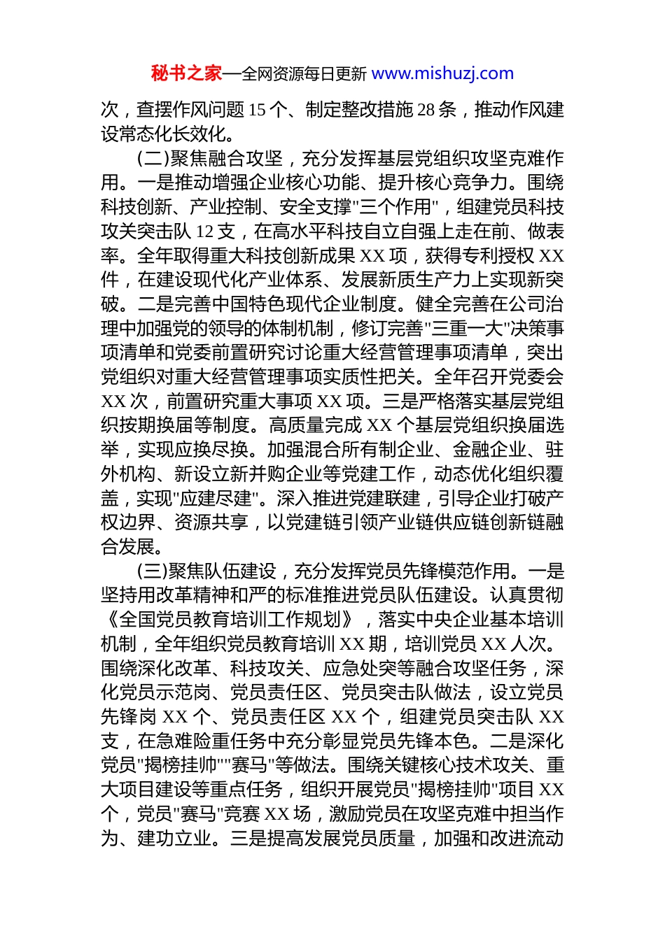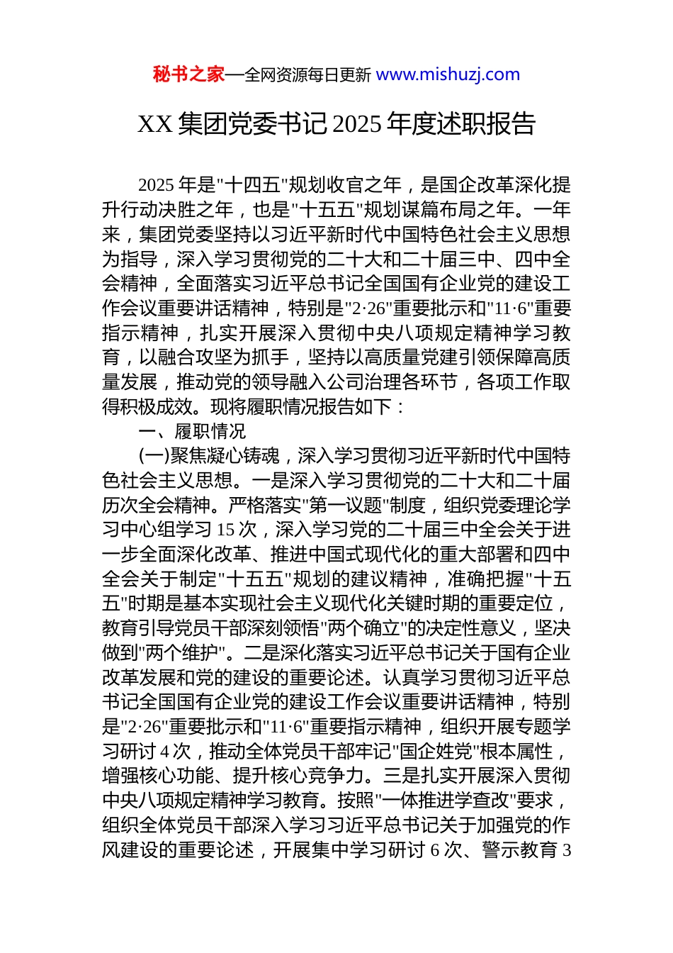 秘书之家—全网资源每日更新 www.mishuzj.comXX 集团党委书记 2025 年度述职报告2025 年是"十四五"规划收官之年,是国企改革深化提升行动决胜之年,也是"十五五"规划谋篇布局之年。一年来,集团党委坚持以习近平新时代中国特色社会主义思想为指导,深入学习贯彻党的二十大和二十届三中、四中全会精神,全面落实习近平总书记全国国有企业党的建设工作会议重要讲话精神,特别是"2·26"重要批示和"11·6"重要指示精神,扎实开展深入贯彻中央八项规定精神学习教育,以融合攻坚为抓手,坚持以高质量党建引领保障高质量发展,推动党的领导融入公司治理各环节,各项工作取得积极成效。现将履职情况报告如下:一、履职情况(一)聚焦凝心铸魂,深入学习贯彻习近平新时代中国特色社会主义思想。一是深入学习贯彻党的二十大和二十届历次全会精神。严格落实"第一议题"制度,组织党委理论学习中心组学习 15 次,深入学习党的二十届三中全会关于进一步全面深化改革、推进中国式现代化的重大部署和四中全会关于制定"十五五"规划的建议精神,准确把握"十五五"时期是基本实现社会主义现代化关键时期的重要定位,教育引导党员干部深刻领悟"两个确立"的决定性意义,坚决做到"两个维护"。二是深化落实习近平总书记关于国有企业改革发展和党的建设的重要论述。认真学习贯彻习近平总书记全国国有企业党的建设工作会议重要讲话精神,特别是"2·26"重要批示和"11·6"重要指示精神,组织开展专题学习研讨 4 次,推动全体党员干部牢记"国企姓党"根本属性,增强核心功能、提升核心竞争力。三是扎实开展深入贯彻中央八项规定精神学习教育。按照"一体推进学查改"要求,组织全体党员干部深入学习习近平总书记关于加强党的作风建设的重要论述,开展集中学习研讨 6 次、警示教育 3秘书之家—全网资源每日更新 www.mishuzj.com次,查摆作风问题 15 个、制定整改措施 28 条,推动作风建设常态化长效化。(二)聚焦融合攻坚,充分发挥基层党组织攻坚克难作用。一是推动增强企业核心功能、提升核心竞争力。围绕科技创新、产业控制、安全支撑"三个作用",组建党员科技攻关突击队 12 支,在高水平科技自立自强上走在前、做表率。全年取得重大科技创新成果 XX 项,获得专利授权 XX件,在建设现代化产业体系、发展新质生产力上实现新突破。二是完善中国特色现代企业制度。健全完善在公司治理中加强党的领导的体制机制,修订完善"三重一大"决策事项清单和党委前置研究讨论重大经营管理事项清单,突出党组织对重大经营管理事项实质性把关。全年召开党委会XX 次,前置研究重大事项 XX 项。三是严格落实基层党组织按期换届等制度。高质量完成 XX 个基层党组织换届选举,实现应换尽换。加强混合所有制企业、金融企业、驻外机构、新设立新并购企业等党建工作,动态优化组织覆盖,实现"应建尽建"。深入推进党建联建,引导企业打破产权边界、资源共享,以党建链引领产业链供应链创新链融合发展。(三)聚焦队伍建设,充分发挥党员先锋模范作用。一是坚持用改革精神和严的标准推进党员队伍建设。认真贯彻《全国党员教育培训工作规划》,落实中央企业基本培训机制,全年组织党员教育培训 XX 期,培训党员 XX 人次。围绕深化改革、科技攻关、应急处突等融合攻坚任务,深化党员示范岗、党员责任区、党员突击队做法,设立党员先锋岗 XX 个、党员责任区 XX 个,组建党员突击队 XX支,在急难险重任务中充分彰显党员先锋本色。二是深化党员"揭榜挂帅""赛马"等做法。围绕关键核心技术攻关、重大项目建设等重点任务,组织开展党员"揭榜挂帅"项目 XX个,党员"赛马"竞赛 XX 场,激励党员在攻坚克难中担当作为、建功立业。三是提高发展党员质量,加强和改进流动秘书之家—全网资源每日更新 www.mishuzj.com党员管理。全年发展党员 XX 名,坚持把政治标准放在首位,注重从生产经营一线、科技攻关骨干中发展党员。完善流动党员管理台账,落实"双向共管"机制,确保流动党员"离乡不离党、流动不流失"。推动党组织和党员在网络空间发挥作用,严肃稳妥处置不合格党员,锻造靠得住、顶得上、过得硬的先锋队伍。(四)...