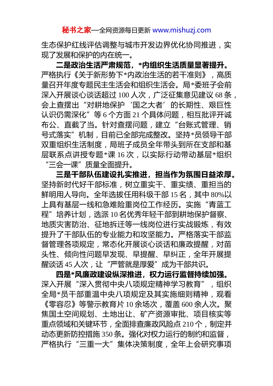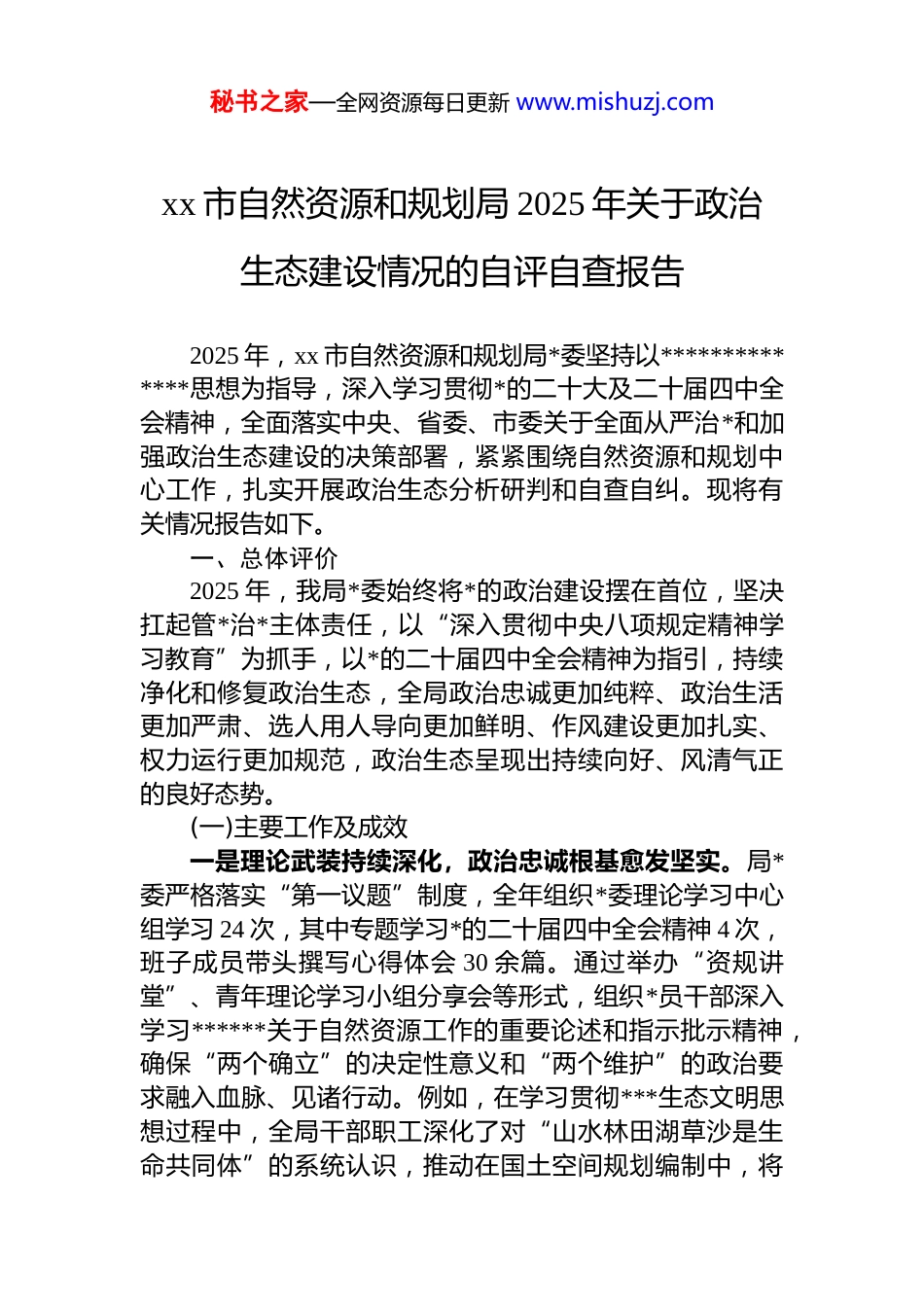 秘书之家—全网资源每日更新 www.mishuzj.comxx 市自然资源和规划局 2025 年关于政治生态建设情况的自评自查报告2025 年,xx 市自然资源和规划局*委坚持以**************思想为指导,深入学习贯彻*的二十大及二十届四中全会精神,全面落实中央、省委、市委关于全面从严治*和加强政治生态建设的决策部署,紧紧围绕自然资源和规划中心工作,扎实开展政治生态分析研判和自查自纠。现将有关情况报告如下。一、总体评价2025 年,我局*委始终将*的政治建设摆在首位,坚决扛起管*治*主体责任,以“深入贯彻中央八项规定精神学习教育”为抓手,以*的二十届四中全会精神为指引,持续净化和修复政治生态,全局政治忠诚更加纯粹、政治生活更加严肃、选人用人导向更加鲜明、作风建设更加扎实、权力运行更加规范,政治生态呈现出持续向好、风清气正的良好态势。(一)主要工作及成效一是理论武装持续深化,政治忠诚根基愈发坚实。局*委严格落实“第一议题”制度,全年组织*委理论学习中心组学习 24 次,其中专题学习*的二十届四中全会精神 4 次,班子成员带头撰写心得体会 30 余篇。通过举办“资规讲堂”、青年理论学习小组分享会等形式,组织*员干部深入学习******关于自然资源工作的重要论述和指示批示精神,确保“两个确立”的决定性意义和“两个维护”的政治要求融入血脉、见诸行动。例如,在学习贯彻***生态文明思想过程中,全局干部职工深化了对“山水林田湖草沙是生命共同体”的系统认识,推动在国土空间规划编制中,将秘书之家—全网资源每日更新 www.mishuzj.com生态保护红线评估调整与城市开发边界优化协同推进,实现了发展和保护的内在统一。二是政治生活严肃规范,*内组织生活质量显著提升。严格执行《关于新形势下*内政治生活的若干准则》,高质量召开年度专题民主生活会和组织生活会。局*委班子会前深入开展谈心谈话超过 100 人次,广泛征集意见建议 68 条,会上查摆出“对耕地保护‘国之大者’的长期性、艰巨性认识仍需深化”等 6 个方面 21 个具体问题,相互批评开诚布公、直截了当。针对查摆问题,建立“台账式管理、销号式落实”机制,目前已全部完成整改。坚持*员领导干部双重组织生活制度,局班子成员全年带头到所在支部和基层联系点讲授专题*课 16 次,以实际行动带动基层*组织“三会一课”质量全面提升。三是干部队伍建设扎实推进,担当作为氛围日益浓厚。坚持新时代好干部标准,树立重实干、重实绩、重担当的鲜明用人导向。全年选拔任用科级干部 15 名,其中 80%以上具有基层一线和急难险重岗位工作经历。实施“青蓝工程”培养计划,选派 10 名优秀年轻干部到耕地保护督察、地质灾害防治、征地拆迁等一线岗位进行实战锻炼,有效提升了干部队伍的专业能力和攻坚能力。严格落实干部监督管理各项规定,常态化开展谈心谈话和廉政提醒,对苗头性、倾向性问题早发现、早提醒、早纠正,全年开展提醒谈话 45 人次,让“严管就是厚爱”成为干部共识。四是*风廉政建设纵深推进,权力运行监督持续加强。深入开展“深入贯彻中央八项规定精神学习教育”,组织全局*员干部重温中央八项规定及其实施细则精神,观看《零容忍》等警示教育片 10 余场次,覆盖 600 余人次。聚焦国土空间规划、土地出让、矿产资源审批、项目核实等重点领域和关键环节,全面排查廉政风险点 210 个,制定并动态更新防控措施 350 条。强化对权力运行的制约和监督,严格执行“三重一大”集体决策制度,全年上会研究事项秘书之家—全网资源每日更新 www.mishuzj.com120 余项,均严格按照议事规则和决策程序进行。得益于严密的防控体系和持续的警示教育,全年未发生一起干部职工违纪违法案件,干部队伍遵规守纪的思想自觉和行动自觉显著增强。五是政治文化建设深入开展,清风正气广泛弘扬。大力弘扬“忠诚老实、公道正派、实事求是、清正廉洁”的价值观,在局机关走廊、会议室等场所设置廉洁文化宣传栏,定期推送廉政短信、廉洁故事,营造“处处见廉、时时思廉”的浓厚氛围。制定《关于规范*内同志交往的若干规定》,明确禁止以职务、老板等称呼代替同志,倡导清清爽爽的同...