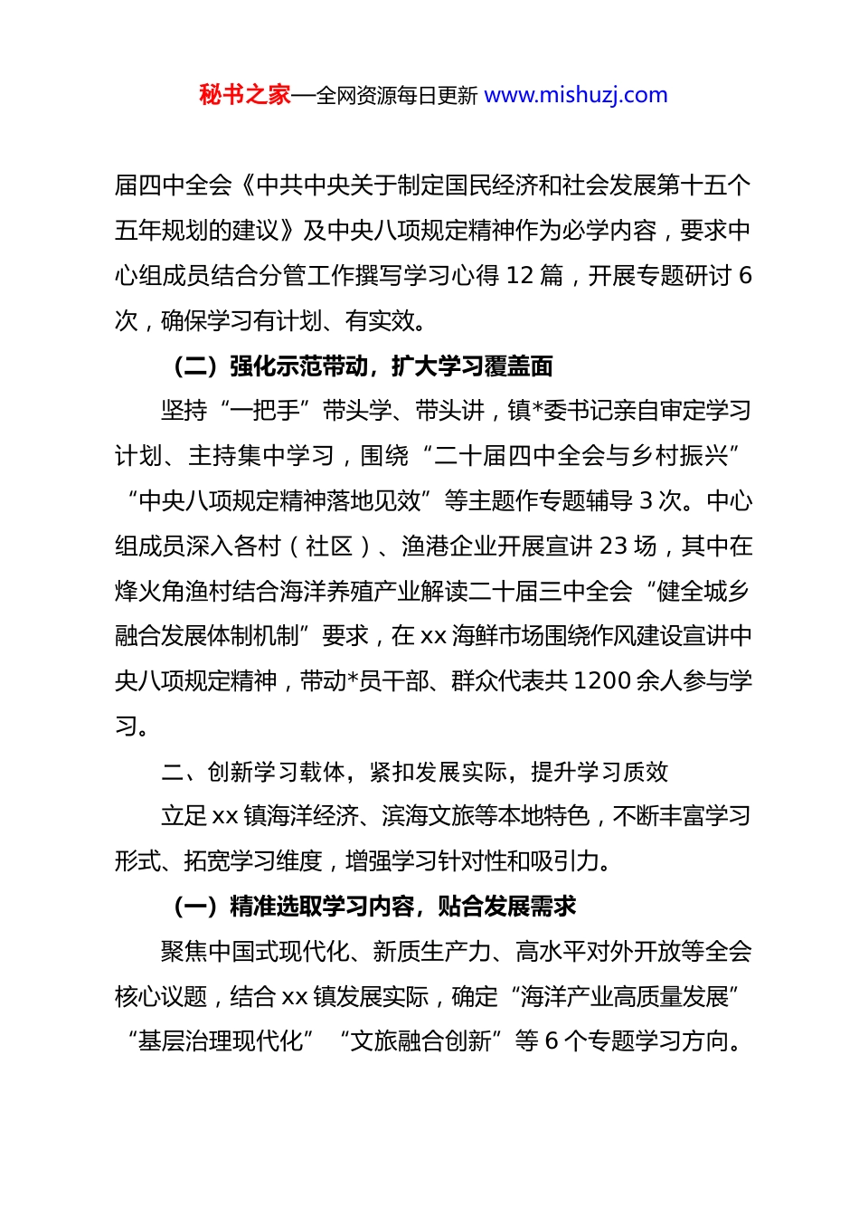 秘书之家—全网资源每日更新 www.mishuzj.comxx 镇*委理论学习中心组 2025 年工作总结及2026 年学习计划2025 年,xx 镇*委理论学习中心组严格按照《2025 年xx 市各级*委(*组)理论学习中心组专题学习重点内容安排》(台宣联〔2025〕9 号)要求,将中心组学习作为加强*委班子政治建设、提升干部队伍能力的核心载体,紧扣学习贯彻*的二十大及二十届三中、四中全会精神主线,扎实开展中央八项规定精神学习教育,全年组织集中学习 8 次、常态化学习 20次,圆满完成上级部署的学习任务,实现理论学习与实践工作深度融合,为 xx 镇海洋经济提质、乡村全面振兴等重点工作提供了坚强思想保障。现将 2025 年学习情况总结如下:一、锚定政治引领,深化理论武装,筑牢思想根基以强化政治建设为核心,将*的创新理论学习贯穿始终,推动学习往深里走、往实里走。(一)健全制度体系,规范学习推进紧扣上级要求制定《2025 年 xx 镇*委理论学习中心组专题学习重点内容安排》,完善“会前定题、会上研讨、会后落实”闭环机制。将*的二十大精神、二十届三中全会《中共中央关于进一步全面深化改革、推进中国式现代化的决定》、二十秘书之家—全网资源每日更新 www.mishuzj.com届四中全会《中共中央关于制定国民经济和社会发展第十五个五年规划的建议》及中央八项规定精神作为必学内容,要求中心组成员结合分管工作撰写学习心得 12 篇,开展专题研讨 6次,确保学习有计划、有实效。(二)强化示范带动,扩大学习覆盖面坚持“一把手”带头学、带头讲,镇*委书记亲自审定学习计划、主持集中学习,围绕“二十届四中全会与乡村振兴”“中央八项规定精神落地见效”等主题作专题辅导 3 次。中心组成员深入各村(社区)、渔港企业开展宣讲 23 场,其中在烽火角渔村结合海洋养殖产业解读二十届三中全会“健全城乡融合发展体制机制”要求,在 xx 海鲜市场围绕作风建设宣讲中央八项规定精神,带动*员干部、群众代表共 1200 余人参与学习。二、创新学习载体,紧扣发展实际,提升学习质效立足 xx 镇海洋经济、滨海文旅等本地特色,不断丰富学习形式、拓宽学习维度,增强学习针对性和吸引力。(一)精准选取学习内容,贴合发展需求聚焦中国式现代化、新质生产力、高水平对外开放等全会核心议题,结合 xx 镇发展实际,确定“海洋产业高质量发展”“基层治理现代化”“文旅融合创新”等 6 个专题学习方向。秘书之家—全网资源每日更新 www.mishuzj.com征订《*的二十届三中全会〈决定〉学习辅导读本》《*的二十届四中全会〈建议〉学习问答》等教材 40 余册,配套学习中央八项规定精神相关解读材料,确保学习内容既紧跟中央部署,又贴合本地实践。(二)丰富学习实现形式,增强学习活力采用“线上+线下”“理论+实践”“集中学+自学”相结合的方式,提升学习实效。线上依托学习强国、xx 融媒等平台开展常态化自学,线下邀请市委宣讲团成员作“二十届四中全会精神与‘十五五’规划解读”专题讲座 2 场;组织中心组成员赴 xx 滨海旅游示范区、斗山镇现代农业园考察学习,实地借鉴产业融合发展经验;结合“走基层、解难题”活动,将学习课堂搬到渔港码头、项目现场,围绕渔港智能化改造、滨海旅游线路优化等实际问题开展现场研讨。三、坚持学用结合,转化学习成果,推动工作落实把学习成果转化为破解难题、推动发展的实际成效,实现“学思用贯通、知信行统一”。(一)锚定发展重点,强化使命担当将理论学习与 xx 镇重点工作深度融合,围绕二十届三中全会“健全推动经济高质量发展体制机制”要求,谋划推进渔港升级改造、海洋养殖标准化建设等项目 8 个;结合二十届四中秘书之家—全网资源每日更新 www.mishuzj.com全会“完善民生保障制度体系”部署,解决群众反映强烈的渔港道路硬化、老旧小区供水改造等民生问题 15 件;落实中央八项规定精神,开展“作风建设提升年”活动,精简会议文件30%,规范公务接待、公车使用等流程,基层减负成效显著。(二)聚焦问题导向,提升决策水平引导中心组成员带着问题学、对着问题改,针对海洋产业链条短、文旅品牌影响力不足等短...