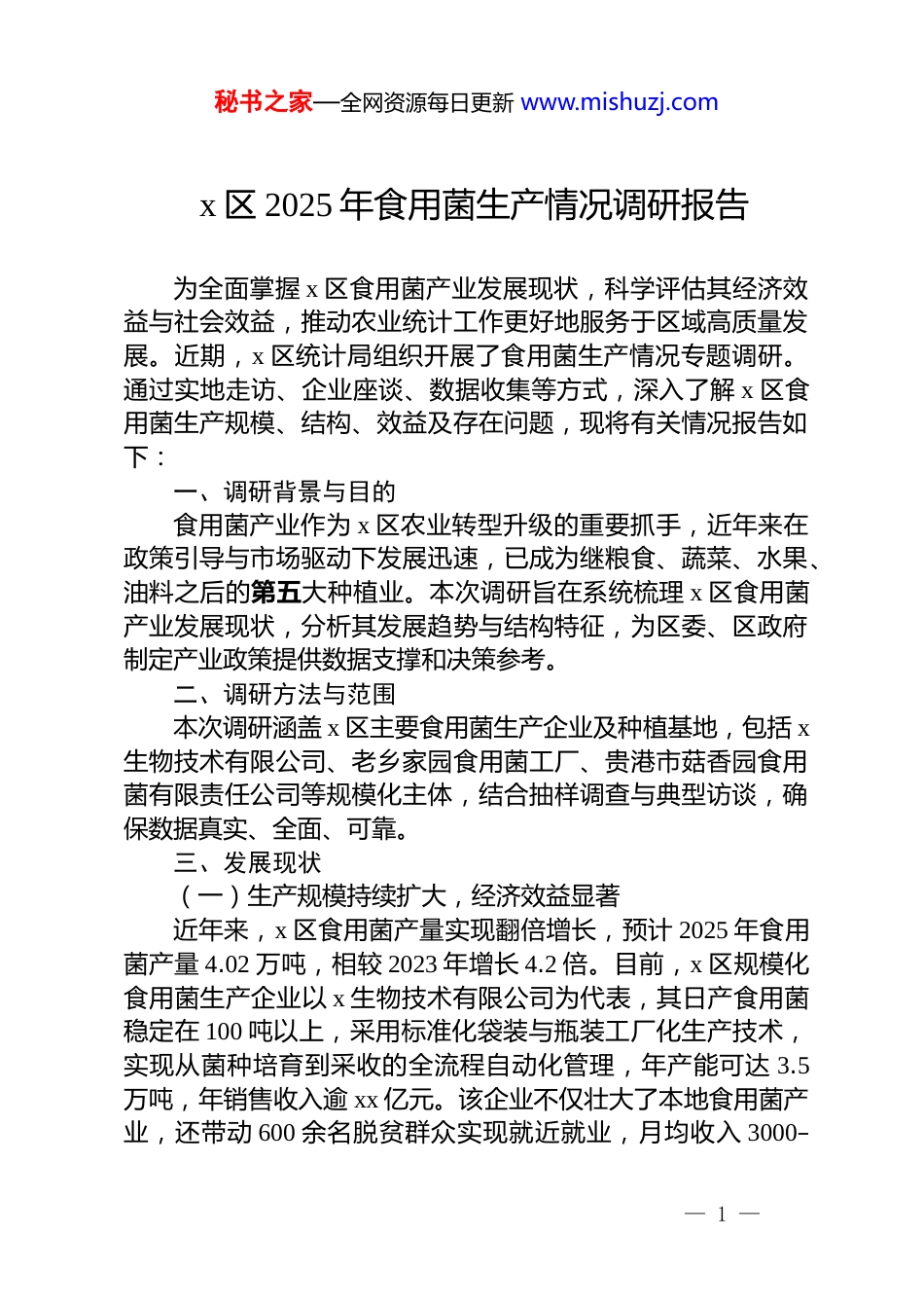 秘书之家—全网资源每日更新 www.mishuzj.comx 区 2025 年食用菌生产情况调研报告为全面掌握 x 区食用菌产业发展现状,科学评估其经济效益与社会效益,推动农业统计工作更好地服务于区域高质量发展。近期,x 区统计局组织开展了食用菌生产情况专题调研。通过实地走访、企业座谈、数据收集等方式,深入了解 x 区食用菌生产规模、结构、效益及存在问题,现将有关情况报告如下:一、调研背景与目的食用菌产业作为 x 区农业转型升级的重要抓手,近年来在政策引导与市场驱动下发展迅速,已成为继粮食、蔬菜、水果、油料之后的第五大种植业。本次调研旨在系统梳理 x 区食用菌产业发展现状,分析其发展趋势与结构特征,为区委、区政府制定产业政策提供数据支撑和决策参考。二、调研方法与范围本次调研涵盖 x 区主要食用菌生产企业及种植基地,包括 x生物技术有限公司、老乡家园食用菌工厂、贵港市菇香园食用菌有限责任公司等规模化主体,结合抽样调查与典型访谈,确保数据真实、全面、可靠。三、发展现状(一)生产规模持续扩大,经济效益显著近年来,x 区食用菌产量实现翻倍增长,预计 2025 年食用菌产量 4.02 万吨,相较 2023 年增长 4.2 倍。目前,x 区规模化食用菌生产企业以 x 生物技术有限公司为代表,其日产食用菌稳定在 100 吨以上,采用标准化袋装与瓶装工厂化生产技术,实现从菌种培育到采收的全流程自动化管理,年产能可达 3.5万吨,年销售收入逾 xx 亿元。该企业不仅壮大了本地食用菌产业,还带动 600 余名脱贫群众实现就近就业,月均收入 3000–— 1 —秘书之家—全网资源每日更新 www.mishuzj.com4000 元,有效促进农民增收与产业振兴。(二)生产方式现代化程度提高,科技支撑作用增强调研显示,x 区食用菌生产已从传统农法逐步转向工厂化、标准化与自动化发展。通过杂交育种、分子标记辅助育种等技术,成功培育出金针菇、杏鲍菇等工厂化专用品种,实现周年化、标准化生产。在温湿度、光照、通风等环境因子的智能调控下,单位面积产量与品质稳定性显著提升,有效克服了季节与地域限制。此外,栽培基质实现多元化与循环利用,木屑、玉米芯、甘蔗渣等农业废弃物被用作主料,形成“农业废弃物→食用菌→菌糠→肥料/饲料”的生态循环模式,契合绿色农业发展要求。(三)品种结构日趋多元,产业链条不断延伸x 区食用菌产业已由以香菇、黑木耳、平菇、蘑菇为主的传统结构,逐步发展为多品种协同发展的新格局。杏鲍菇、金针菇、真姬菇(含蟹味菇、白玉菇)、鹿茸菇、竹荪等珍稀菌类产量与消费量快速增长,有效丰富了居民“菜篮子”。在品种多元化的基础上,产业链条持续延伸。以 x 村灵芝为代表的药用菌产业迅速崛起,为 x 区食用菌产业拓展了新的发展空间。(四)销售渠道多样,市场辐射范围广销售渠道多元化,形成了以大型农产品批发市场为核心,商超、生鲜电商、社区团购、直播带货等多种渠道并存的现代化销售体系,消费触达更加便捷。x 生物技术有限公司产出的金针菇、鹿茸菇等主要销往华南、西南地区以及东南亚等多个国家和地区。四、存在的主要问题(一)集群效应“聚”势不足x 区食用菌产业虽发展快速,但总体规模依然较小,组织化程度低,抗市场风险能力弱。企业之间的协同合作不足,尚— 2 —秘书之家—全网资源每日更新 www.mishuzj.com未形成有效的产业集群效应,制约产业整体竞争力提升。(二)原材料供应成本高本地原材料短缺是阻碍产业发展的关键因素。x 区食用菌生产主要依赖菌包种植,菌包的原材料包括莲子壳、花生麸、玉米芯、稻草、麸皮、大豆皮、米糠等。由于本地原材料供应不足,企业多从外地采购,供应成本较高。(三)产品竞争力不强x 区食用菌产品以销售鲜菇为主,加工率较低,且加工产品多为简单的干制品,精深加工率几乎为零。精深加工企业缺乏导致产品更新慢、产业链条短、高值化利用度低,产品附加值难以提升,影响了产业的整体效益和市场竞争力。五、对策建议(一)加强产业规划与精准招商x 区应进一步加强食用菌产业的统筹规划,聚焦延链补链强链,紧盯食用菌原材料生产、精深加工、冷链物...