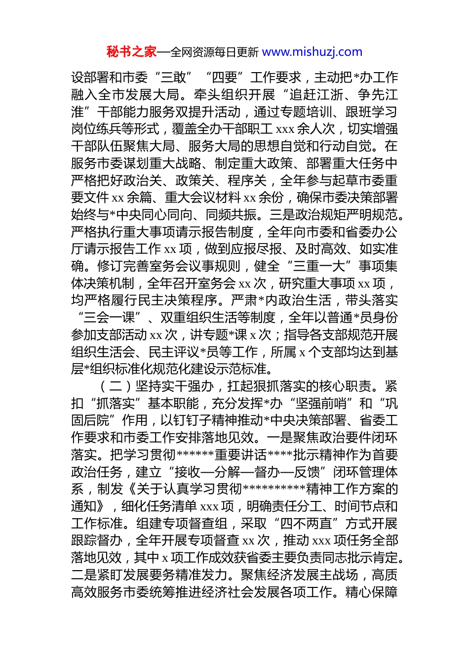 秘书之家—全网资源每日更新 www.mishuzj.com办公室主任 2025 年述职述廉述工作总结2025 年,在市委坚强领导下,我坚持以**************思想为指导,深入学习贯彻*的二十大及二十届三中、四中全会精神,全面落实******关于办公厅工作“五个坚持”重要要求,团结带领市委办公室全体干部职工,锚定“围绕中心、服务大局”核心定位,以 dj 为引领、以实干为支撑、以廉洁为底线,持续提升“三服务”工作规范化制度化、精细化水平,奋力打造让*放心、让人民满意的模范机关。全年工作成效显著,市委办公室先后获评“第十二届全省文明单位”“全省*办系统先进集体”等称号,连续 4 年在市管领导班子年度综合考核中获“优秀”等次,多项工作经验获省委办公厅通报推广。一、2025 年工作情况(一)坚持政治立办,筑牢绝对忠诚的思想根基。始终把讲政治作为*办工作的第一属性,以实际行动坚定拥护“两个确立”、坚决做到“两个维护”,确保各项工作始终沿着正确政治方向前进。一是理论武装走深走实。严格落实“第一议题”制度,牵头制定市委理论学习中心组年度学习计划,协助市委以上率下开展集中学习 xx 次、专题研讨 x 次,及时跟进学习******最新重要讲话****批示精神,做到学思用贯通、知信行统一。创新打造“半月讲堂+现场研学+线上交流”三维学习载体,聚焦政治理论、业务技能、大局工作等内容,全年举办“半月讲堂”xx 期,组织赴红色教育基地研学 x 次,开展线上学习交流 x 场,推动*员干部在学思践悟中淬炼政治品格、提升政治能力。同时,建强青年理论学习小组,开展“青年干部谈担当”系列活动 x次,引导年轻干部筑牢理想信念根基。二是服务大局精准有力。始终胸怀“国之大者”,紧扣省委“三地一区”建秘书之家—全网资源每日更新 www.mishuzj.com设部署和市委“三敢”“四要”工作要求,主动把*办工作融入全市发展大局。牵头组织开展“追赶江浙、争先江淮”干部能力服务双提升活动,通过专题培训、跟班学习岗位练兵等形式,覆盖全办干部职工 xxx 余人次,切实增强干部队伍聚焦大局、服务大局的思想自觉和行动自觉。在服务市委谋划重大战略、制定重大政策、部署重大任务中严格把好政治关、政策关、程序关,全年参与起草市委重要文件 xx 余篇、重大会议材料 xx 余份,确保市委决策部署始终与*中央同心同向、同频共振。三是政治规矩严明规范。严格执行重大事项请示报告制度,全年向市委和省委办公厅请示报告工作 xx 项,做到应报尽报、及时高效、如实准确。修订完善室务会议事规则,健全“三重一大”事项集体决策机制,全年召开室务会 xx 次,研究重大事项 xx 项,均严格履行民主决策程序。严肃*内政治生活,带头落实“三会一课”、双重组织生活等制度,全年以普通*员身份参加支部活动 xx 次,讲专题*课 x 次;指导各支部规范开展组织生活会、民主评议*员等工作,所属 x 个支部均达到基层*组织标准化规范化建设示范标准。(二)坚持实干强办,扛起狠抓落实的核心职责。紧扣“抓落实”基本职能,充分发挥*办“坚强前哨”和“巩固后院”作用,以钉钉子精神推动*中央决策部署、省委工作要求和市委工作安排落地见效。一是聚焦政治要件闭环落实。把学习贯彻******重要讲话****批示精神作为首要政治任务,建立“接收—分解—督办—反馈”闭环管理体系,制发《关于认真学习贯彻**********精神工作方案的通知》,细化任务清单 xxx 项,明确责任分工、时间节点和工作标准。组建专项督查组,采取“四不两直”方式开展跟踪督办,全年开展专项督查 xx 次,推动 xxx 项任务全部落地见效,其中 x 项工作成效获省委主要负责同志批示肯定。二是紧盯发展要务精准发力。聚焦经济发展主战场,高质高效服务市委统筹推进经济社会发展各项工作。精心保障秘书之家—全网资源每日更新 www.mishuzj.com市委每月“政商恳谈会”、双月“重大项目和招商引资调度会”、季度“三比三学三赶超”活动,全年协调组织各类会议活动 xx 场,推动解决企业发展难题 xx 个、重大项目推进堵点 xx 个。深入践行“四下基层”优良传统,牵头服务市委常委会赴基层现场办公 ...