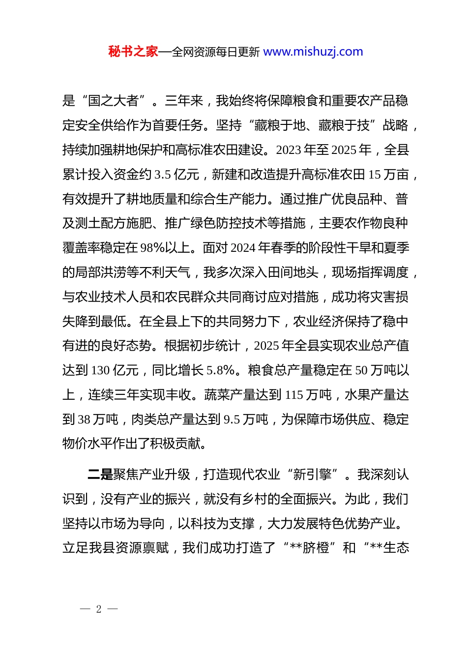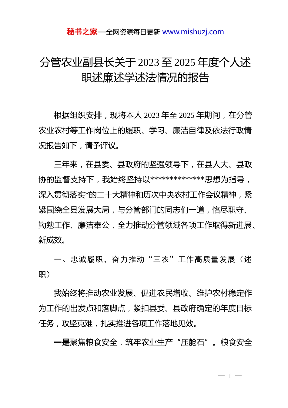 秘书之家—全网资源每日更新 www.mishuzj.com分管农业副县长关于 2023 至 2025 年度个人述职述廉述学述法情况的报告根据组织安排,现将本人 2023 年至 2025 年期间,在分管农业农村等工作岗位上的履职、学习、廉洁自律及依法行政情况报告如下,请予评议。三年来,在县委、县政府的坚强领导下,在县人大、县政协的监督支持下,我始终坚持以**************思想为指导,深入贯彻落实*的二十大精神和历次中央农村工作会议精神,紧紧围绕全县发展大局,与分管部门的同志们一道,恪尽职守、勤勉工作、廉洁奉公,全力推动分管领域各项工作取得新进展、新成效。一、忠诚履职,奋力推动“三农”工作高质量发展(述职)�我始终将推动农业发展、促进农民增收、维护农村稳定作为工作的出发点和落脚点,紧扣县委、县政府确定的年度目标任务,攻坚克难,扎实推进各项工作落地见效。一是聚焦粮食安全,筑牢农业生产“压舱石”。粮食安全— 1 —秘书之家—全网资源每日更新 www.mishuzj.com是“国之大者”。三年来,我始终将保障粮食和重要农产品稳定安全供给作为首要任务。坚持“藏粮于地、藏粮于技”战略,持续加强耕地保护和高标准农田建设。2023 年至 2025 年,全县累计投入资金约 3.5 亿元,新建和改造提升高标准农田 15 万亩,有效提升了耕地质量和综合生产能力。通过推广优良品种、普及测土配方施肥、推广绿色防控技术等措施,主要农作物良种覆盖率稳定在 98%以上。面对 2024 年春季的阶段性干旱和夏季的局部洪涝等不利天气,我多次深入田间地头,现场指挥调度,与农业技术人员和农民群众共同商讨应对措施,成功将灾害损失降到最低。在全县上下的共同努力下,农业经济保持了稳中有进的良好态势。根据初步统计,2025 年全县实现农业总产值达到 130 亿元,同比增长 5.8%。粮食总产量稳定在 50 万吨以上,连续三年实现丰收。蔬菜产量达到 115 万吨,水果产量达到 38 万吨,肉类总产量达到 9.5 万吨,为保障市场供应、稳定物价水平作出了积极贡献。二是聚焦产业升级,打造现代农业“新引擎”。我深刻认识到,没有产业的振兴,就没有乡村的全面振兴。为此,我们坚持以市场为导向,以科技为支撑,大力发展特色优势产业。立足我县资源禀赋,我们成功打造了“**脐橙”和“**生态— 2 —秘书之家—全网资源每日更新 www.mishuzj.com茶”两大区域公共品牌。三年来,累计整合涉农资金超过 2 亿元,重点扶持了 50 家龙头企业、120 个家庭农场和 300 余家农民专业合作社,形成了“龙头企业+合作社+基地+农户”的紧密型利益联结机制,带动超过 3 万户农民实现增收。我们积极推动一二三产业融合发展,支持建设了**农产品加工产业园,引进了深加工生产线,使农产品附加值提升了 30%以上。同时,大力发展休闲农业和乡村旅游,建成了 3 个省级美丽休闲乡村和一批星级农家乐,2025 年全县乡村旅游接待游客突破 200 万人次,综合收入超过 5 亿元,有效拓宽了农民增收渠道。三是聚焦乡村建设,绘就和美乡村“新画卷”。按照“产业兴旺、生态宜居、乡风文明、治理有效、生活富裕”的总要求,我们扎实推进乡村建设行动。三年来,我们以农村人居环境整治提升为抓手,全面开展“三清一改”工作,累计完成1500 个村庄的人居环境整治任务,农村卫生厕所普及率达到92%,生活垃圾无害化处理率达到 95%。持续推进“四好农村路”建设,累计新改建农村公路 280 公里,实现了村村通硬化路、组组通水泥路。在基础设施不断完善的同时,我们注重乡风文明建设,指导各乡镇修订完善村规民约,广泛开展“文明家庭”、“最美庭院”等评选活动,推动形成了文明乡风、良— 3 —秘书之家—全网资源每日更新 www.mishuzj.com好家风、淳朴民风。二、严以修身,永葆清正廉洁政治本色(述廉)�作为一名*员领导干部,我始终把清正廉洁作为安身立命之本。我深知,权力是人民赋予的,只能用来为人民服务。一是筑牢思想防线,做到心中有戒。我始终把政治纪律和政治规矩挺在前面,认真学习《中国共产*廉洁自律准则》《中国共产 dj 律处分条例》等*内法规,不断增强“四个意识”...