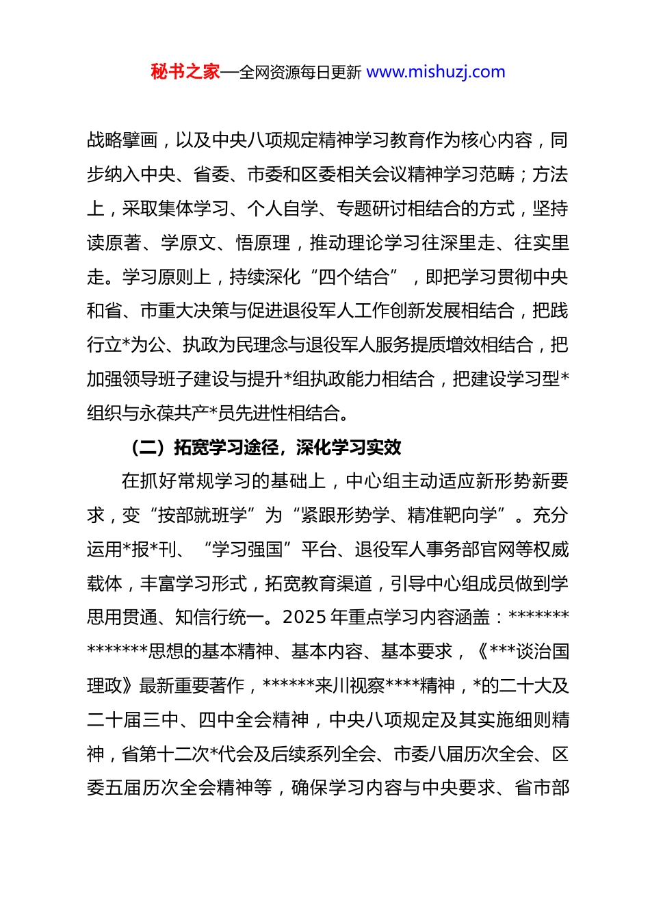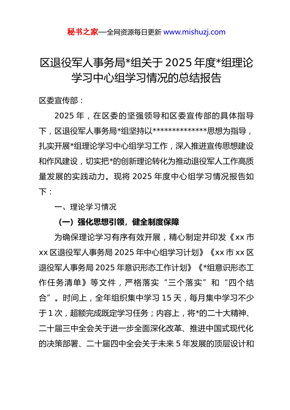秘书之家—全网资源每日更新 www.mishuzj.com区退役军人事务局*组关于 2025 年度*组理论学习中心组学习情况的总结报告区委宣传部:2025 年,在区委的坚强领导和区委宣传部的具体指导下,区退役军人事务局*组坚持以**************思想为指导,扎实开展*组理论学习中心组学习工作,深入推进宣传思想建设和作风建设,切实把*的创新理论转化为推动退役军人工作高质量发展的实践动力。现将 2025 年度中心组学习情况报告如下:一、理论学习情况(一)强化思想引领,健全制度保障为确保理论学习有序有效开展,精心制定并印发《xx 市xx 区退役军人事务局 2025 年中心组学习计划》《xx 市 xx 区退役军人事务局 2025 年意识形态工作计划》《*组意识形态工作任务清单》等文件,严格落实“三个落实”和“四个结合”。时间上,全年组织集中学习 15 天,每月集中学习不少于 1 次,超额完成既定学习任务;内容上,将*的二十大精神、二十届三中全会关于进一步全面深化改革、推进中国式现代化的决策部署、二十届四中全会关于未来 5 年发展的顶层设计和秘书之家—全网资源每日更新 www.mishuzj.com战略擘画,以及中央八项规定精神学习教育作为核心内容,同步纳入中央、省委、市委和区委相关会议精神学习范畴;方法上,采取集体学习、个人自学、专题研讨相结合的方式,坚持读原著、学原文、悟原理,推动理论学习往深里走、往实里走。学习原则上,持续深化“四个结合”,即把学习贯彻中央和省、市重大决策与促进退役军人工作创新发展相结合,把践行立*为公、执政为民理念与退役军人服务提质增效相结合,把加强领导班子建设与提升*组执政能力相结合,把建设学习型*组织与永葆共产*员先进性相结合。(二)拓宽学习途径,深化学习实效在抓好常规学习的基础上,中心组主动适应新形势新要求,变“按部就班学”为“紧跟形势学、精准靶向学”。充分运用*报*刊、“学习强国”平台、退役军人事务部官网等权威载体,丰富学习形式,拓宽教育渠道,引导中心组成员做到学思用贯通、知信行统一。2025 年重点学习内容涵盖:**************思想的基本精神、基本内容、基本要求,《***谈治国理政》最新重要著作,******来川视察****精神,*的二十大及二十届三中、四中全会精神,中央八项规定及其实施细则精神,省第十二次*代会及后续系列全会、市委八届历次全会、区委五届历次全会精神等,确保学习内容与中央要求、省市部秘书之家—全网资源每日更新 www.mishuzj.com署、地方实际同频共振。(三)坚持学用结合,推动成果转化1.在“实”字上发力,锚定服务保障主业。围绕学习成果落地,深化军地共建内涵,联合区人武部、石洞镇*委政府,升级“一等功臣之家”示范载体,新增退役军人荣誉展示厅、国防教育研学点,全年接待参观学习 1.2 万人次,获评全市退役军人服务保障示范标杆。2.在“严”字上立标,深化作风建设成效。以中央八项规定精神学习教育为抓手,开展“作风建设提升年”活动,组织中心组成员赴廉政教育基地实地研学 2 次,召开专题民主生活会 1 次,查摆整改服务态度、工作效能等方面问题 8 项,推动干部作风持续转变。3.在“用”字上见效,破解发展实际难题。聚焦退役军人就业创业、优抚安置、权益维护等重点工作,将学习成果转化为具体举措。联合区内 3 家重点企业建立退役军人就业见习基地,举办专场招聘会 4 场,帮助 156 名退役军人实现稳定就业;优化“一站式”服务流程,将退役军人优待证办理、优抚金申领等 12 项业务压缩至 3 个工作日内办结,群众满意度达98%以上。二、理论学习特点秘书之家—全网资源每日更新 www.mishuzj.com(一)领导示范引领强*组书记、组长切实履行第一责任人职责,亲自审定学习计划、主持集中学习、督促学习落实,带头开展自学、撰写心得体会 6 篇、作专题辅导报告 3 次。班子成员以身作则,主动参与学习研讨、带头破解工作难题,在中心组内部形成了“一级带一级、全员抓学习”的良好氛围。(二)学习方式载体活坚持集中学习与个人自学相结合,2025 年中心组成员每人完成 8 次重点发言讨论,均提前准备书面材料,发言质量显...