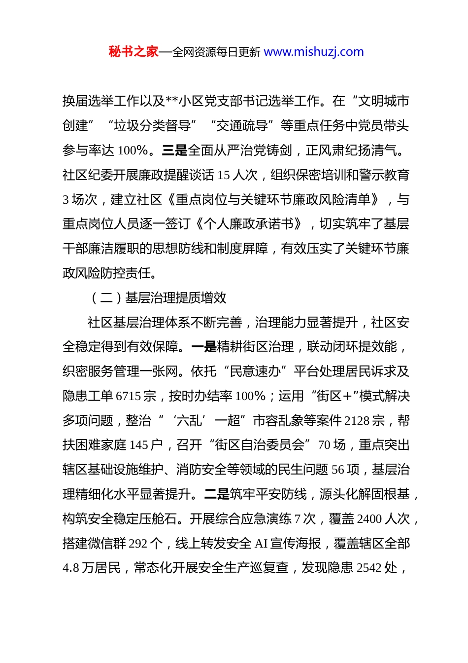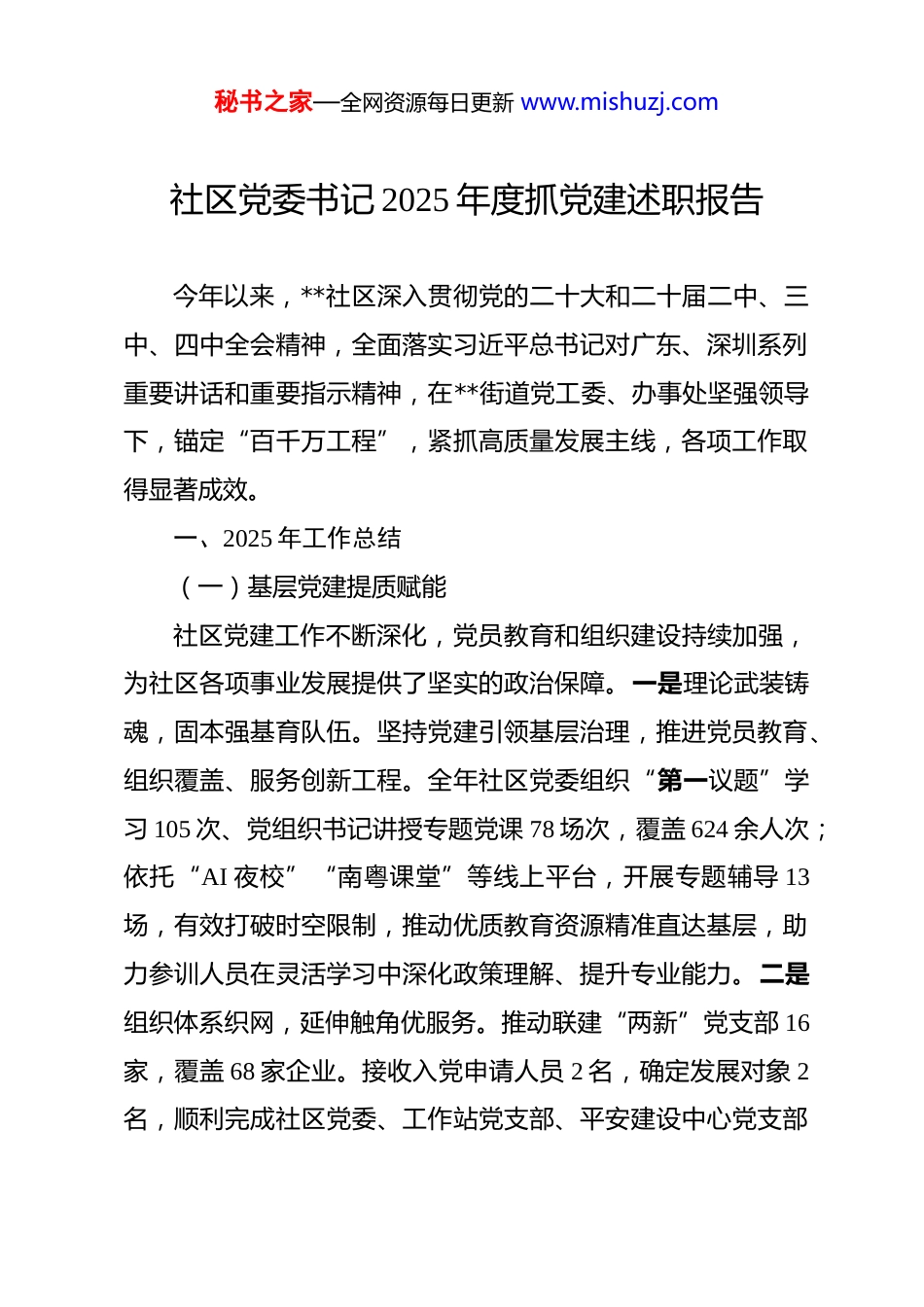秘书之家—全网资源每日更新 www.mishuzj.com社区党委书记 2025 年度抓党建述职报告 今年以来,**社区深入贯彻党的二十大和二十届二中、三中、四中全会精神,全面落实习近平总书记对广东、深圳系列重要讲话和重要指示精神,在**街道党工委、办事处坚强领导下,锚定“百千万工程”,紧抓高质量发展主线,各项工作取得显著成效。一、2025 年工作总结(一)基层党建提质赋能社区党建工作不断深化,党员教育和组织建设持续加强,为社区各项事业发展提供了坚实的政治保障。一是理论武装铸魂,固本强基育队伍。坚持党建引领基层治理,推进党员教育、组织覆盖、服务创新工程。全年社区党委组织“第一议题”学习 105 次、党组织书记讲授专题党课 78 场次,覆盖 624 余人次;依托“AI 夜校”“南粤课堂”等线上平台,开展专题辅导 13场,有效打破时空限制,推动优质教育资源精准直达基层,助力参训人员在灵活学习中深化政策理解、提升专业能力。二是组织体系织网,延伸触角优服务。推动联建“两新”党支部 16家,覆盖 68 家企业。接收入党申请人员 2 名,确定发展对象 2名,顺利完成社区党委、工作站党支部、平安建设中心党支部秘书之家—全网资源每日更新 www.mishuzj.com换届选举工作以及**小区党支部书记选举工作。在“文明城市创建”“垃圾分类督导”“交通疏导”等重点任务中党员带头参与率达 100%。三是全面从严治党铸剑,正风肃纪扬清气。社区纪委开展廉政提醒谈话 15 人次,组织保密培训和警示教育3 场次,建立社区《重点岗位与关键环节廉政风险清单》,与重点岗位人员逐一签订《个人廉政承诺书》,切实筑牢了基层干部廉洁履职的思想防线和制度屏障,有效压实了关键环节廉政风险防控责任。(二)基层治理提质增效社区基层治理体系不断完善,治理能力显著提升,社区安全稳定得到有效保障。一是精耕街区治理,联动闭环提效能,织密服务管理一张网。依托“民意速办”平台处理居民诉求及隐患工单 6715 宗,按时办结率 100%;运用“街区+”模式解决多项问题,整治“‘六乱’一超”市容乱象等案件 2128 宗,帮扶困难家庭 145 户,召开“街区自治委员会”70 场,重点突出辖区基础设施维护、消防安全等领域的民生问题 56 项,基层治理精细化水平显著提升。二是筑牢平安防线,源头化解固根基,构筑安全稳定压舱石。开展综合应急演练 7 次,覆盖 2400 人次,搭建微信群 292 个,线上转发安全 AI 宣传海报,覆盖辖区全部4.8 万居民,常态化开展安全生产巡复查,发现隐患 2542 处,秘书之家—全网资源每日更新 www.mishuzj.com整改率 100%;落实辖区所有企业场所严格执行扫码入企措施,全年扫码入企 164 家次,实现轨迹溯源排查全覆盖;针对“三小场所”违规住人、电动车违规充电等问题,开展专项整治行动 71 次,安全生产形势保持平稳。深化“一站式”多元解纷机制,整合社区法律顾问、调解员、心理咨询师等力量。全年接访案件 1218 宗,法律咨询 69 宗,受理矛盾纠纷 1157 宗,成功调解 1099 宗,调解成功率 95%。形成“全民参与、全民防控”应急管理格局,辖区安全生产形势持续稳定向好,安全防线全面筑牢。三是心系党群服务,多元供给连民心,提升幸福归属向心力。构建“需求清单—资源清单—服务清单”联动机制,召开“社区书记茶话会”12 场,累计解决道路修缮、劳资纠纷等民生需求问题 14 件,开展“微心愿”认领活动,帮助新疆喀什困难家庭、社区孤寡老人、残障人士等群体实现心愿 20 个,社区归属感、幸福感显著提升,“亲邻服务”更加多元,党群“连心桥”作用更加彰显。(三)高质量发展提质惠民社区人居环境不断改善,民生保障更加坚实,集体经济发展取得显著成效。一是推进集体经济升级,内生动力持续增强。发挥社区党委在集体经济发展中的把关定向作用,指导辖区 9家股份合作公司规范运营、健康发展。在二届区委第十轮巡察秘书之家—全网资源每日更新 www.mishuzj.com整改工作中股份公司追损挽损 659.441 万元。**一期项目启动以来截至 2025 年 12 月,累计完成投资 118.6 亿元,较去年增投61.4 亿...
