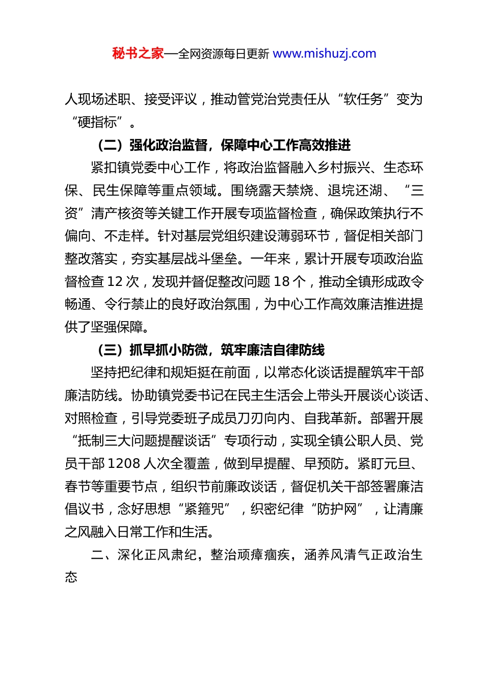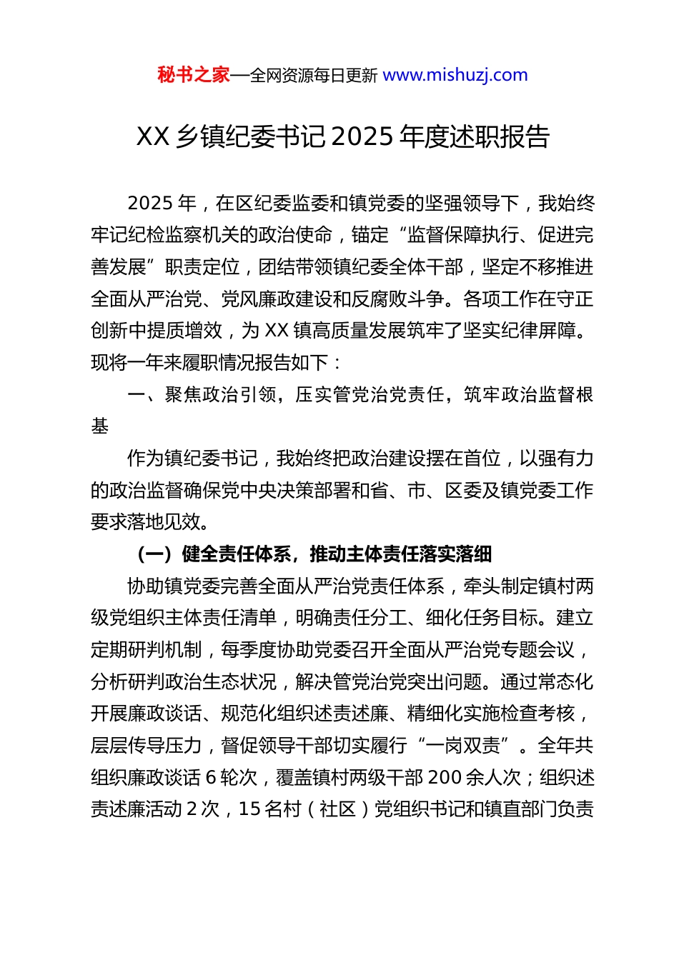 秘书之家—全网资源每日更新 www.mishuzj.comXX 乡镇纪委书记 2025 年度述职报告2025 年,在区纪委监委和镇党委的坚强领导下,我始终牢记纪检监察机关的政治使命,锚定“监督保障执行、促进完善发展”职责定位,团结带领镇纪委全体干部,坚定不移推进全面从严治党、党风廉政建设和反腐败斗争。各项工作在守正创新中提质增效,为 XX 镇高质量发展筑牢了坚实纪律屏障。现将一年来履职情况报告如下:一、聚焦政治引领,压实管党治党责任,筑牢政治监督根基作为镇纪委书记,我始终把政治建设摆在首位,以强有力的政治监督确保党中央决策部署和省、市、区委及镇党委工作要求落地见效。(一)健全责任体系,推动主体责任落实落细协助镇党委完善全面从严治党责任体系,牵头制定镇村两级党组织主体责任清单,明确责任分工、细化任务目标。建立定期研判机制,每季度协助党委召开全面从严治党专题会议,分析研判政治生态状况,解决管党治党突出问题。通过常态化开展廉政谈话、规范化组织述责述廉、精细化实施检查考核,层层传导压力,督促领导干部切实履行“一岗双责”。全年共组织廉政谈话 6 轮次,覆盖镇村两级干部 200 余人次;组织述责述廉活动 2 次,15 名村(社区)党组织书记和镇直部门负责秘书之家—全网资源每日更新 www.mishuzj.com人现场述职、接受评议,推动管党治党责任从“软任务”变为“硬指标”。(二)强化政治监督,保障中心工作高效推进紧扣镇党委中心工作,将政治监督融入乡村振兴、生态环保、民生保障等重点领域。围绕露天禁烧、退垸还湖、“三资”清产核资等关键工作开展专项监督检查,确保政策执行不偏向、不走样。针对基层党组织建设薄弱环节,督促相关部门整改落实,夯实基层战斗堡垒。一年来,累计开展专项政治监督检查 12 次,发现并督促整改问题 18 个,推动全镇形成政令畅通、令行禁止的良好政治氛围,为中心工作高效廉洁推进提供了坚强保障。(三)抓早抓小防微,筑牢廉洁自律防线坚持把纪律和规矩挺在前面,以常态化谈话提醒筑牢干部廉洁防线。协助镇党委书记在民主生活会上带头开展谈心谈话、对照检查,引导党委班子成员刀刃向内、自我革新。部署开展“抵制三大问题提醒谈话”专项行动,实现全镇公职人员、党员干部 1208 人次全覆盖,做到早提醒、早预防。紧盯元旦、春节等重要节点,组织节前廉政谈话,督促机关干部签署廉洁倡议书,念好思想“紧箍咒”,织密纪律“防护网”,让清廉之风融入日常工作和生活。二、深化正风肃纪,整治顽瘴痼疾,涵养风清气正政治生态秘书之家—全网资源每日更新 www.mishuzj.com始终保持作风建设永远在路上的坚韧和执着,以钉钉子精神纠治“四风”,严肃查处群众身边的不正之风和腐败问题,推动党风政风持续向好。(一)驰而不息纠治“四风”,推动作风建设常态化长效化严格落实中央八项规定及其实施细则精神,紧盯重要节点开展高频次明察暗访。围绕公款吃喝、公款送礼、公车私用等隐形变异问题,全年累计开展监督检查 340 余人次,发现并纠正苗头性问题 22 个。聚焦形式主义、官僚主义突出问题,针对文山会海、检查考核过多过滥、服务群众冷硬横推等现象开展专项整治,督促相关部门精简会议文件、优化考核指标,切实为基层减负。通过一系列整治行动,干部队伍工作作风明显转变,服务群众的效率和质量显著提升。(二)精准开展专项监督,维护群众切身利益坚持以人民为中心的发展思想,聚焦群众急难愁盼问题开展专项监督。围绕群众身边不正之风和腐败问题、惠民政策落实等重点领域,全年开展专项检查 32 次,累计监督检查 430余人次,发现并督促整改问题 40 个。强化“八小时内外”监督管理,开展节假日作风巡查 362 人次;针对辖区内中餐饮酒、工作日饮酒问题开展突击检查 3 次,涉及 162 人次,对 3 名违规人员进行诫勉谈话,形成有力震慑。通过靶向监督、精准发力,推动各项惠民政策在“最后一公里”落地见效,切实增强秘书之家—全网资源每日更新 www.mishuzj.com群众的获得感、幸福感和安全感。(三)深化运用“四种形态”,提升监督执纪质效坚持严管和厚爱结合、激励和约束并重...