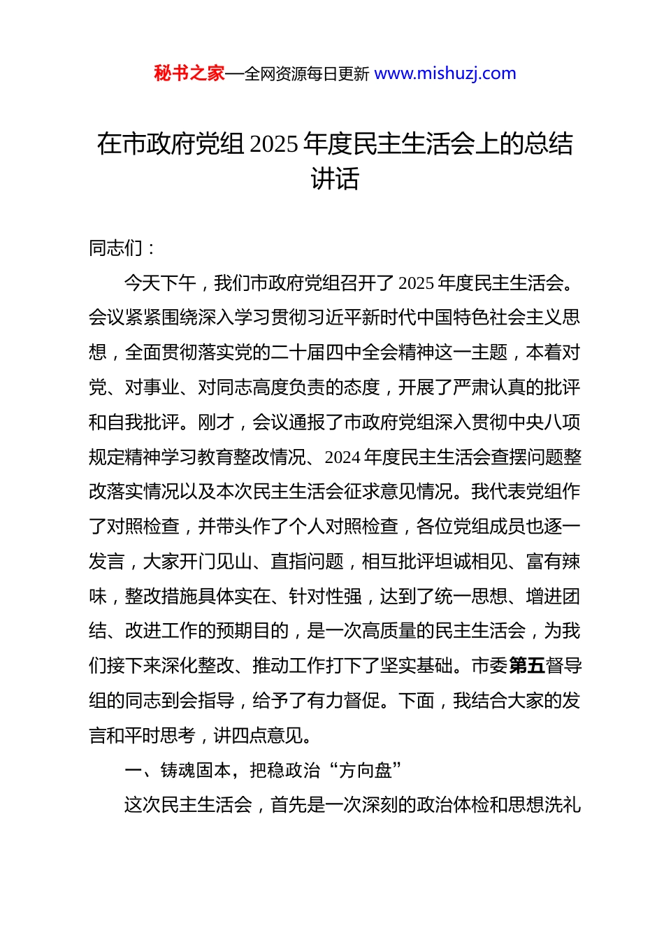 秘书之家—全网资源每日更新 www.mishuzj.com在市政府党组 2025 年度民主生活会上的总结讲话 同志们:今天下午,我们市政府党组召开了 2025 年度民主生活会。会议紧紧围绕深入学习贯彻习近平新时代中国特色社会主义思想,全面贯彻落实党的二十届四中全会精神这一主题,本着对党、对事业、对同志高度负责的态度,开展了严肃认真的批评和自我批评。刚才,会议通报了市政府党组深入贯彻中央八项规定精神学习教育整改情况、2024 年度民主生活会查摆问题整改落实情况以及本次民主生活会征求意见情况。我代表党组作了对照检查,并带头作了个人对照检查,各位党组成员也逐一发言,大家开门见山、直指问题,相互批评坦诚相见、富有辣味,整改措施具体实在、针对性强,达到了统一思想、增进团结、改进工作的预期目的,是一次高质量的民主生活会,为我们接下来深化整改、推动工作打下了坚实基础。市委第五督导组的同志到会指导,给予了有力督促。下面,我结合大家的发言和平时思考,讲四点意见。一、铸魂固本,把稳政治“方向盘”这次民主生活会,首先是一次深刻的政治体检和思想洗礼秘书之家—全网资源每日更新 www.mishuzj.com大家查摆问题,往往从政治上看就能找到根源;大家开展批评,也常常指向政治上的偏差。这说明,政治建设是根本性建设,必须摆在首位。*作为自治区首府,政治属性是第一属性,讲政治是第一位的要求。我们市政府党组每一位成员,都必须成为政治上的明白人、老实人,始终在思想上政治上行动上同以习近平同志为核心的党中央保持高度一致。这不仅是抽象的原则,更要落实到具体行动中,体现在我们推动首府高质量发展的每一项工作、每一个环节里。刚才不少同志在对照检查中都谈到了理论武装不够深入、政治判断力有待提高等问题,这警示我们必须时刻绷紧政治这根弦,不断巩固拓展主题教育成果,从党的创新理论中汲取智慧和力量,筑牢信仰之基、补足精神之钙、把稳思想之舵。(一)要深学细悟党的创新理论,筑牢“压舱石”。政治上的坚定,源于理论上的清醒。习近平新时代中国特色社会主义思想是当代中国的马克思主义、二十一世纪的马克思主义,是我们做好一切工作的“指南针”和“金钥匙”。满足于一般化学习、碎片化理解是远远不够的,必须下一番真功夫、苦功夫,坚持读原著、学原文、悟原理,深刻把握其核心要义、精神实质、丰富内涵和实践要求。要紧密结合习近平总书记对内蒙古的重要讲话重要指示批示精神来学,深刻领悟“两个确秘书之家—全网资源每日更新 www.mishuzj.com立”的决定性意义,将其转化为做到“两个维护”的高度自觉。学习不能停留在笔记本上、口头上,要真正融入思想、融入工作,比如,在谋划推动首府经济转型、加强生态文明建设、保障改善民生时,要自觉从中找思路、找方法、找答案,确保各项工作始终沿着正确政治方向前进。要发扬“挤”和“钻”的精神,克服“工作忙、没时间学”的借口,把学习作为一种政治责任、一种生活方式,不断提高运用党的创新理论观察时代、把握时代、引领时代的能力。(二)要严守党的政治纪律规矩,架起“高压线”。没有规矩,不成方圆。党的政治纪律和政治规矩是党最重要、最根本、最关键的纪律,是带电的“高压线”。市政府党组作为全市政府系统的“领头雁”,必须在严守政治纪律和政治规矩上标准更高、要求更严。要时刻牢记自己的第一身份是共产党员,第一职责是为党工作,始终做到对党忠诚老实,决不允许在重大政治原则问题上同党中央唱反调、搞自由主义。要严格执行《关于新形势下党内政治生活的若干准则》,自觉维护班子团结,坚持民主集中制,重大决策、重要事项该请示的必须请示、该报告的必须报告,决不能搞先斩后奏、边斩边奏,甚至斩而不奏。要坚决反对“七个有之”,切实做到“五个必须”,在各种诱惑和考验面前保持政治定力,始终做政治上的明白人。秘书之家—全网资源每日更新 www.mishuzj.com要带头净化政治生态,坚决抵制和反对关系学、厚黑学、官场术等封建腐朽文化,倡导清清爽爽的同志关系、规规矩矩的上下级关系,营造风清气正的从政环境。(三)要提高政治能力锤炼党性,当好“风向标”。讲...