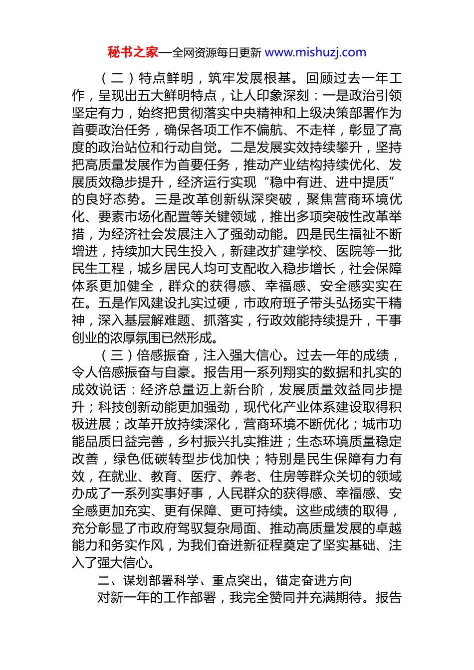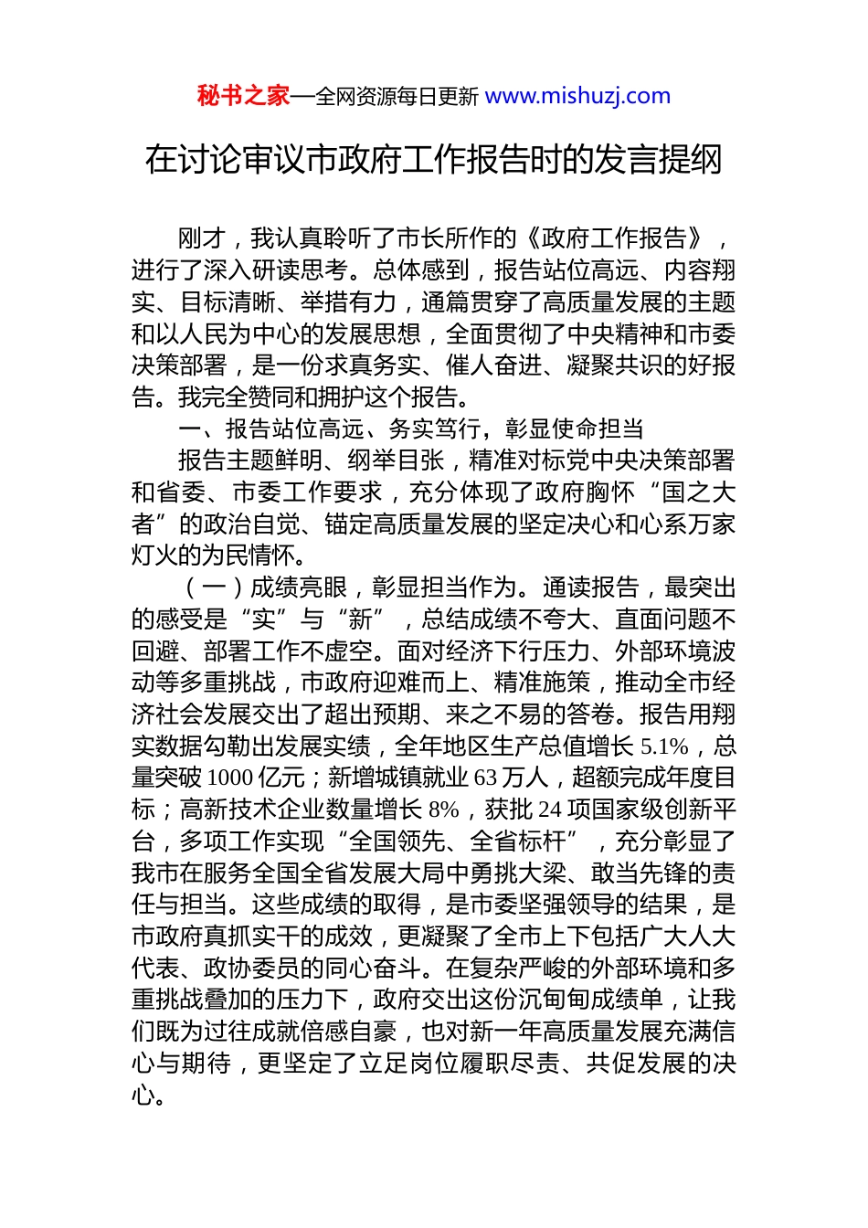 秘书之家—全网资源每日更新 www.mishuzj.com在讨论审议市政府工作报告时的发言提纲刚才,我认真聆听了市长所作的《政府工作报告》,进行了深入研读思考。总体感到,报告站位高远、内容翔实、目标清晰、举措有力,通篇贯穿了高质量发展的主题和以人民为中心的发展思想,全面贯彻了中央精神和市委决策部署,是一份求真务实、催人奋进、凝聚共识的好报告。我完全赞同和拥护这个报告。一、报告站位高远、务实笃行,彰显使命担当报告主题鲜明、纲举目张,精准对标党中央决策部署和省委、市委工作要求,充分体现了政府胸怀“国之大者”的政治自觉、锚定高质量发展的坚定决心和心系万家灯火的为民情怀。(一)成绩亮眼,彰显担当作为。通读报告,最突出的感受是“实”与“新”,总结成绩不夸大、直面问题不回避、部署工作不虚空。面对经济下行压力、外部环境波动等多重挑战,市政府迎难而上、精准施策,推动全市经济社会发展交出了超出预期、来之不易的答卷。报告用翔实数据勾勒出发展实绩,全年地区生产总值增长 5.1%,总量突破 1000 亿元;新增城镇就业 63 万人,超额完成年度目标;高新技术企业数量增长 8%,获批 24 项国家级创新平台,多项工作实现“全国领先、全省标杆”,充分彰显了我市在服务全国全省发展大局中勇挑大梁、敢当先锋的责任与担当。这些成绩的取得,是市委坚强领导的结果,是市政府真抓实干的成效,更凝聚了全市上下包括广大人大代表、政协委员的同心奋斗。在复杂严峻的外部环境和多重挑战叠加的压力下,政府交出这份沉甸甸成绩单,让我们既为过往成就倍感自豪,也对新一年高质量发展充满信心与期待,更坚定了立足岗位履职尽责、共促发展的决心。秘书之家—全网资源每日更新 www.mishuzj.com(二)特点鲜明,筑牢发展根基。回顾过去一年工作,呈现出五大鲜明特点,让人印象深刻:一是政治引领坚定有力,始终把贯彻落实中央精神和上级决策部署作为首要政治任务,确保各项工作不偏航、不走样,彰显了高度的政治站位和行动自觉。二是发展实效持续攀升,坚持把高质量发展作为首要任务,推动产业结构持续优化、发展质效稳步提升,经济运行实现“稳中有进、进中提质”的良好态势。三是改革创新纵深突破,聚焦营商环境优化、要素市场化配置等关键领域,推出多项突破性改革举措,为经济社会发展注入了强劲动能。四是民生福祉不断增进,持续加大民生投入,新建改扩建学校、医院等一批民生工程,城乡居民人均可支配收入稳步增长,社会保障体系更加健全,群众的获得感、幸福感、安全感实实在在。五是作风建设扎实过硬,市政府班子带头弘扬实干精神,深入基层解难题、抓落实,行政效能持续提升,干事创业的浓厚氛围已然形成。(三)倍感振奋,注入强大信心。过去一年的成绩,令人倍感振奋与自豪。报告用一系列翔实的数据和扎实的成效说话:经济总量迈上新台阶,发展质量效益同步提升;科技创新动能更加强劲,现代化产业体系建设取得积极进展;改革开放持续深化,营商环境不断优化;城市功能品质日益完善,乡村振兴扎实推进;生态环境质量稳定改善,绿色低碳转型步伐加快;特别是民生保障有力有效,在就业、教育、医疗、养老、住房等群众关切的领域办成了一系列实事好事,人民群众的获得感、幸福感、安全感更加充实、更有保障、更可持续。这些成绩的取得,充分彰显了市政府驾驭复杂局面、推动高质量发展的卓越能力和务实作风,为我们奋进新征程奠定了坚实基础、注入了强大信心。二、谋划部署科学、重点突出,锚定奋进方向对新一年的工作部署,我完全赞同并充满期待。报告秘书之家—全网资源每日更新 www.mishuzj.com对当前形势的分析清醒深刻,提出的目标任务科学合理,部署的工作举措精准务实,既立足当前破解发展难题,又着眼长远谋划高质量发展,既体现了稳中求进的工作总基调,又展现了走在前列、先行示范的担当作为,方向明确、路径清晰、切实可行,完全符合我市发展实际和群众期盼。无论是聚焦新质生产力培育、现代化产业体系建设的核心任务,还是围绕民生改善、城乡融合的重点举措,都体现了市委、市政府系统思维、底线思维和创新思维,为我们明确了工作路径、...