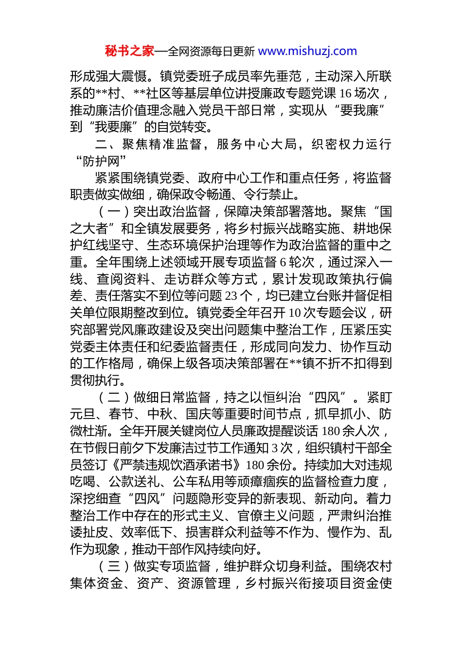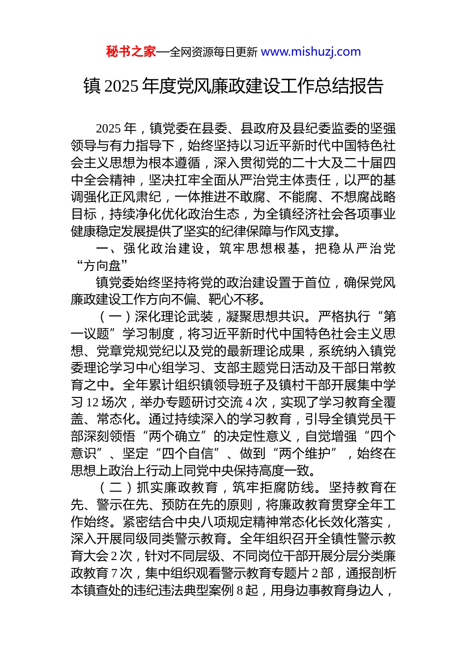 秘书之家—全网资源每日更新 www.mishuzj.com镇 2025 年度党风廉政建设工作总结报告2025 年,镇党委在县委、县政府及县纪委监委的坚强领导与有力指导下,始终坚持以习近平新时代中国特色社会主义思想为根本遵循,深入贯彻党的二十大及二十届四中全会精神,坚决扛牢全面从严治党主体责任,以严的基调强化正风肃纪,一体推进不敢腐、不能腐、不想腐战略目标,持续净化优化政治生态,为全镇经济社会各项事业健康稳定发展提供了坚实的纪律保障与作风支撑。一、强化政治建设,筑牢思想根基,把稳从严治党“方向盘”镇党委始终坚持将党的政治建设置于首位,确保党风廉政建设工作方向不偏、靶心不移。(一)深化理论武装,凝聚思想共识。严格执行“第一议题”学习制度,将习近平新时代中国特色社会主义思想、党章党规党纪以及党的最新理论成果,系统纳入镇党委理论学习中心组学习、支部主题党日活动及干部日常教育之中。全年累计组织镇领导班子及镇村干部开展集中学习 12 场次,举办专题研讨交流 4 次,实现了学习教育全覆盖、常态化。通过持续深入的学习教育,引导全镇党员干部深刻领悟“两个确立”的决定性意义,自觉增强“四个意识”、坚定“四个自信”、做到“两个维护”,始终在思想上政治上行动上同党中央保持高度一致。(二)抓实廉政教育,筑牢拒腐防线。坚持教育在先、警示在先、预防在先的原则,将廉政教育贯穿全年工作始终。紧密结合中央八项规定精神常态化长效化落实,深入开展同级同类警示教育。全年组织召开全镇性警示教育大会 2 次,针对不同层级、不同岗位干部开展分层分类廉政教育 7 次,集中组织观看警示教育专题片 2 部,通报剖析本镇查处的违纪违法典型案例 8 起,用身边事教育身边人,秘书之家—全网资源每日更新 www.mishuzj.com形成强大震慑。镇党委班子成员率先垂范,主动深入所联系的**村、**社区等基层单位讲授廉政专题党课 16 场次,推动廉洁价值理念融入党员干部日常,实现从“要我廉”到“我要廉”的自觉转变。二、聚焦精准监督,服务中心大局,织密权力运行“防护网”紧紧围绕镇党委、政府中心工作和重点任务,将监督职责做实做细,确保政令畅通、令行禁止。(一)突出政治监督,保障决策部署落地。聚焦“国之大者”和全镇发展要务,将乡村振兴战略实施、耕地保护红线坚守、生态环境保护治理等作为政治监督的重中之重。全年围绕上述领域开展专项监督 6 轮次,通过深入一线、查阅资料、走访群众等方式,累计发现政策执行偏差、责任落实不到位等问题 23 个,均已建立台账并督促相关单位限期整改到位。镇党委全年召开 10 次专题会议,研究部署党风廉政建设及突出问题集中整治工作,压紧压实党委主体责任和纪委监督责任,形成同向发力、协作互动的工作格局,确保上级各项决策部署在**镇不折不扣得到贯彻执行。(二)做细日常监督,持之以恒纠治“四风”。紧盯元旦、春节、中秋、国庆等重要时间节点,抓早抓小、防微杜渐。全年开展关键岗位人员廉政提醒谈话 180 余人次,在节假日前夕下发廉洁过节工作通知 3 次,组织镇村干部全员签订《严禁违规饮酒承诺书》180 余份。持续加大对违规吃喝、公款送礼、公车私用等顽瘴痼疾的监督检查力度,深挖细查“四风”问题隐形变异的新表现、新动向。着力整治工作中存在的形式主义、官僚主义问题,严肃纠治推诿扯皮、效率低下、损害群众利益等不作为、慢作为、乱作为现象,推动干部作风持续向好。(三)做实专项监督,维护群众切身利益。围绕农村集体资金、资产、资源管理,乡村振兴衔接项目资金使秘书之家—全网资源每日更新 www.mishuzj.com用,低保、特困、临时救助等社会救助补贴发放等群众关切、廉政风险较高的重点领域,深入开展专项监督检查。综合运用数据比对、财务审计、实地核查、入户走访等多种手段,对相关政策的落实情况、资金的管理使用效益、项目的建设质量进度进行全方位体检。通过专项监督,有效确保了各类惠民惠农资金安全规范运行,推动各项利民政策精准落地,切实增强了人民群众的获得感、幸福感、安全感。三、深化执纪问责,保持高压态势,提升综合治理“震慑力”始终坚...