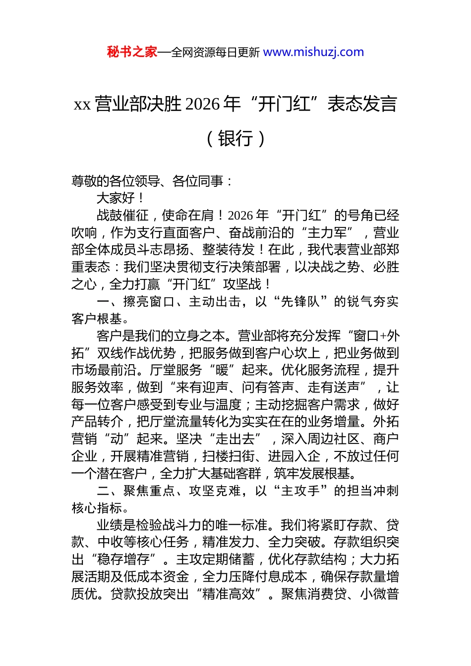 秘书之家—全网资源每日更新 www.mishuzj.comxx 营业部决胜 2026 年“开门红”表态发言(银行)尊敬的各位领导、各位同事:大家好!战鼓催征,使命在肩!2026 年“开门红”的号角已经吹响,作为支行直面客户、奋战前沿的“主力军”,营业部全体成员斗志昂扬、整装待发!在此,我代表营业部郑重表态:我们坚决贯彻支行决策部署,以决战之势、必胜之心,全力打赢“开门红”攻坚战!一、擦亮窗口、主动出击,以“先锋队”的锐气夯实客户根基。客户是我们的立身之本。营业部将充分发挥“窗口+外拓”双线作战优势,把服务做到客户心坎上,把业务做到市场最前沿。厅堂服务“暖”起来。优化服务流程,提升服务效率,做到“来有迎声、问有答声、走有送声”,让每一位客户感受到专业与温度;主动挖掘客户需求,做好产品转介,把厅堂流量转化为实实在在的业务增量。外拓营销“动”起来。坚决“走出去”,深入周边社区、商户企业,开展精准营销,扫楼扫街、进园入企,不放过任何一个潜在客户,全力扩大基础客群,筑牢发展根基。二、聚焦重点、攻坚克难,以“主攻手”的担当冲刺核心指标。业绩是检验战斗力的唯一标准。我们将紧盯存款、贷款、中收等核心任务,精准发力、全力突破。存款组织突出“稳存增存”。主攻定期储蓄,优化存款结构;大力拓展活期及低成本资金,全力压降付息成本,确保存款量增质优。贷款投放突出“精准高效”。聚焦消费贷、小微普秘书之家—全网资源每日更新 www.mishuzj.com惠贷等重点产品,加快审批节奏,确保符合条件的需求应投尽投、早投快投。中收开拓突出“量质并举”。重点突破保险、基金、信用卡等业务,提升创收能力,优化收入结构。三、凝聚合力、强化执行,以“排头兵”的作风确保使命必达。胜利源于团队,成功在于执行。营业部将营造“人人争先、个个出力”的浓厚氛围,确保各项措施落地见效。责任落实到人。将任务分解到岗、到人,建立“日通报、周复盘”机制,做到目标明确、责任清晰。激发团队潜能强化绩效考核正向激励,营造“比、学、赶、超”竞争氛围,让实干者得利,让贡献者出彩。强化协同作战。加强前台营销与后台支持的联动,形成目标同向、工作同步、责任同担的战斗集体。初心如磐,何惧风雪兼程;壮志在胸,必当捷报频传!2026 年“开门红”的号角已经吹响,营业部全体将士将以“闻令即动、战无不胜”的信念,把指标刻在心上、把责任扛在肩上,以“不待扬鞭自奋蹄”的自觉、“越是艰险越向前”的勇毅,坚决完成支行下达的各项任务,用优异的业绩为 2026 年高质量发展打响头炮、赢得开门红!2026 年“开门红”,我们必胜!谢谢大家!