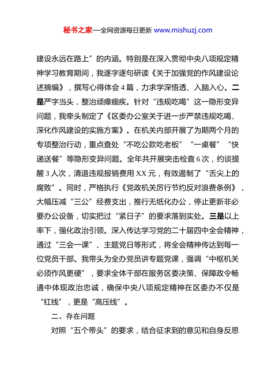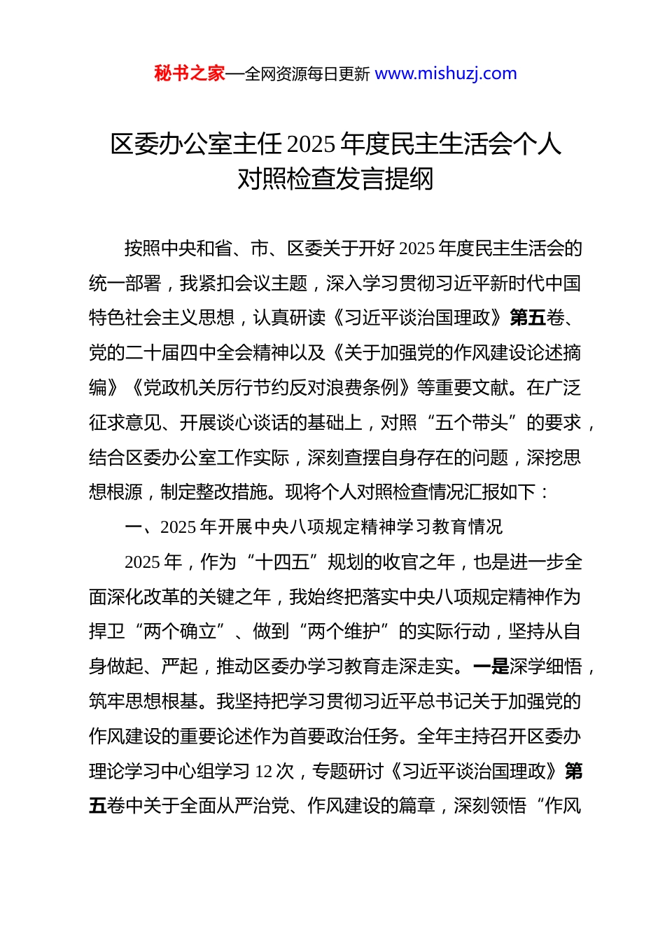 秘书之家—全网资源每日更新 www.mishuzj.com区委办公室主任 2025 年度民主生活会个人对照检查发言提纲 按照中央和省、市、区委关于开好 2025 年度民主生活会的统一部署,我紧扣会议主题,深入学习贯彻习近平新时代中国特色社会主义思想,认真研读《习近平谈治国理政》第五卷、党的二十届四中全会精神以及《关于加强党的作风建设论述摘编》《党政机关厉行节约反对浪费条例》等重要文献。在广泛征求意见、开展谈心谈话的基础上,对照“五个带头”的要求,结合区委办公室工作实际,深刻查摆自身存在的问题,深挖思想根源,制定整改措施。现将个人对照检查情况汇报如下:一、2025 年开展中央八项规定精神学习教育情况2025 年,作为“十四五”规划的收官之年,也是进一步全面深化改革的关键之年,我始终把落实中央八项规定精神作为捍卫“两个确立”、做到“两个维护”的实际行动,坚持从自身做起、严起,推动区委办学习教育走深走实。一是深学细悟,筑牢思想根基。我坚持把学习贯彻习近平总书记关于加强党的作风建设的重要论述作为首要政治任务。全年主持召开区委办理论学习中心组学习 12 次,专题研讨《习近平谈治国理政》第五卷中关于全面从严治党、作风建设的篇章,深刻领悟“作风秘书之家—全网资源每日更新 www.mishuzj.com建设永远在路上”的内涵。特别是在深入贯彻中央八项规定精神学习教育期间,我逐字逐句研读《关于加强党的作风建设论述摘编》,撰写心得体会 4 篇,力求学深悟透、入脑入心。二是严字当头,整治顽瘴痼疾。针对“违规吃喝”这一隐形变异问题,我牵头制定了《区委办公室关于进一步严禁违规吃喝、深化作风建设的实施方案》。在机关内部开展了为期两个月的专项整治行动,重点查处“不吃公款吃老板”“一桌餐”“快递送餐”等隐形变异问题。全年共开展突击检查 6 次,约谈提醒 3 人次,清退违规报销费用 XX 元,有效遏制了“舌尖上的腐败”。同时,严格执行《党政机关厉行节约反对浪费条例》,大幅压减“三公”经费支出,推行无纸化办公,停止更新非必要办公设备,切实把过“紧日子”的要求落到实处。三是以上率下,强化政治引领。深入传达学习党的二十届四中全会精神,通过“三会一课”、主题党日等形式,将全会精神传达到每一位党员干部。我带头为全办党员讲专题党课,强调“中枢机关必须作风更硬”,要求全体干部在服务区委决策、保障政令畅通中体现政治忠诚,确保中央八项规定精神在区委办不仅是“红线”,更是“高压线”。二、存在问题对照“五个带头”的要求,结合征求到的意见和自身反思秘书之家—全网资源每日更新 www.mishuzj.com我深刻查摆出以下五个方面的突出问题:(一)在带头强化政治忠诚、提高政治能力方面。一是政治敏锐性还不够强。虽然能够坚持读原著、学原文,但在从政治高度审视具体业务工作上还有差距。例如,在审核部分部门起草的文件时,有时过于关注文字表述和格式规范,对其中隐含的政治偏差、政策走向把握不够精准,未能及时从政治安全和意识形态安全的角度提出修正意见,存在“重业务、轻政治”的倾向。二是理论联系实际不够紧密。学习《习近平谈治国理政》第五卷时,存在“急学现用”的实用主义心态,对新发展理念的理解还停留在概念层面,未能完全将其转化为推动区委办“三服务”工作高质量发展的具体思路和举措。在贯彻党的二十届四中全会精神中,对如何通过深化改革提升办公室运转效率,思考得还不够深,谋划改革的举措不够多。(二)在带头固本培元、增强党性方面。一是党性锻炼有所松懈。随着工作年限增长,有时产生了“松口气、歇歇脚”的念头。在参加双重组织生活时,自我批评往往避重就轻,批评他人时顾虑多、辣味少,存在“老好人”思想。在落实中央八项规定精神上,虽然大方向守住了,但在一些生活细节上,偶尔存在“水至清则无鱼”的错误认识,对“小节”的警惕性不如从前。二是理想信念教育形式单一。作为办公室主任,在秘书之家—全网资源每日更新 www.mishuzj.com抓机关党建时,多是读文件、看录像,缺乏沉浸式、体验式的教育手段。在弘扬伟大建党精神方面,引导干部从党的百年奋斗史中汲取力量...