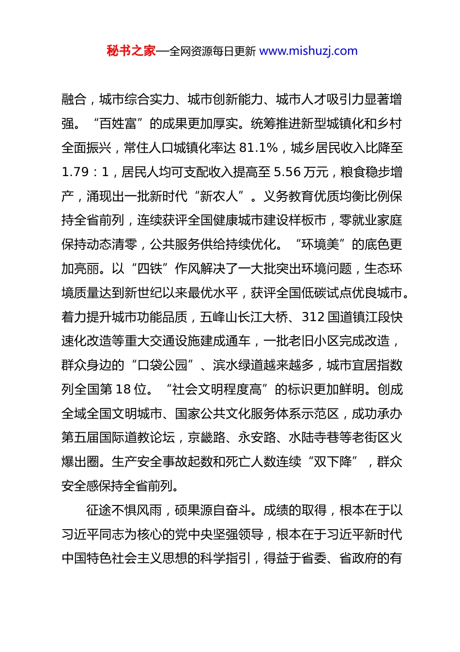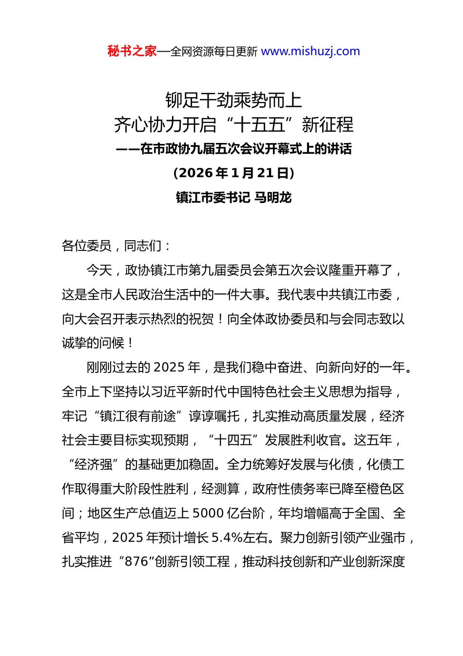 秘书之家—全网资源每日更新 www.mishuzj.com铆足干劲乘势而上齐心协力开启“十五五”新征程——在市政协九届五次会议开幕式上的讲话(2026 年 1 月 21 日)镇江市委书记 马明龙各位委员,同志们:今天,政协镇江市第九届委员会第五次会议隆重开幕了,这是全市人民政治生活中的一件大事。我代表中共镇江市委,向大会召开表示热烈的祝贺!向全体政协委员和与会同志致以诚挚的问候!刚刚过去的 2025 年,是我们稳中奋进、向新向好的一年。全市上下坚持以习近平新时代中国特色社会主义思想为指导,牢记“镇江很有前途”谆谆嘱托,扎实推动高质量发展,经济社会主要目标实现预期,“十四五”发展胜利收官。这五年,“经济强”的基础更加稳固。全力统筹好发展与化债,化债工作取得重大阶段性胜利,经测算,政府性债务率已降至橙色区间;地区生产总值迈上 5000 亿台阶,年均增幅高于全国、全省平均,2025 年预计增长 5.4%左右。聚力创新引领产业强市,扎实推进“876”创新引领工程,推动科技创新和产业创新深度秘书之家—全网资源每日更新 www.mishuzj.com融合,城市综合实力、城市创新能力、城市人才吸引力显著增强。“百姓富”的成果更加厚实。统筹推进新型城镇化和乡村全面振兴,常住人口城镇化率达 81.1%,城乡居民收入比降至1.79:1,居民人均可支配收入提高至 5.56 万元,粮食稳步增产,涌现出一批新时代“新农人”。义务教育优质均衡比例保持全省前列,连续获评全国健康城市建设样板市,零就业家庭保持动态清零,公共服务供给持续优化。“环境美”的底色更加亮丽。以“四铁”作风解决了一大批突出环境问题,生态环境质量达到新世纪以来最优水平,获评全国低碳试点优良城市。着力提升城市功能品质,五峰山长江大桥、312 国道镇江段快速化改造等重大交通设施建成通车,一批老旧小区完成改造,群众身边的“口袋公园”、滨水绿道越来越多,城市宜居指数列全国第 18 位。“社会文明程度高”的标识更加鲜明。创成全域全国文明城市、国家公共文化服务体系示范区,成功承办第五届国际道教论坛,京畿路、永安路、水陆寺巷等老街区火爆出圈。生产安全事故起数和死亡人数连续“双下降”,群众安全感保持全省前列。征途不惧风雨,硕果源自奋斗。成绩的取得,根本在于以习近平同志为核心的党中央坚强领导,根本在于习近平新时代中国特色社会主义思想的科学指引,得益于省委、省政府的有秘书之家—全网资源每日更新 www.mishuzj.com力指导和支持,是全体镇江人民众志成城、苦干实干的结果,也凝结着全市各级政协组织和广大政协委员的智慧、心血和汗水。一年来,全市政协系统深入学习贯彻习近平总书记关于加强和改进人民政协工作的重要思想,持续深化党的建设、建强“两支队伍”,认真履行政治协商、民主监督、参政议政职能,广泛凝聚共识,为推进中国式现代化镇江新实践作出了重要贡献。一是服务发展有高度。构建协商议政新格局,完善“四位一体”提案督办机制,围绕“十五五”发展、高质量充分就业等重大问题议政建言,为市委科学决策、有效施策提供了重要参考。二是为民尽责有温度。建好用好界别委员工作室,深化反映社情民意工作改革,开展民生专题协商议事月活动,深化同心助企行动,彰显了为国履职、为民尽责的情怀。三是凝聚共识有力度。深化“书香政协、同心筑梦”读书学习,举办全面融入长三角一体化发展(上海)座谈会,市政协文史馆建成开放,更好汇聚起牢记嘱托、感恩奋进的强大合力。特别是去年 12 月 15 日,中共中央政治局常委、全国政协主席王沪宁同志亲临市政协机关视察,对政协工作给予充分肯定,让我们深感振奋、深受鼓舞,是对全市政协系统创新履职、奋发作为的巨大褒奖。在此,我代表中共镇江市委,向全市各级政协组织秘书之家—全网资源每日更新 www.mishuzj.com和广大政协委员,向各民主党派、工商联、无党派人士、各人民团体和社会各界人士,表示衷心感谢并致以崇高敬意!各位委员,同志们!山海寻梦,不觉其远;前路迢迢,阔步而行。“十五五”时期是基本实现社会主义现代化夯实基础、全面发力的关键时期,在基本实现社会主义现代化进程中具...