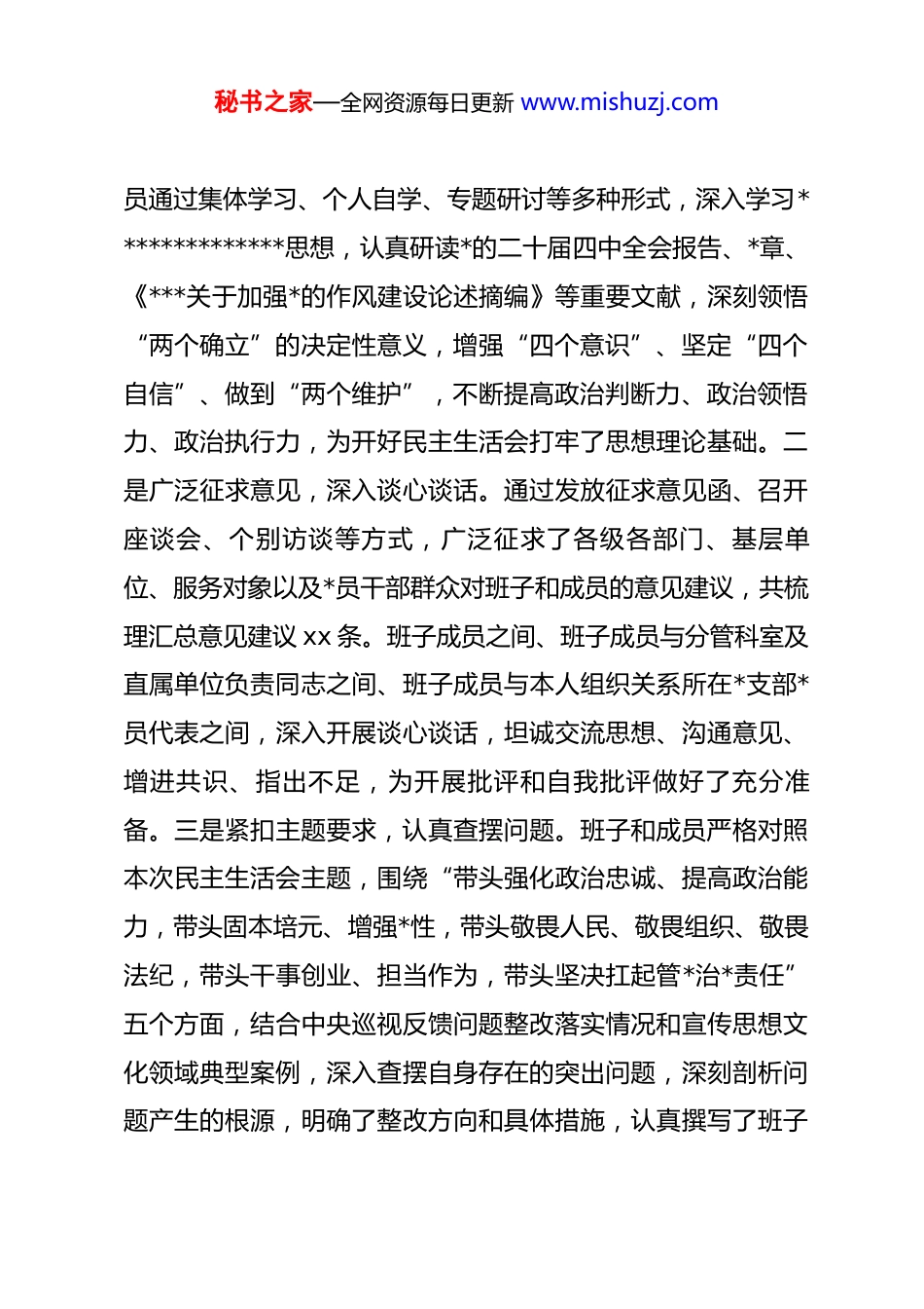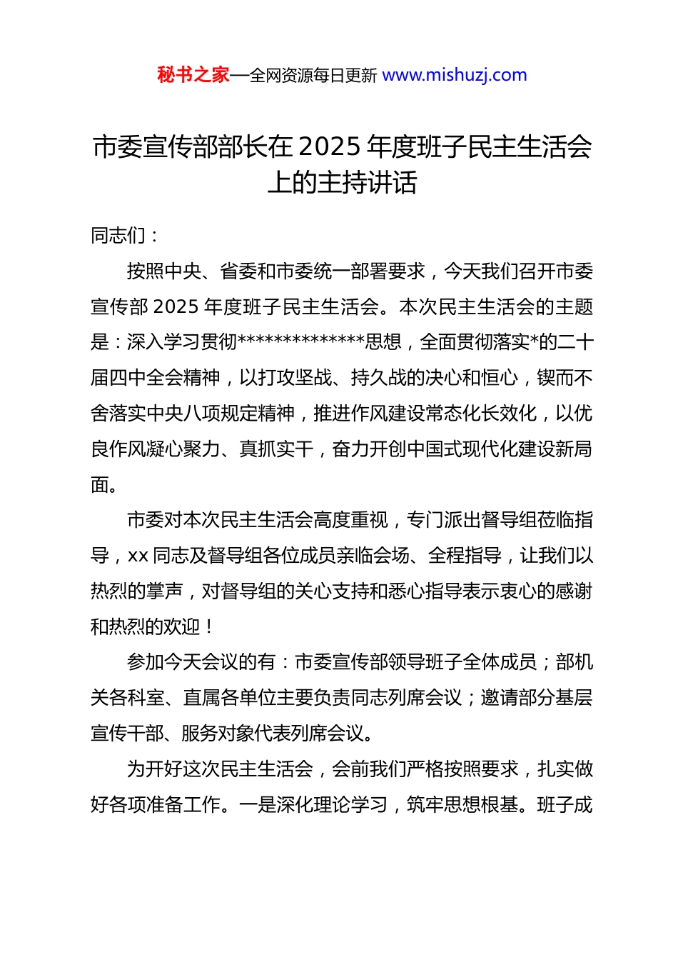 秘书之家—全网资源每日更新 www.mishuzj.com市委宣传部部长在 2025 年度班子民主生活会上的主持讲话同志们:按照中央、省委和市委统一部署要求,今天我们召开市委宣传部 2025 年度班子民主生活会。本次民主生活会的主题是:深入学习贯彻**************思想,全面贯彻落实*的二十届四中全会精神,以打攻坚战、持久战的决心和恒心,锲而不舍落实中央八项规定精神,推进作风建设常态化长效化,以优良作风凝心聚力、真抓实干,奋力开创中国式现代化建设新局面。市委对本次民主生活会高度重视,专门派出督导组莅临指导,xx 同志及督导组各位成员亲临会场、全程指导,让我们以热烈的掌声,对督导组的关心支持和悉心指导表示衷心的感谢和热烈的欢迎!参加今天会议的有:市委宣传部领导班子全体成员;部机关各科室、直属各单位主要负责同志列席会议;邀请部分基层宣传干部、服务对象代表列席会议。为开好这次民主生活会,会前我们严格按照要求,扎实做好各项准备工作。一是深化理论学习,筑牢思想根基。班子成秘书之家—全网资源每日更新 www.mishuzj.com员通过集体学习、个人自学、专题研讨等多种形式,深入学习**************思想,认真研读*的二十届四中全会报告、*章、《***关于加强*的作风建设论述摘编》等重要文献,深刻领悟“两个确立”的决定性意义,增强“四个意识”、坚定“四个自信”、做到“两个维护”,不断提高政治判断力、政治领悟力、政治执行力,为开好民主生活会打牢了思想理论基础。二是广泛征求意见,深入谈心谈话。通过发放征求意见函、召开座谈会、个别访谈等方式,广泛征求了各级各部门、基层单位、服务对象以及*员干部群众对班子和成员的意见建议,共梳理汇总意见建议 xx 条。班子成员之间、班子成员与分管科室及直属单位负责同志之间、班子成员与本人组织关系所在*支部*员代表之间,深入开展谈心谈话,坦诚交流思想、沟通意见、增进共识、指出不足,为开展批评和自我批评做好了充分准备。三是紧扣主题要求,认真查摆问题。班子和成员严格对照本次民主生活会主题,围绕“带头强化政治忠诚、提高政治能力,带头固本培元、增强*性,带头敬畏人民、敬畏组织、敬畏法纪,带头干事创业、担当作为,带头坚决扛起管*治*责任”五个方面,结合中央巡视反馈问题整改落实情况和宣传思想文化领域典型案例,深入查摆自身存在的突出问题,深刻剖析问题产生的根源,明确了整改方向和具体措施,认真撰写了班子秘书之家—全网资源每日更新 www.mishuzj.com对照检查材料和个人发言提纲,确保查摆问题准、根源剖析深、整改措施实。下面,我就开好本次民主生活会,强调三点要求。第一,要提高政治站位,深刻认识民主生活会的重要意义。民主生活会是*内政治生活的重要内容,是发扬*内民主、加强*内监督、依靠领导班子自身力量解决矛盾和问题的重要方式。本次民主生活会是在全面贯彻落实*的二十届四中全会精神、推进中国式现代化建设的关键之年召开的一次重要会议,对于我们加强领导班子自身建设、提升宣传思想文化工作水平、推动作风建设走深走实具有十分重要的意义。班子全体成员要切实提高政治站位,以严肃认真的态度、求真务实的作风,全身心投入到会议中来,真正把会议开成一次统一思想、凝聚共识、增进团结、改进工作的会议,一次锤炼*性、提升能力、担当作为、真抓实干的会议。第二,要坚持问题导向,严肃认真开展批评和自我批评。这是民主生活会的核心环节,也是检验会议质量的关键。希望大家严格按照要求,紧扣主题、聚焦问题,做到“三个摆进去”,即把自己摆进去、把职责摆进去、把工作摆进去。在自我批评时,要本着对*忠诚、对事业负责、对自己严格要求的态度,敢于正视问题、直面不足,深刻剖析问题根源,不回避、秘书之家—全网资源每日更新 www.mishuzj.com不遮掩、不敷衍,真正做到见人见事见思想。要重点围绕五个方面深入查摆:一是在带头强化政治忠诚、提高政治能力方面,是否深刻领悟“两个确立”的决定性意义,坚决做到“两个维护”,是否始终在思想上政治上行动上同以***同志为核心的*中央保持高度一致,是否善于从政治上看问题、办事情,不断提高政治...