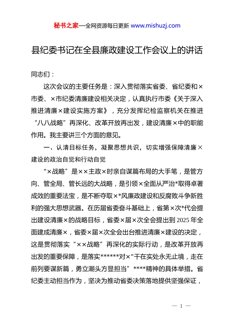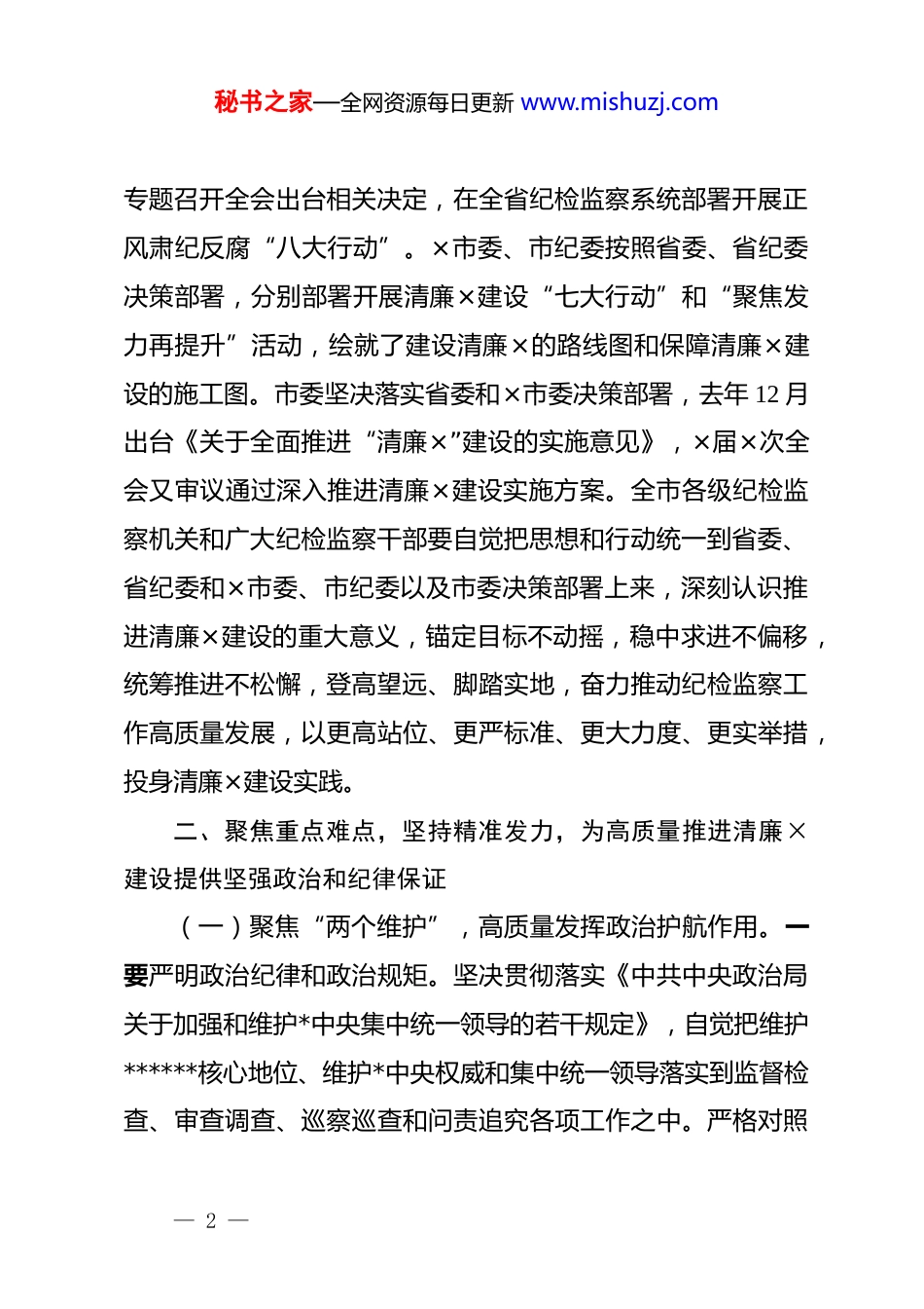 秘书之家—全网资源每日更新 www.mishuzj.com县纪委书记在全县廉政建设工作会议上的讲话同志们:这次会议的主要任务是:深入贯彻落实省委、省纪委和×市委、×市纪委清廉建设相关决定,认真执行市委《关于深入推进清廉×建设实施方案》,充分发挥纪检监察机关在推进“八八战略”再深化、改革开放再出发,建设清廉×中的职能作用。我主要讲三个方面的意见。一、认清目标任务,凝聚思想共识,切实增强保障清廉×建设的政治自觉和行动自觉“×战略”是××主政×时亲自谋篇布局的大手笔,是管方向、管全局、管长远的大战略,是引领×全面从严治*取得卓著成效的重要法宝,是不断夺取×*风廉政建设和反腐败斗争新胜利的强大思想武器。在历届省委奋斗基础上,省第×次*代会提出建设清廉×的战略目标,省委×届×次全会提出到 2025 年全面建成清廉×,省委×届×次全会出台推进清廉×建设的决定,这是贯彻落实“××战略”再深化的实际行动,是改革开放再出发的重要保障,是落实******对ד干在实处永无止境,走在前列要谋新篇,勇立潮头方显担当”****精神的具体举措。省纪委主动担当作为,坚决为推动省委决策落地提供坚强保证,— 1 —秘书之家—全网资源每日更新 www.mishuzj.com专题召开全会出台相关决定,在全省纪检监察系统部署开展正风肃纪反腐“八大行动”。×市委、市纪委按照省委、省纪委决策部署,分别部署开展清廉×建设“七大行动”和“聚焦发力再提升”活动,绘就了建设清廉×的路线图和保障清廉×建设的施工图。市委坚决落实省委和×市委决策部署,去年 12 月出台《关于全面推进“清廉×”建设的实施意见》,×届×次全会又审议通过深入推进清廉×建设实施方案。全市各级纪检监察机关和广大纪检监察干部要自觉把思想和行动统一到省委、省纪委和×市委、市纪委以及市委决策部署上来,深刻认识推进清廉×建设的重大意义,锚定目标不动摇,稳中求进不偏移,统筹推进不松懈,登高望远、脚踏实地,奋力推动纪检监察工作高质量发展,以更高站位、更严标准、更大力度、更实举措,投身清廉×建设实践。二、聚焦重点难点,坚持精准发力,为高质量推进清廉×建设提供坚强政治和纪律保证(一)聚焦“两个维护”,高质量发挥政治护航作用。一要严明政治纪律和政治规矩。坚决贯彻落实《中共中央政治局关于加强和维护*中央集中统一领导的若干规定》,自觉把维护******核心地位、维护*中央权威和集中统一领导落实到监督检查、审查调查、巡察巡查和问责追究各项工作之中。严格对照— 2 —秘书之家—全网资源每日更新 www.mishuzj.com“七个有之”“五个必须”,对违反*章*规、违背*的政治路线、破坏政治纪律政治规矩问题保持条件反射和“零容忍”,坚决清除对*不忠诚老实、阳奉阴违的“两面人”“两面派”,督促全市上下始终在思想上政治上行动上同以***同志为核心的*中央保持高度一致。二要全面净化*内政治生态。深化政治生态“画像”工作,全面开展*内政治生态建设动态分析研判,构建政治生态建设评估、监督报告、修复净化相互衔接、良性循环工作机制。严肃*内政治生活,加强对《新形势下*内政治生活若干准则》执行情况的监督检查,着力增强政治性、时代性、原则性、战斗性。发展积极健康的*内政治文化,倡导清清爽爽、规规矩矩、老老实实的同志关系。严把选人用人政治关、廉洁关、形象关,严把*风廉政意见回复关。三要压紧压实“两个责任”。牢牢牵住主体责任“牛鼻子”,督促各级*委(*组)健全主抓直管机制,运用好“两个责任”督考平台,防止责任落实形式化、表面化、被动化。用好问责利器,对*的领导弱化、*的建设缺失、全面从严治*责任落实不到位,维护*的政治纪律和政治规矩失责、贯彻中央八项规定精神不力、选人用人问题突出、腐败问题严重、不作为乱作为的,开展“一案双查”,既追究主体责任、监督责任,也追究领导责任。四要保障落实重大决策部署。围绕市委重大决策部署和重要任务,加大监督— 3 —秘书之家—全网资源每日更新 www.mishuzj.com检查、执纪执法、问责曝光力度,严肃查处选择性落实、象征性执行,甚至“逆向行驶”、自行其是等行为,确保政令畅通...