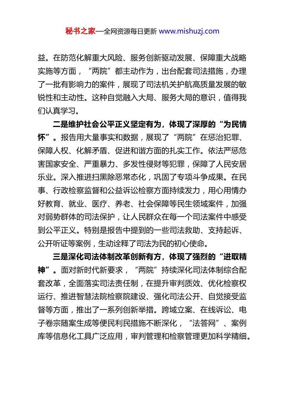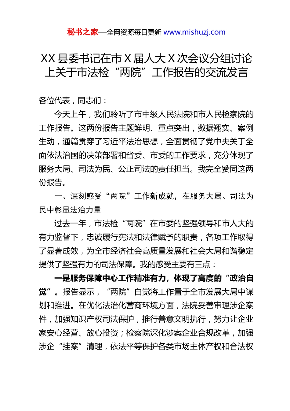 秘书之家—全网资源每日更新 www.mishuzj.comXX 县委书记在市 X 届人大 X 次会议分组讨论上关于市法检“两院”工作报告的交流发言各位代表,同志们:今天上午,我们聆听了市中级人民法院和市人民检察院的工作报告。这两份报告主题鲜明、重点突出,数据翔实、案例生动,通篇贯穿了习近平法治思想,全面贯彻了党中央关于全面依法治国的决策部署和省委、市委的工作要求,充分体现了服务大局、司法为民、公正司法的责任担当。我完全赞同这两份报告。一、深刻感受“两院”工作新成就,在服务大局、司法为民中彰显法治力量过去一年,市法检“两院”在市委的坚强领导和市人大的有力监督下,忠诚履行宪法和法律赋予的职责,各项工作取得了显著成效,为全市经济社会高质量发展和社会大局和谐稳定提供了坚强有力的司法保障。我的感受主要有三点:一是服务保障中心工作精准有力,体现了高度的“政治自觉”。报告显示,“两院”自觉将工作置于全市发展大局中谋划和推进。在优化法治化营商环境方面,法院妥善审理涉企案件,加强知识产权司法保护,推行善意文明执行,努力让企业家安心经营、放心投资;检察院深化涉案企业合规改革,加强涉企“挂案”清理,依法平等保护各类市场主体产权和合法权秘书之家—全网资源每日更新 www.mishuzj.com益。在防范化解重大风险、服务创新驱动发展、保障重大战略实施等方面,“两院”都主动作为,出台配套司法措施,办理了一批有影响力的案件,展现了司法机关护航高质量发展的敏锐性和主动性。这种自觉融入大局、服务大局的意识,值得我们认真学习。二是维护社会公平正义坚定有为,体现了深厚的“为民情怀”。报告用大量事实和数据,展现了“两院”在惩治犯罪、保障人权、化解矛盾、促进和谐方面的扎实工作。依法严惩危害国家安全、严重暴力、多发性侵财等犯罪,保障了人民安居乐业。深入推进扫黑除恶常态化,巩固了专项斗争成果。在民事、行政检察监督和公益诉讼检察方面持续发力,用心用情办好教育、就业、医疗、养老、社会保障等民生领域案件,加强对弱势群体的司法保护,让人民群众在每一个司法案件中感受到公平正义。特别是报告中提到的一些司法救助、支持起诉、公开听证等案例,生动诠释了司法为民的初心使命。三是深化司法体制改革创新有方,体现了强烈的“进取精神”。面对新时代新要求,“两院”持续深化司法体制综合配套改革,全面落实司法责任制,在提升审判质效、优化检察权运行、推进智慧法院检察院建设、强化司法公开、自觉接受监督等方面,推出了一系列创新举措。跨域立案、在线诉讼、电子卷宗随案生成等便民利民措施不断深化,“法答网”、案例库等信息化工具广泛应用,审判管理和检察管理更加科学精细。秘书之家—全网资源每日更新 www.mishuzj.com这些改革有效促进了司法公正与效率的统一,推动了司法公信力的持续提升。二、紧密结合 XX 县实际,在学习贯彻、落地见效中谋划法治新篇市“两院”工作报告不仅是对过去工作的总结,更是对今年全市法治建设的规划部署。为我们县级层面做好法治保障工作指明了方向、提供了遵循。我们将认真学习领会报告精神,结合 XX 县实际,坚决抓好贯彻落实,重点在以下几个方面下功夫:(一)着力在优化法治化营商环境上协同发力,护航县域经济高质量发展。发展是硬道理,法治是硬保障。我们将积极支持县法院、检察院依法履职,聚焦县委确定的“产业升级、项目攻坚”等中心任务,共同营造稳定公平透明、可预期的法治化营商环境。一是支持法院依法妥善处理涉企合同纠纷、产权纠纷、劳动争议等案件,慎用查封、扣押、冻结等强制措施,最大限度减少司法活动对企业正常生产经营的影响。二是配合检察院深化涉案企业合规改革,对符合条件的涉罪企业,督促其作出合规承诺并积极整改,促进企业守法经营、健康发展。三是建立健全常态化府院联动、府检联动机制,定期通报涉企司法情况,协同化解重大涉企矛盾纠纷和潜在风险。四是加强知识产权司法保护,服务我县特色产业、科技创新企业发展,激发市场活力和社会创造力。秘书之家—全网资源每日更新 www.mishuzj.com(二)着力在深化基层社会治理上协同发力,...