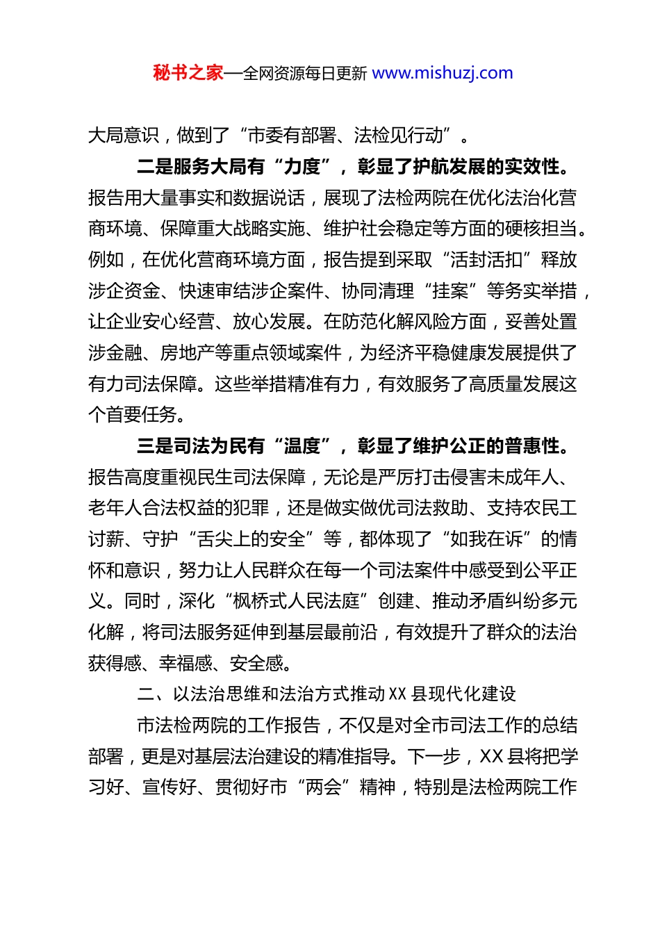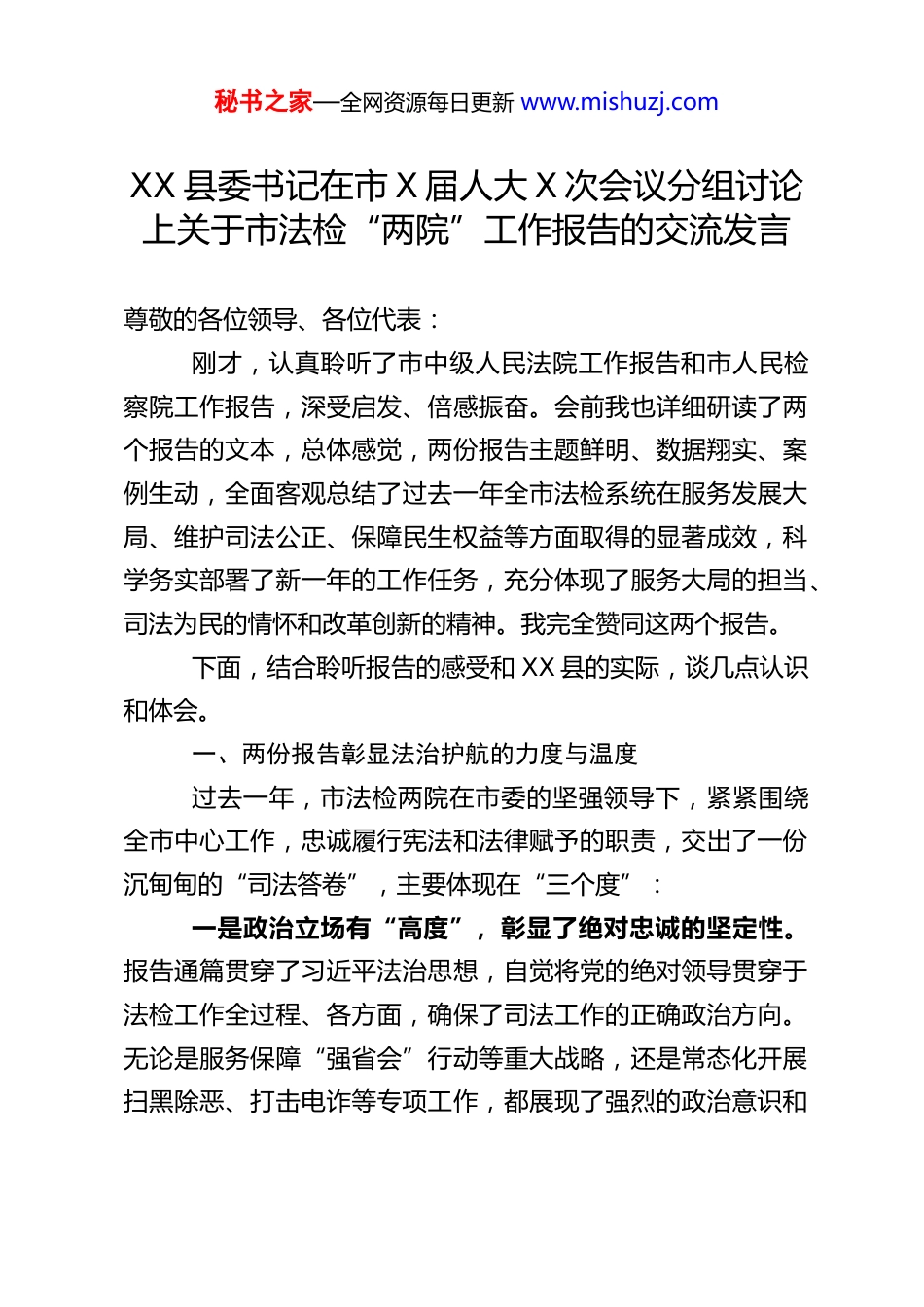 秘书之家—全网资源每日更新 www.mishuzj.comXX 县委书记在市 X 届人大 X 次会议分组讨论上关于市法检“两院”工作报告的交流发言尊敬的各位领导、各位代表:刚才,认真聆听了市中级人民法院工作报告和市人民检察院工作报告,深受启发、倍感振奋。会前我也详细研读了两个报告的文本,总体感觉,两份报告主题鲜明、数据翔实、案例生动,全面客观总结了过去一年全市法检系统在服务发展大局、维护司法公正、保障民生权益等方面取得的显著成效,科学务实部署了新一年的工作任务,充分体现了服务大局的担当、司法为民的情怀和改革创新的精神。我完全赞同这两个报告。下面,结合聆听报告的感受和 XX 县的实际,谈几点认识和体会。一、两份报告彰显法治护航的力度与温度过去一年,市法检两院在市委的坚强领导下,紧紧围绕全市中心工作,忠诚履行宪法和法律赋予的职责,交出了一份沉甸甸的“司法答卷”,主要体现在“三个度”:一是政治立场有“高度”,彰显了绝对忠诚的坚定性。报告通篇贯穿了习近平法治思想,自觉将党的绝对领导贯穿于法检工作全过程、各方面,确保了司法工作的正确政治方向。无论是服务保障“强省会”行动等重大战略,还是常态化开展扫黑除恶、打击电诈等专项工作,都展现了强烈的政治意识和秘书之家—全网资源每日更新 www.mishuzj.com大局意识,做到了“市委有部署、法检见行动”。二是服务大局有“力度”,彰显了护航发展的实效性。报告用大量事实和数据说话,展现了法检两院在优化法治化营商环境、保障重大战略实施、维护社会稳定等方面的硬核担当。例如,在优化营商环境方面,报告提到采取“活封活扣”释放涉企资金、快速审结涉企案件、协同清理“挂案”等务实举措,让企业安心经营、放心发展。在防范化解风险方面,妥善处置涉金融、房地产等重点领域案件,为经济平稳健康发展提供了有力司法保障。这些举措精准有力,有效服务了高质量发展这个首要任务。三是司法为民有“温度”,彰显了维护公正的普惠性。报告高度重视民生司法保障,无论是严厉打击侵害未成年人、老年人合法权益的犯罪,还是做实做优司法救助、支持农民工讨薪、守护“舌尖上的安全”等,都体现了“如我在诉”的情怀和意识,努力让人民群众在每一个司法案件中感受到公平正义。同时,深化“枫桥式人民法庭”创建、推动矛盾纠纷多元化解,将司法服务延伸到基层最前沿,有效提升了群众的法治获得感、幸福感、安全感。二、以法治思维和法治方式推动 XX 县现代化建设市法检两院的工作报告,不仅是对全市司法工作的总结部署,更是对基层法治建设的精准指导。下一步,XX 县将把学习好、宣传好、贯彻好市“两会”精神,特别是法检两院工作秘书之家—全网资源每日更新 www.mishuzj.com报告精神作为一项重要政治任务,找准结合点、发力点,切实把报告要求转化为推动 XX 县法治建设和高质量发展的具体行动和实际成效。(一)在服务发展大局上同频共振,以更优法治环境保障高质量发展。我们将紧紧围绕县委中心工作,引导和支持县法检两院聚焦经济建设这一中心工作,为县域发展提供坚实法治保障。一是持续优化营商环境。落实报告关于优化法治化营商环境的部署,借鉴市里“标红走绿”等机制,推动县法院、检察院在涉企案件办理上再提速、再增效。深化“法官服务站”、“检察护企联络站”建设,常态化开展“法治体检”、送法进企业等活动,精准对接企业司法需求,特别是加强对中小微企业的法律指导和服务,依法保护各类市场主体合法权益。严厉打击侵害企业合法权益的犯罪,同时审慎适用强制措施,最大限度减少司法活动对企业正常生产经营的影响。二是保障重大战略实施。围绕我县项目突围、工业突破、文旅跃升等“六大工程”,主动提供司法服务和保障。例如,在重大项目建设和征地拆迁中,提前介入提供法律风险研判;在保护知识产权方面,支持法检两院发挥职能,激发创新活力,服务新质生产力发展;在文旅融合发展方面,借鉴设立“文旅法庭”等经验,保障我县旅游市场健康有序。三是维护安全稳定局面。支持法检两院依法惩治各类犯秘书之家—全网资源每日更新 www.mishuzj.com罪行为,常态化推进扫黑...